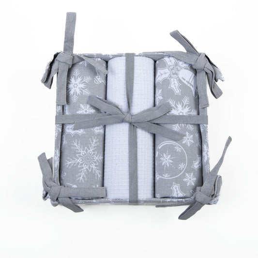 4 Piece Neutral Snowflake Tea Towel & Bread Basket Set