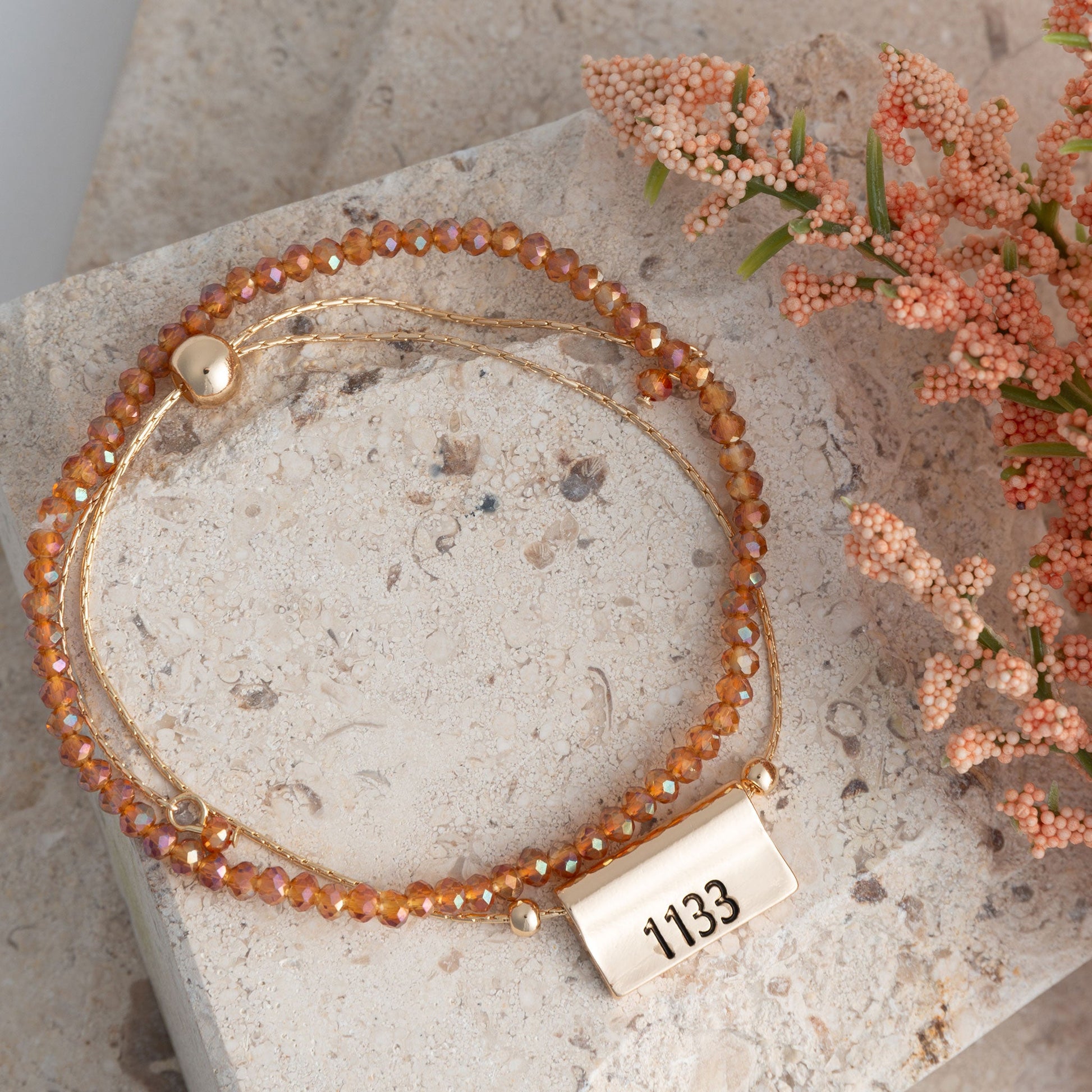 Elevate your spiritual journey with the 1133 Hope Angel Numbers Bracelet Set. Featuring two bracelets, one dainty and golden and stamped with the Angel numbers for Hope, the other a trendy apricot colored beaded band, this pair brings style and meaning to any outfit.