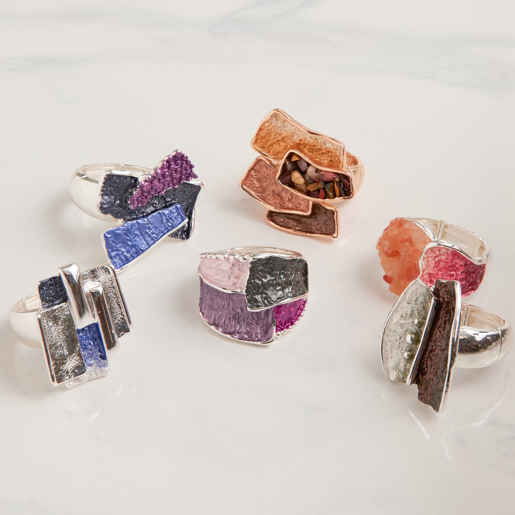Create an effortlessly whimsical look with the 12 Piece Penelope Enamel Statement Ring Assortment. Featuring enamel stretch statement rings in a variety of colors for any style, these pieces are sure to make a statement.