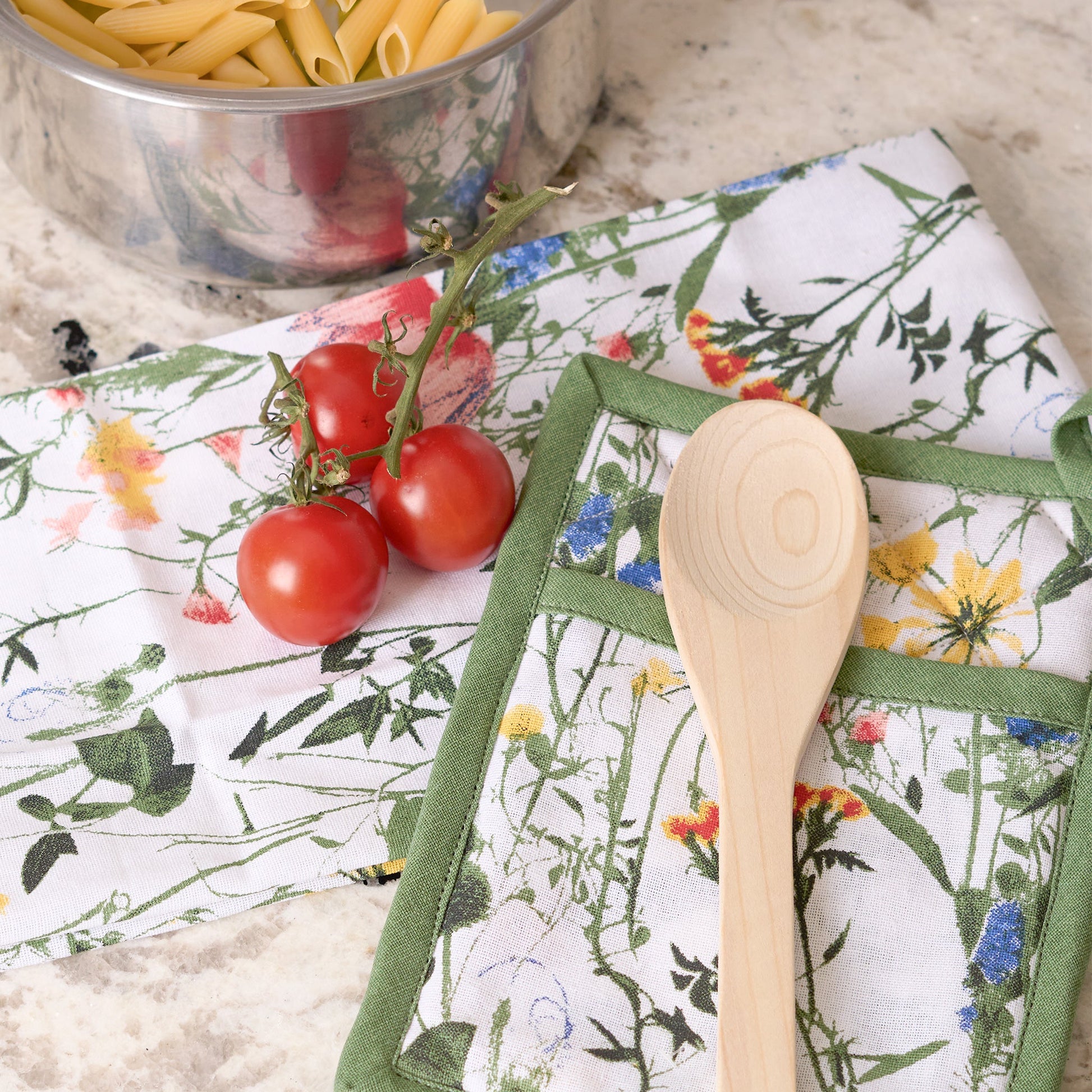 Cute and practical, the 3-Piece Spring Meadow Kitchen Set features gorgeous matching potholder and tea towel, and classic wooden spoon. The perfect gift for everything from a house warming to the holidays, this set helps make a house a home.
