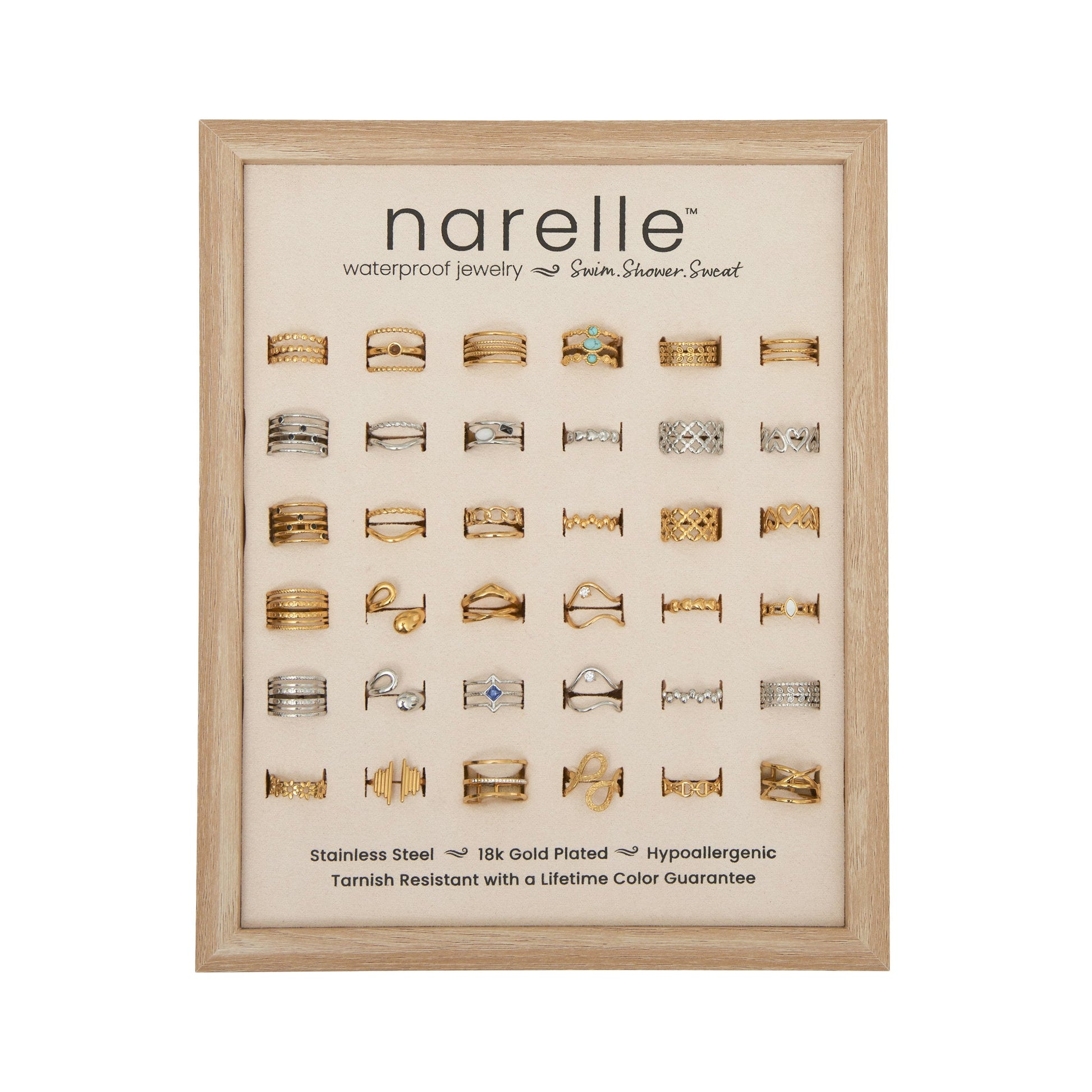 Elevate your retail offering with the Narelle Waterproof Ring Display, a premium assortment of 36 curated waterproof rings designed for durability and everyday wear. This ring collection features 24 pieces of 18k gold-plated rings and 12 pieces of stainless steel rings, offering your customers a balanced mix of timeless gold tones and sleek silver finishes.