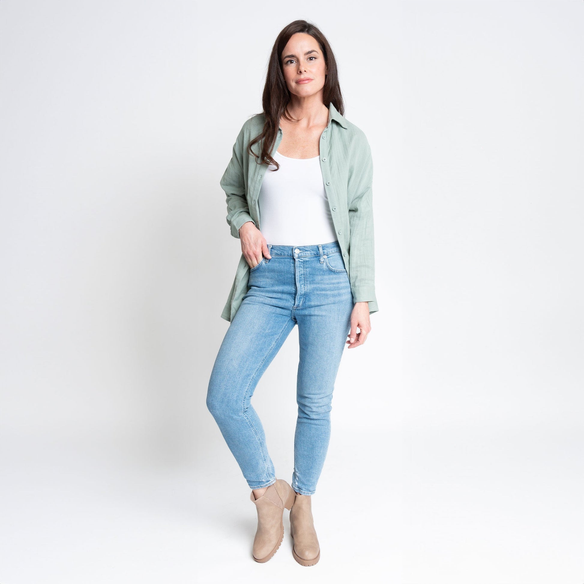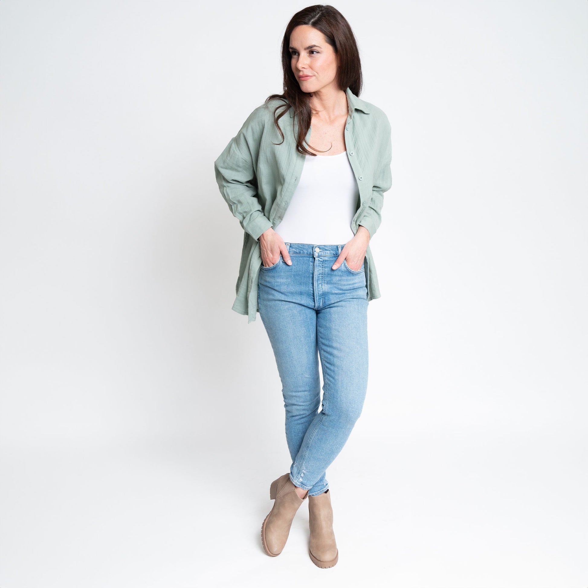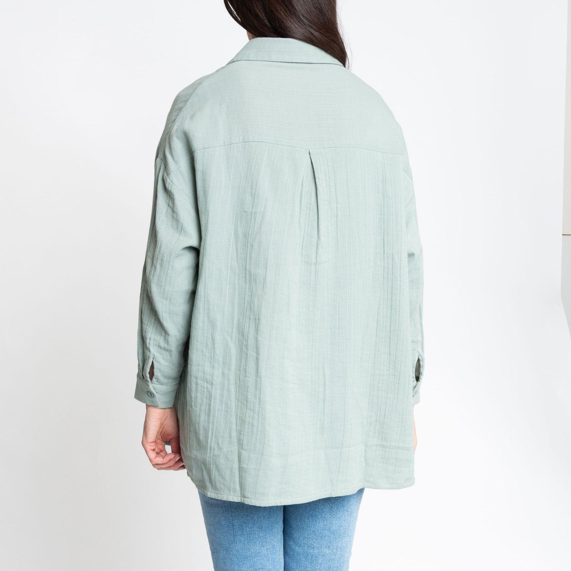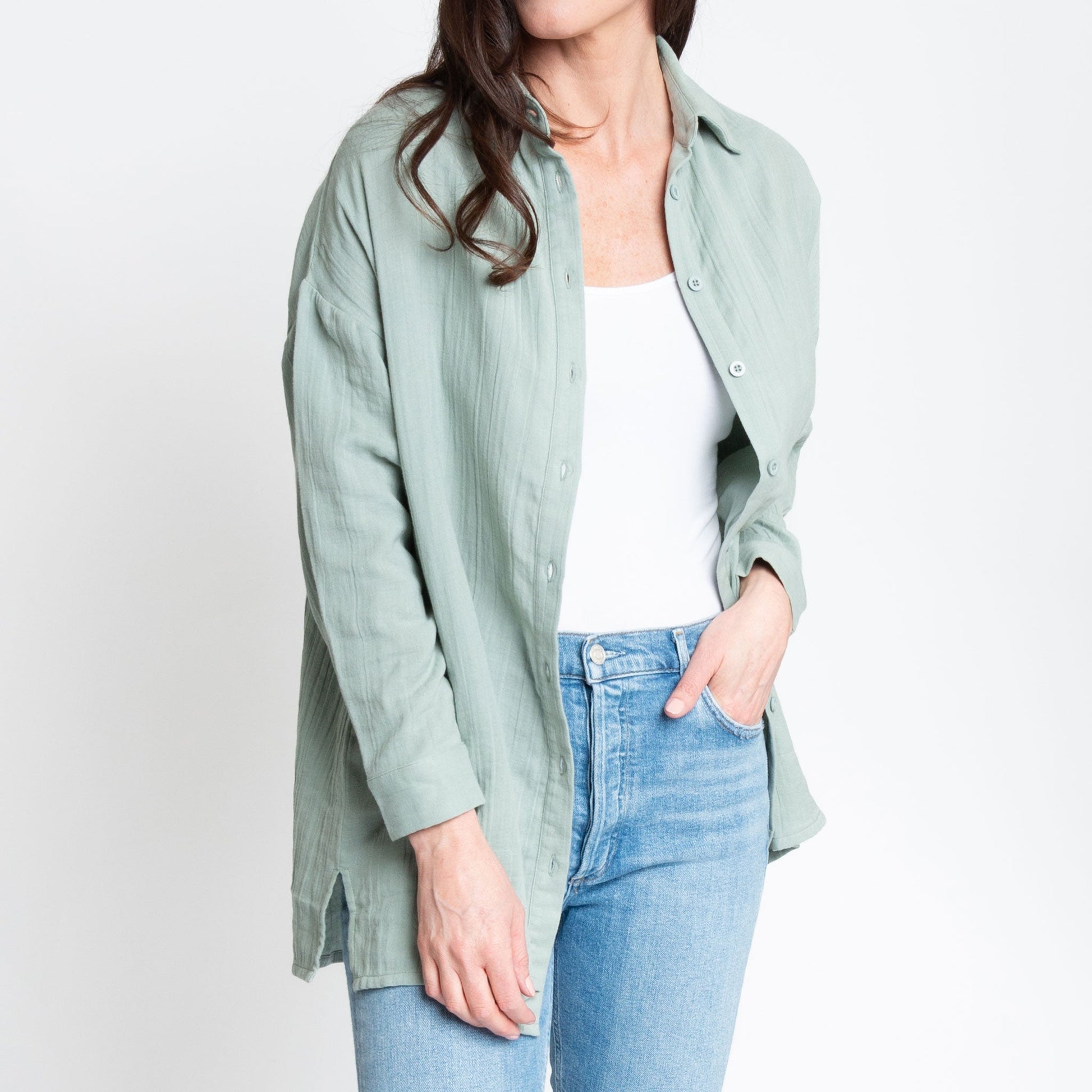 The Aaliyah Gauze Button Up Top features a gorgeous icy green tone in an on-trend oversized fit, making it a versatile piece which can be worn as a beach cover up or as a trendy shacket style top.