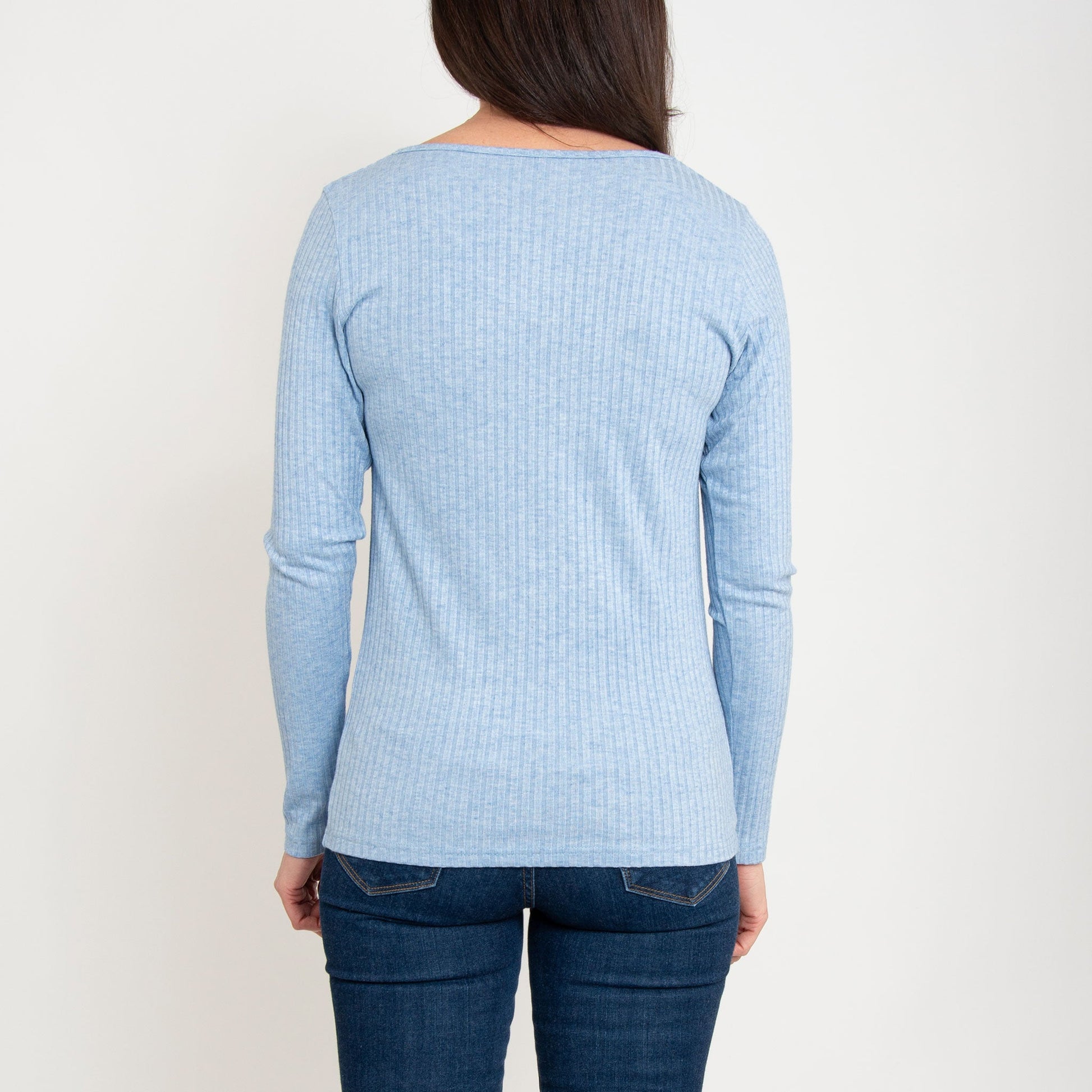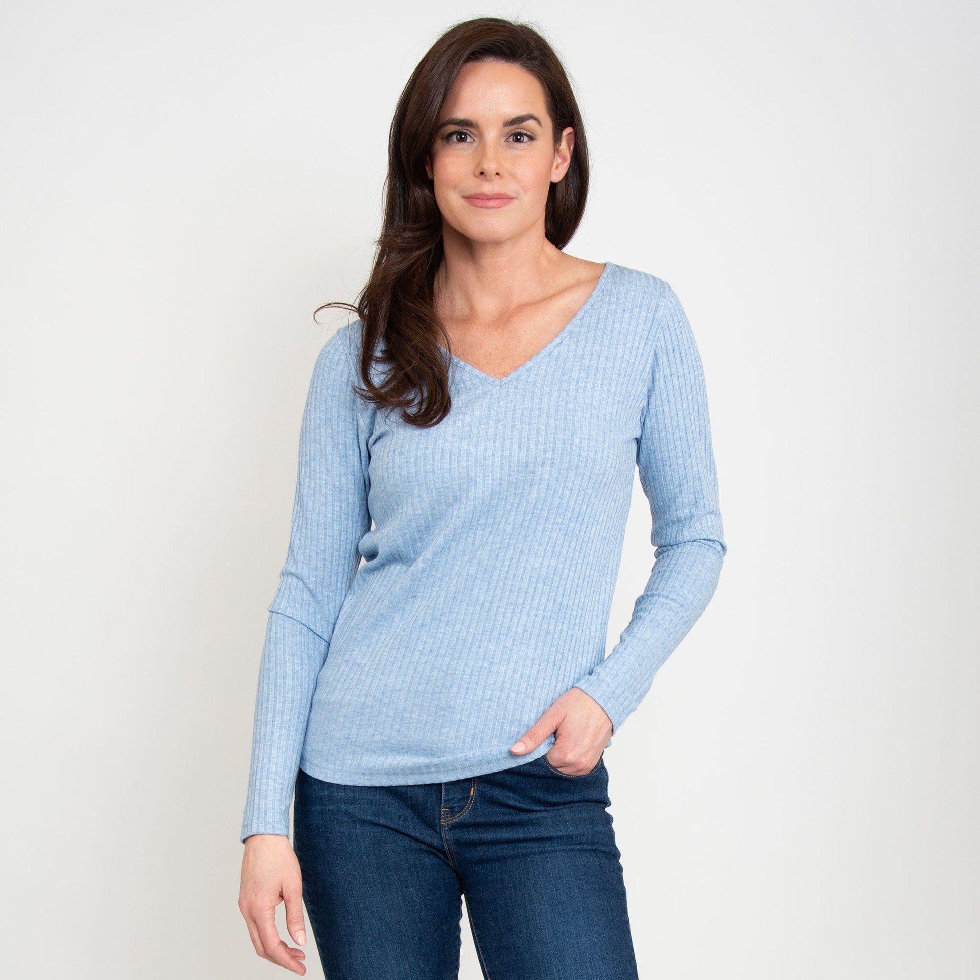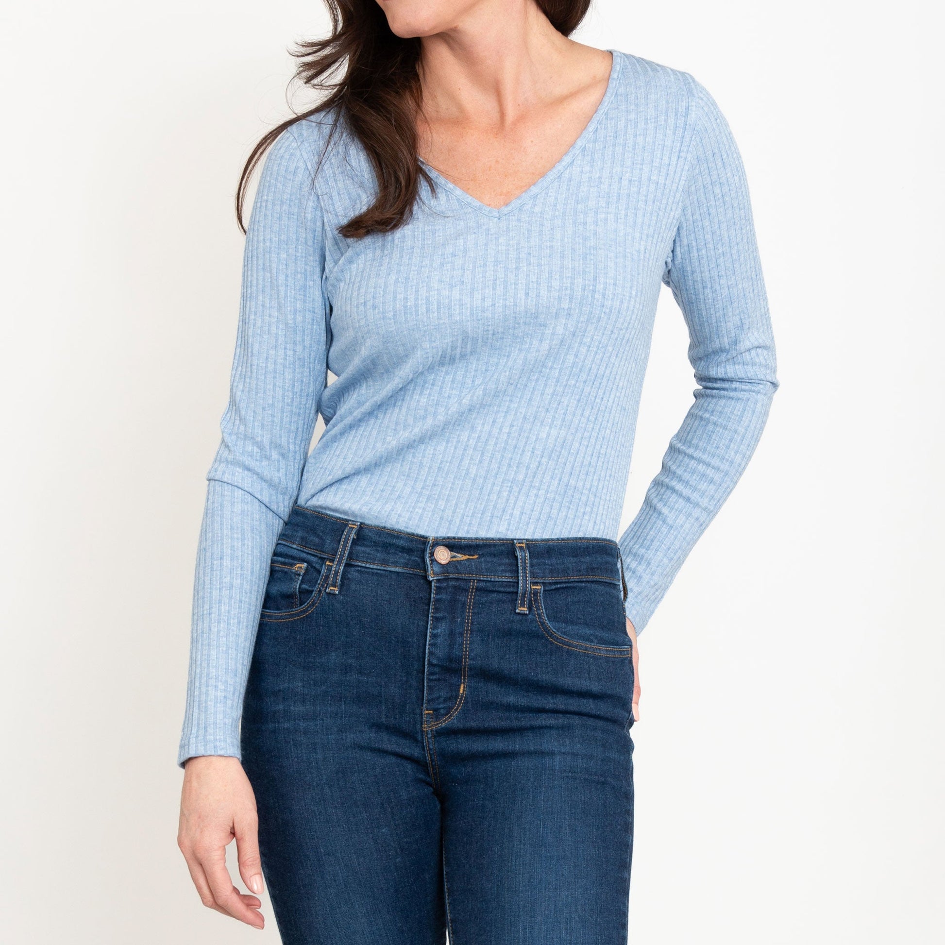 A wardrobe staple, the Alba Ribbed Long Sleeve Top features a trendy ice blue hue with stylish v-neck and classic silhouette. Lightweight and easy to wear, this top goes with everything!