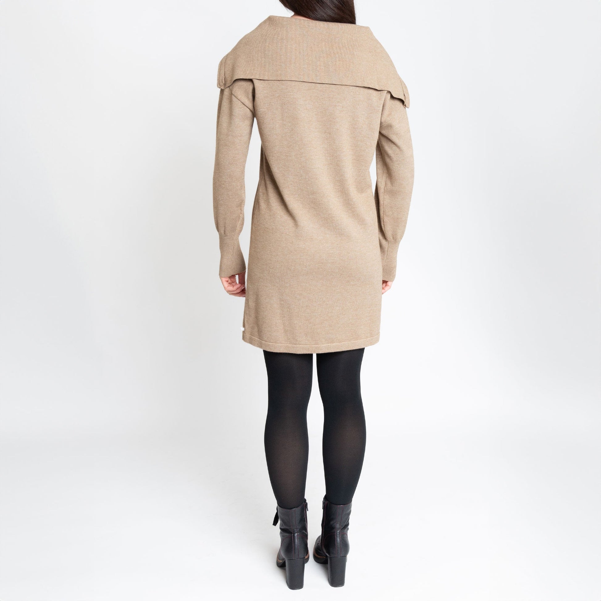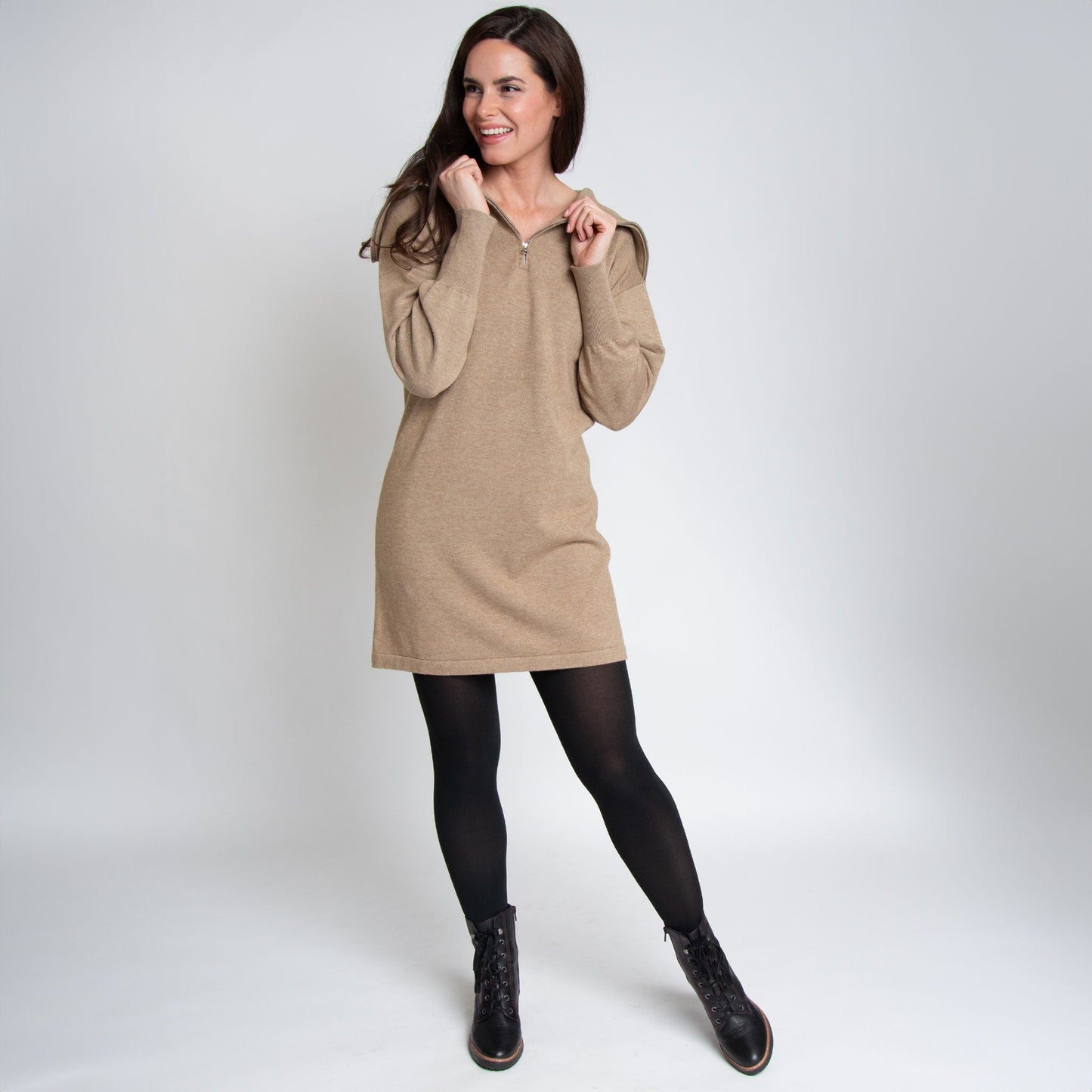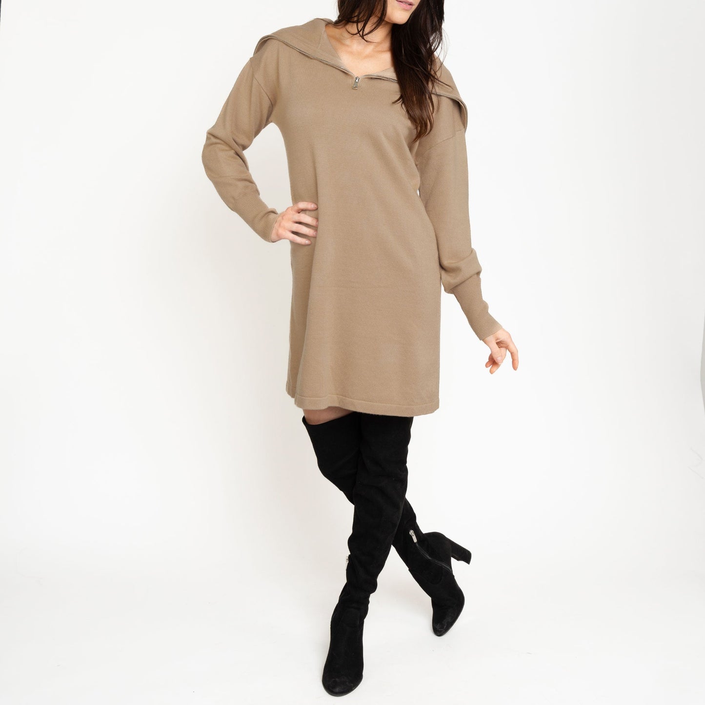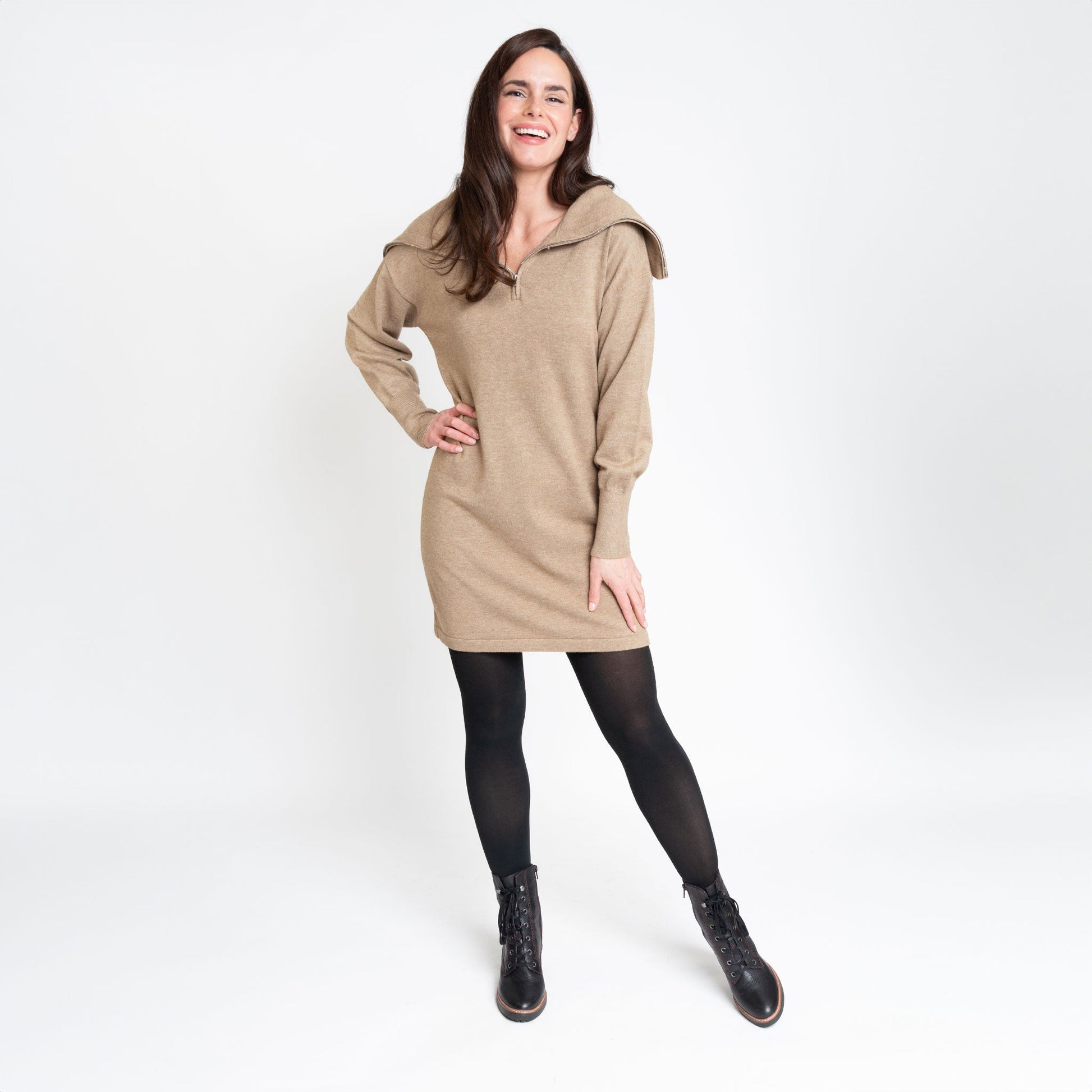 Cozy and cute! Featuring a fun oversized collar and long sleeves, the Alessia Quarter Zip Sweatshirt Dress is a cold weather dream in a chic taupe color and the perfect piece for everything from the office to date night.