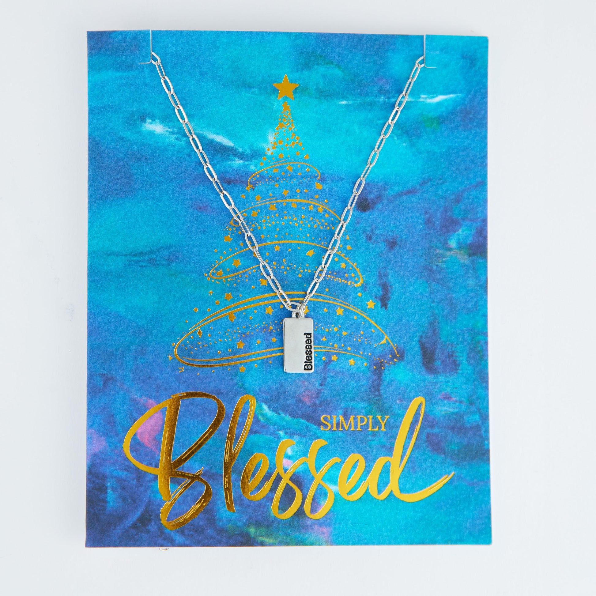 So lovely and sweet, the Amira Simply Blessed Greeting Card Necklace features an elegant pendant with the word 'Blessed' etched into it on a delicate chain. Packaged on a vibrant watercolor card also emblazoned with the phrase 'Simply Blessed', this necklace makes for a thoughtful, meaningful gift.
