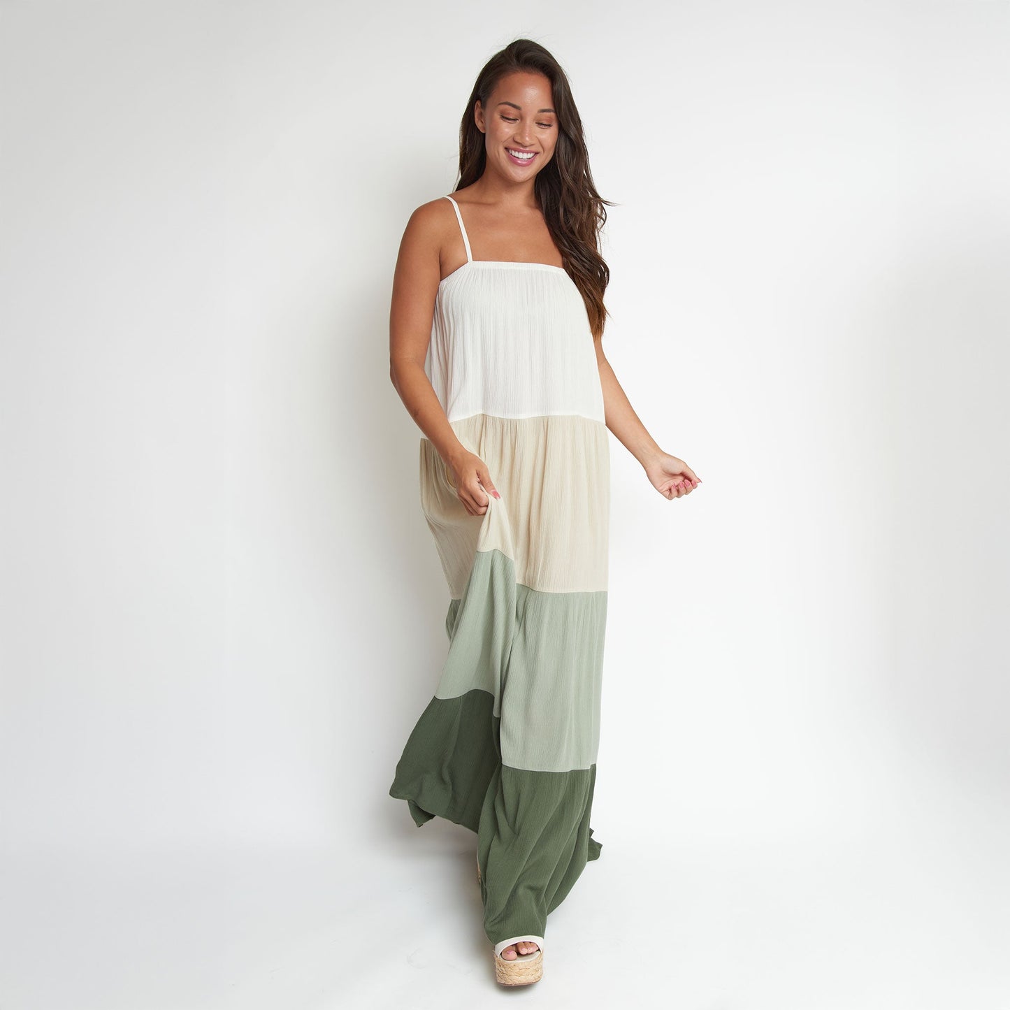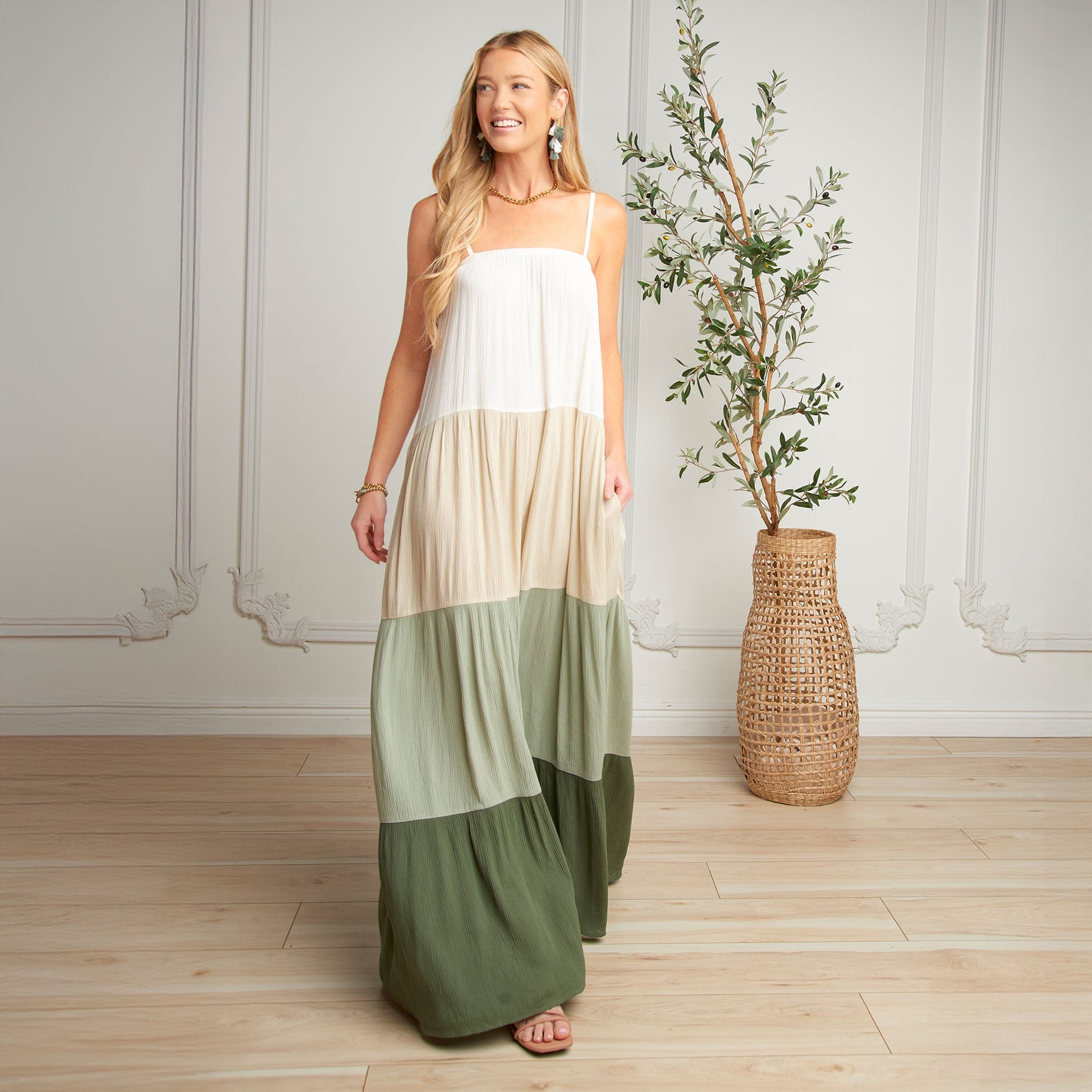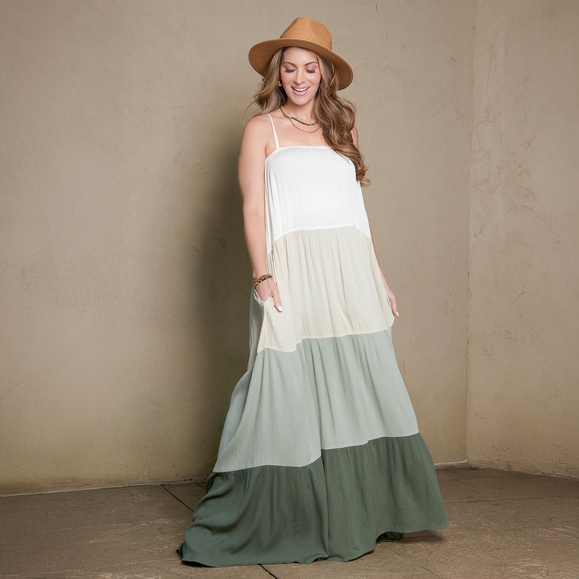 The perfect summer dress! Featuring a stunning color block in shades of sage green in a lightweight crepe fabric with side pockets and adjustable straps, the Amryn Color Block Tiered Maxi Dress is breezy, easy to wear, and so fun!