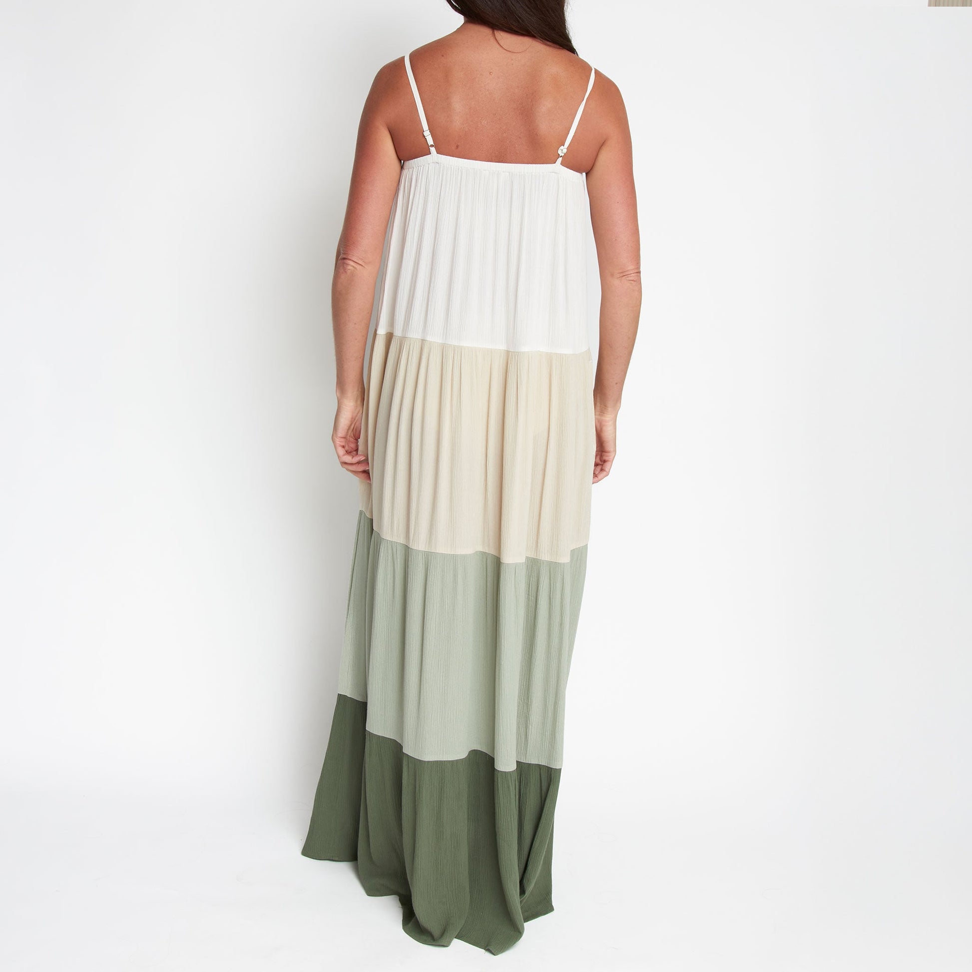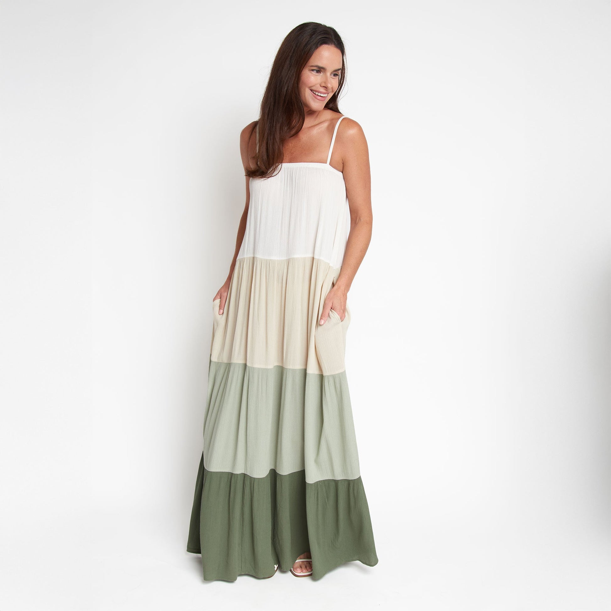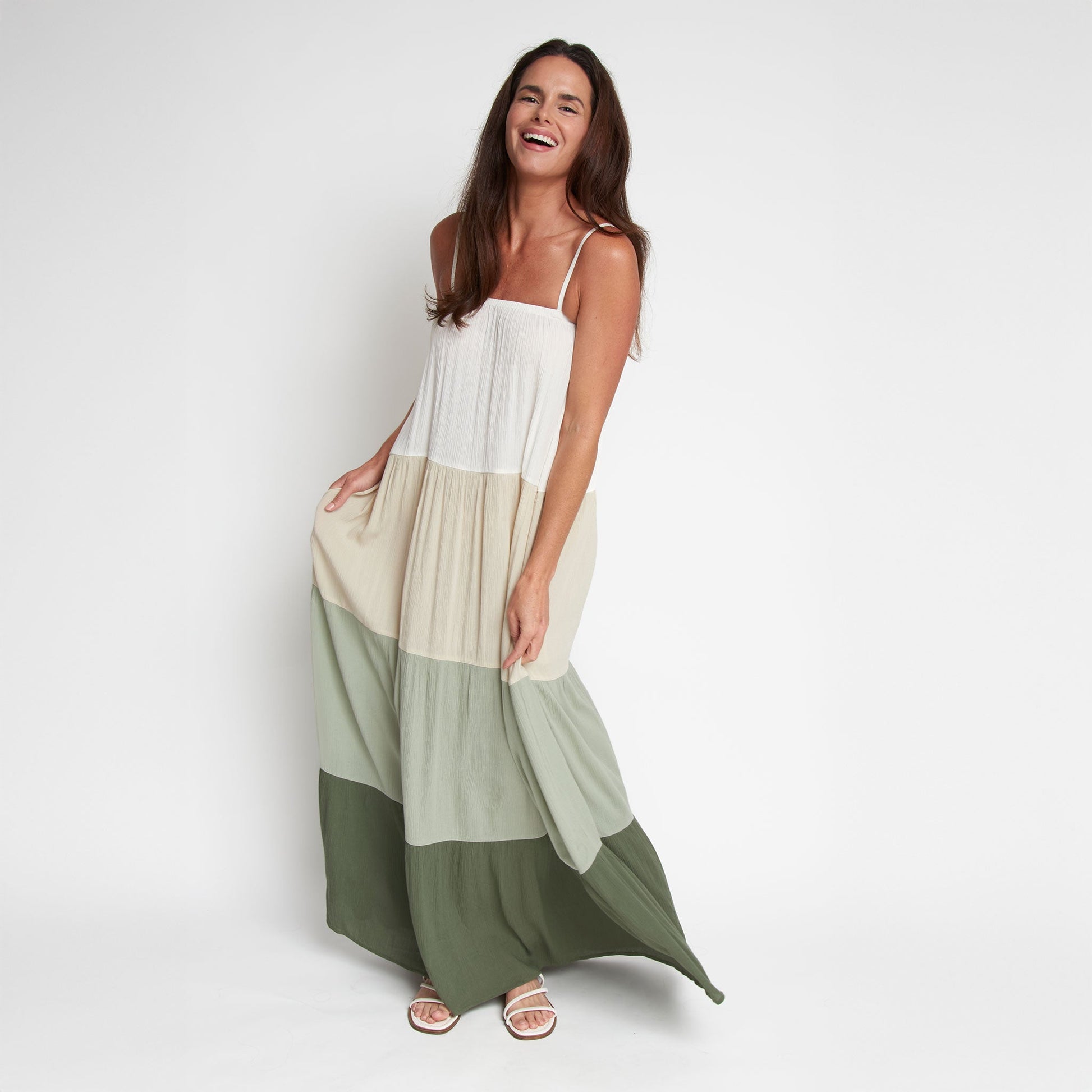 The perfect summer dress! Featuring a stunning color block in shades of sage green in a lightweight crepe fabric with side pockets and adjustable straps, the Amryn Color Block Tiered Maxi Dress is breezy, easy to wear, and so fun!