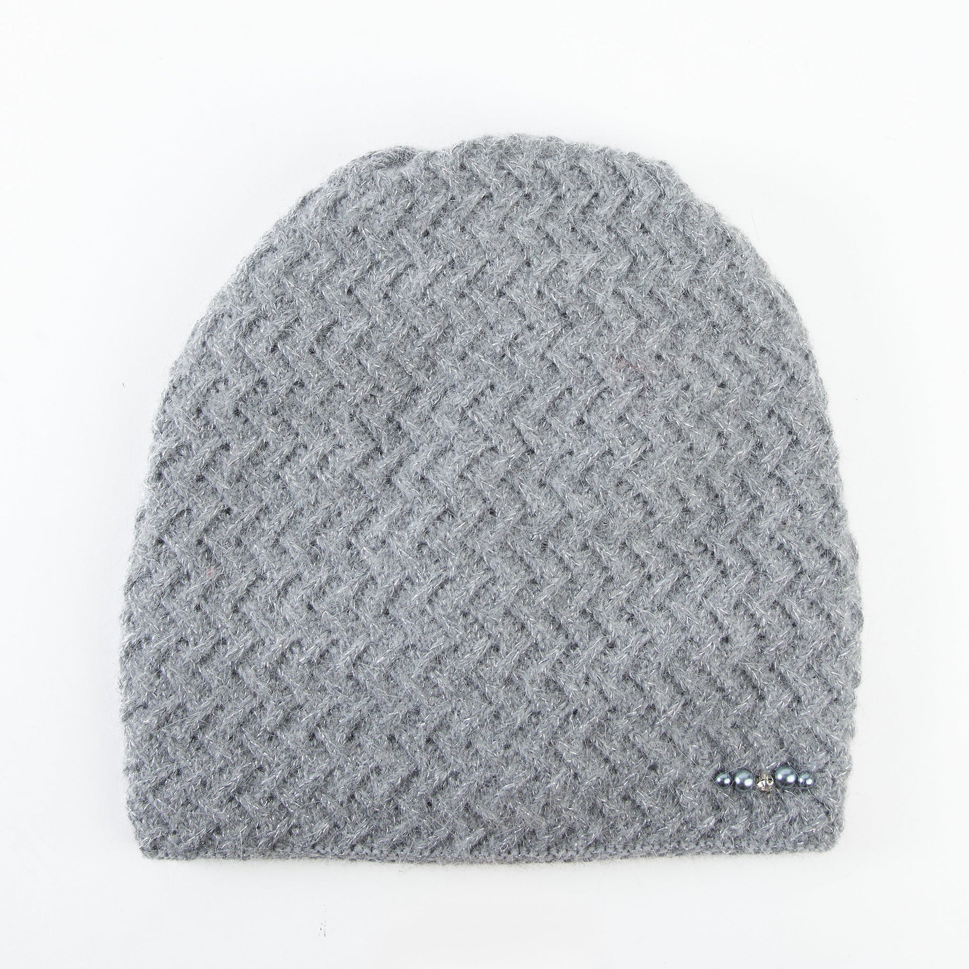 Stay warm in style with the Andi Wool Blend Beanie. With a hip slouchy design, adorable herringbone and pearl detailing, and extra cozy wool-blend material, this is the only hat you'll need this winter season.