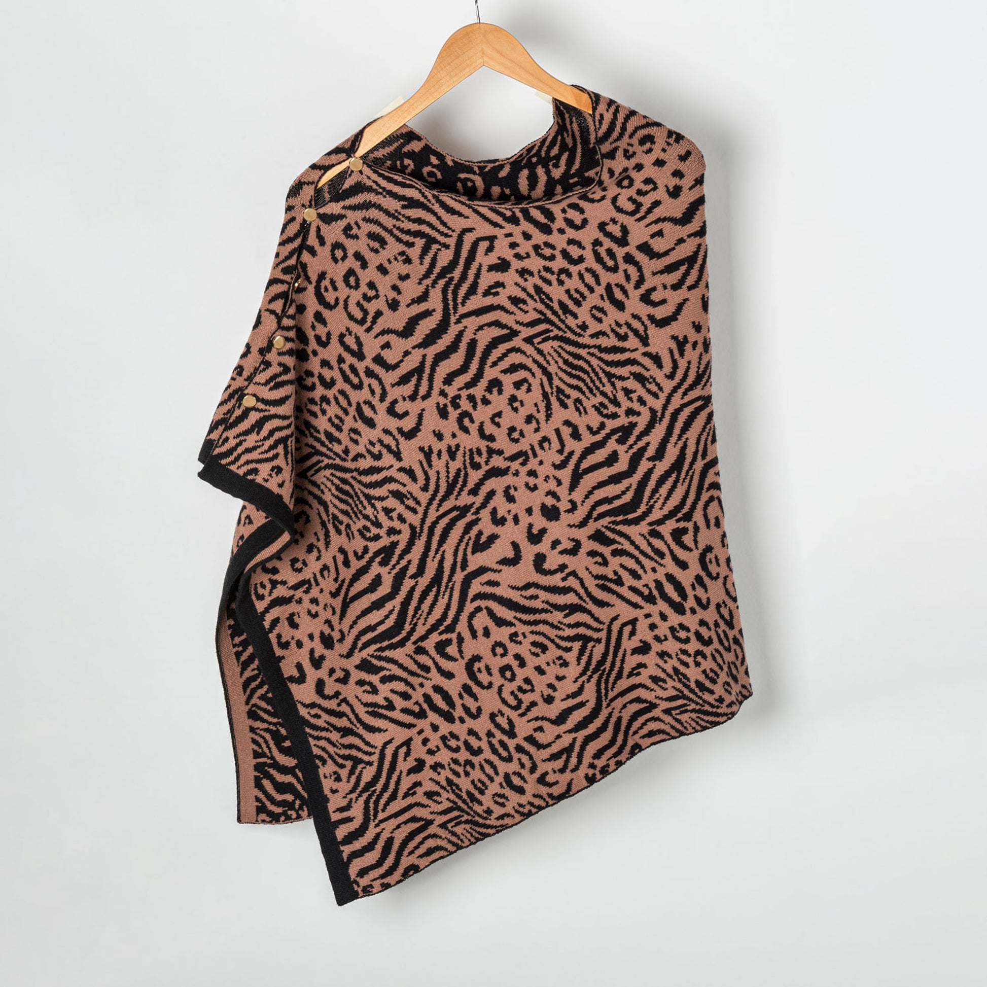 | This reversible poncho makes a bold entrance thanks to the drama of the animal print and striking gold button accents! Reach for this cozy style when the temperatures drop. This one-size piece is 100% acrylic and offers a reversible design for double the wear. |