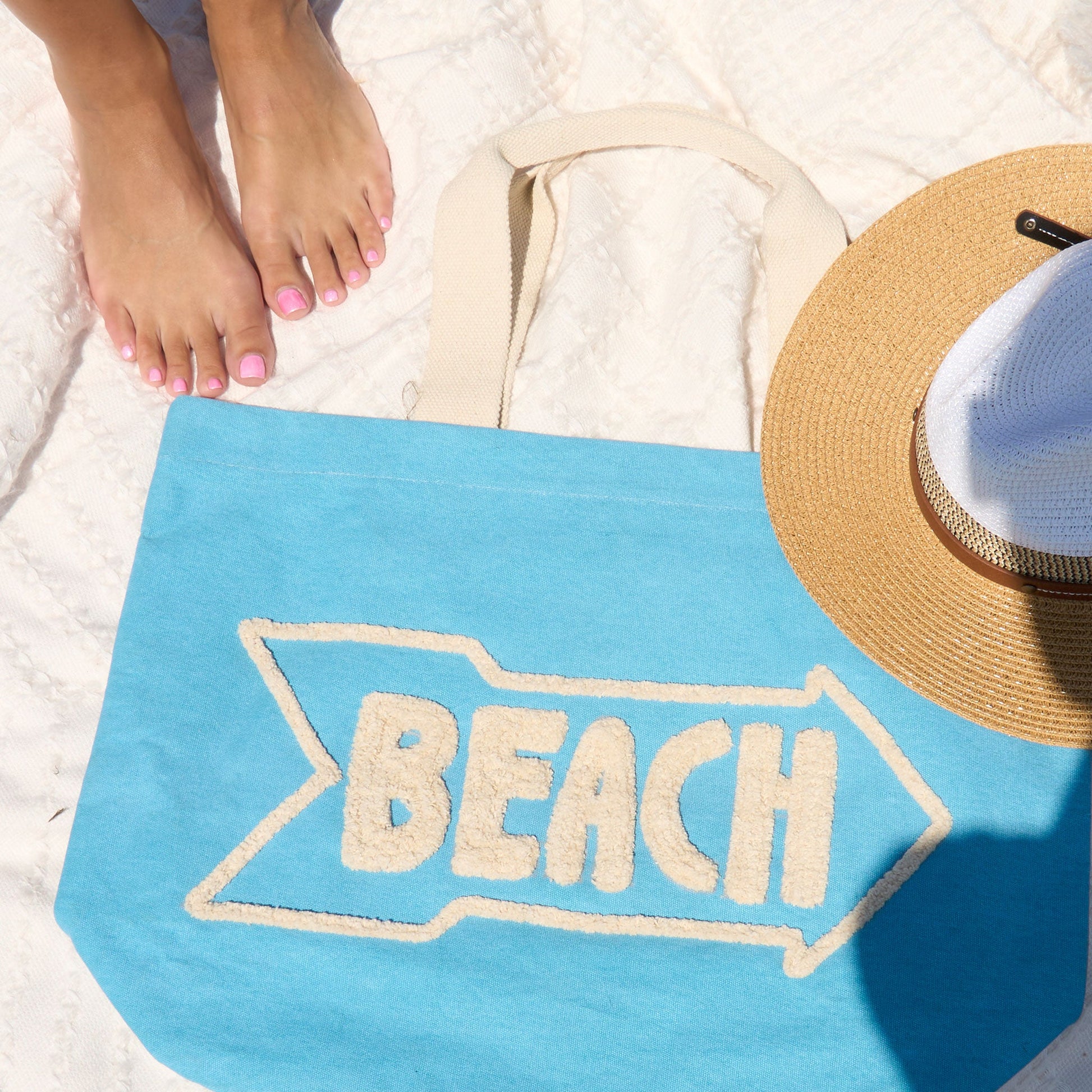 You'll be beach ready with the Aruba Water Resistant Tote! Water resistant so your belongings won't get wet, this tote bag features a vibrant blue color with the word 'Beach' hand embroidered across the front and inner pockets inside for extra organization, this water resistant bag will be your new summertime staple.