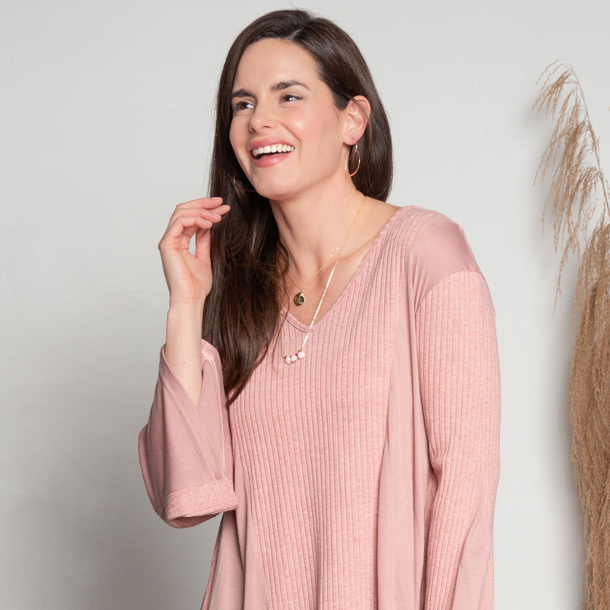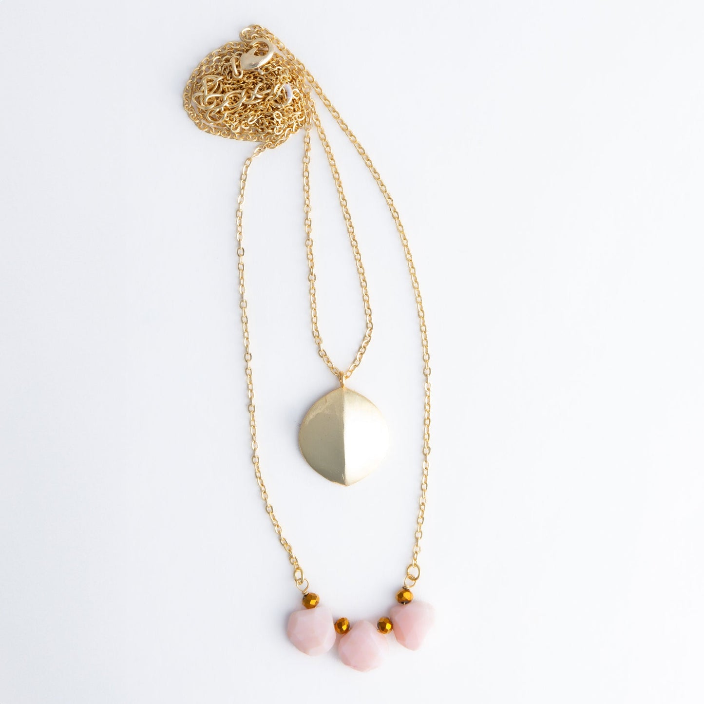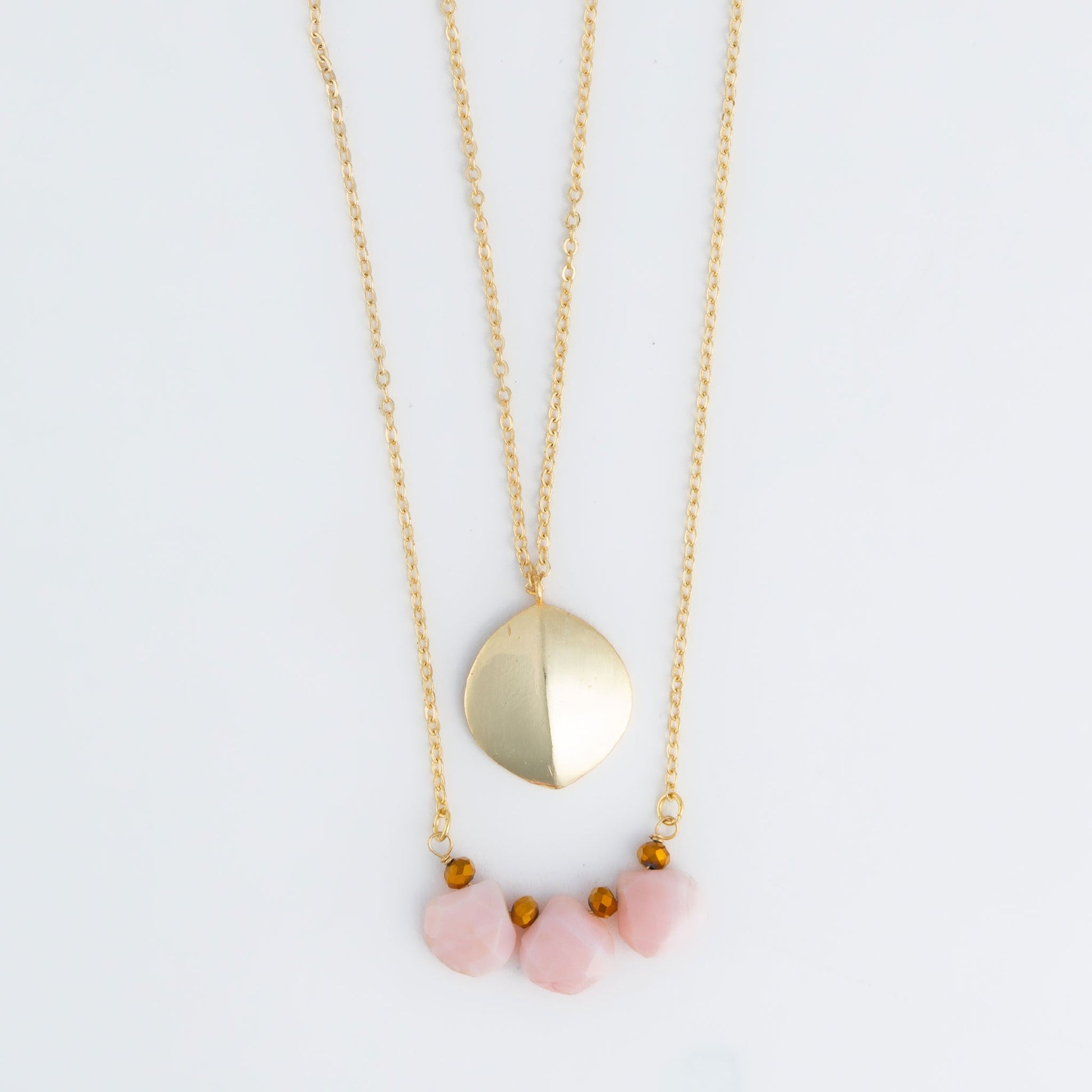 Love to layer! The Ash 18k Gold Layered Stone Pendant Necklace features two rows of delicate 18k gold plated chains, one with a chunky 18k gold plated disc, the other with genuine pink opal stones. Wear alone or easily layer with additional pieces, this necklace adds a fun touch to any jewelry collection.
