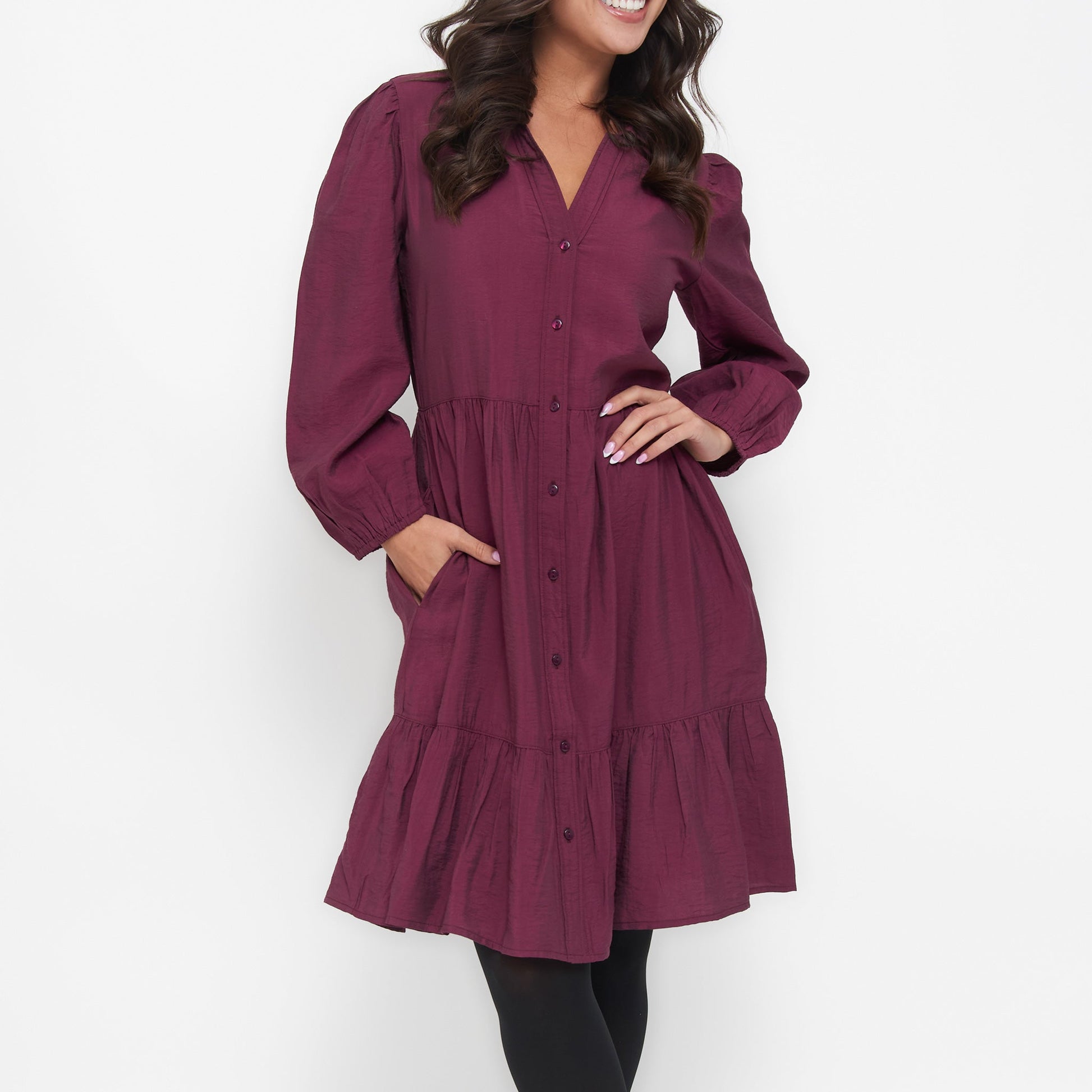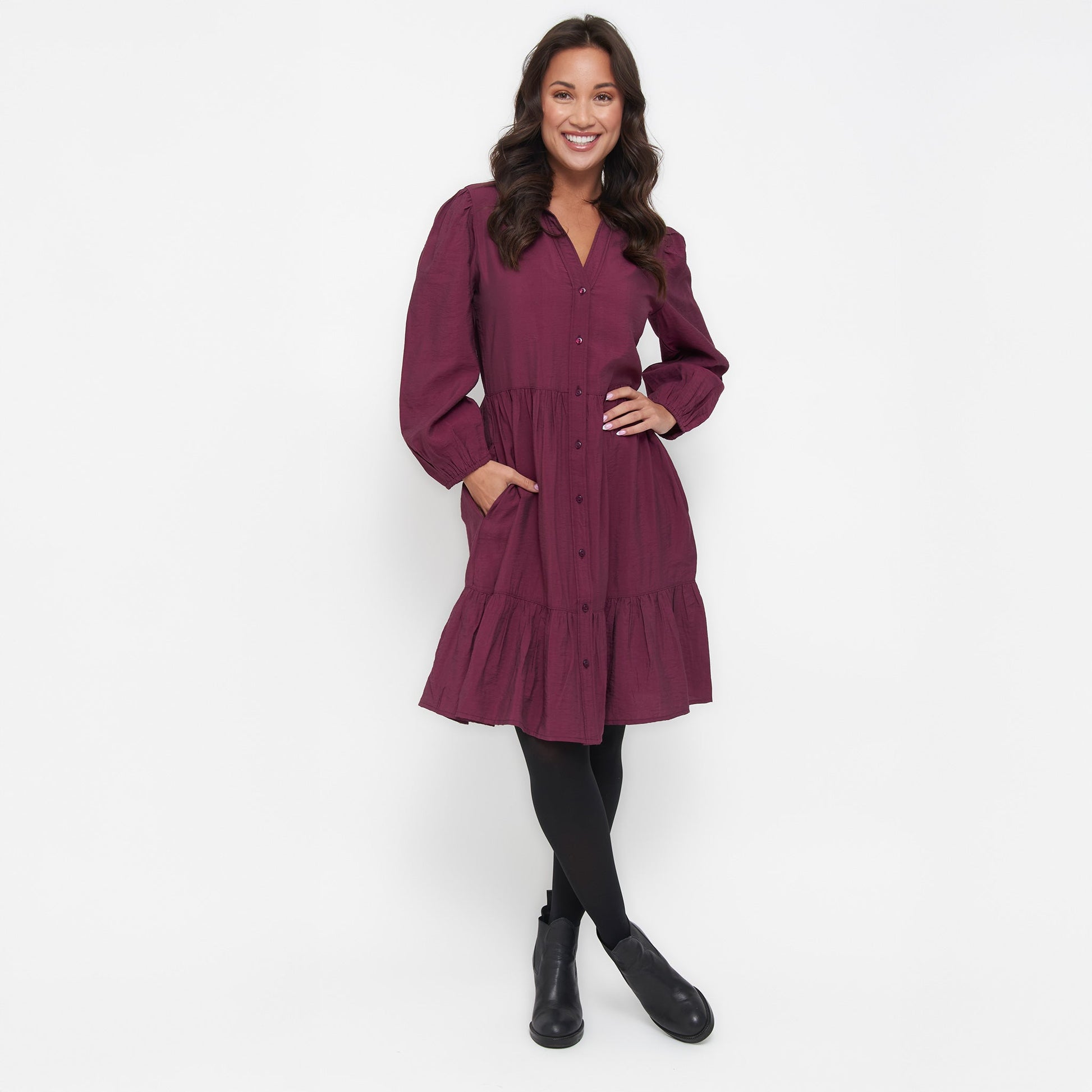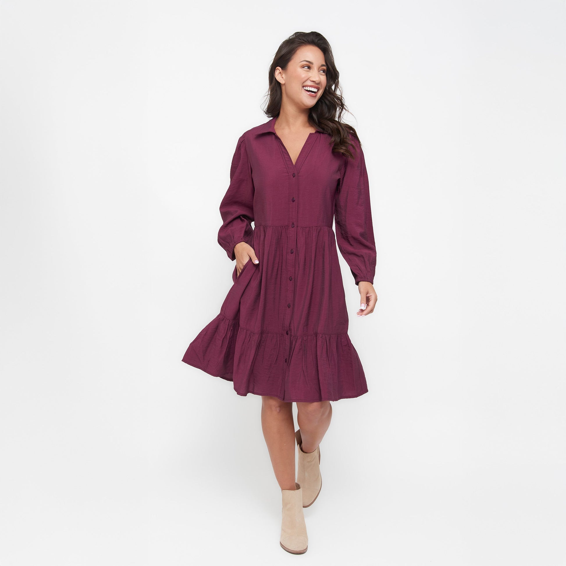 Update your wardrobe with the chic Ashton Tiered Dress. Featuring long sleeves, cute button up detailing, collared neckline, and trendy tiered design, all in a hammered satin fabric, this dress looks adorable on its own or paired with your favorite cardigan or blazer.