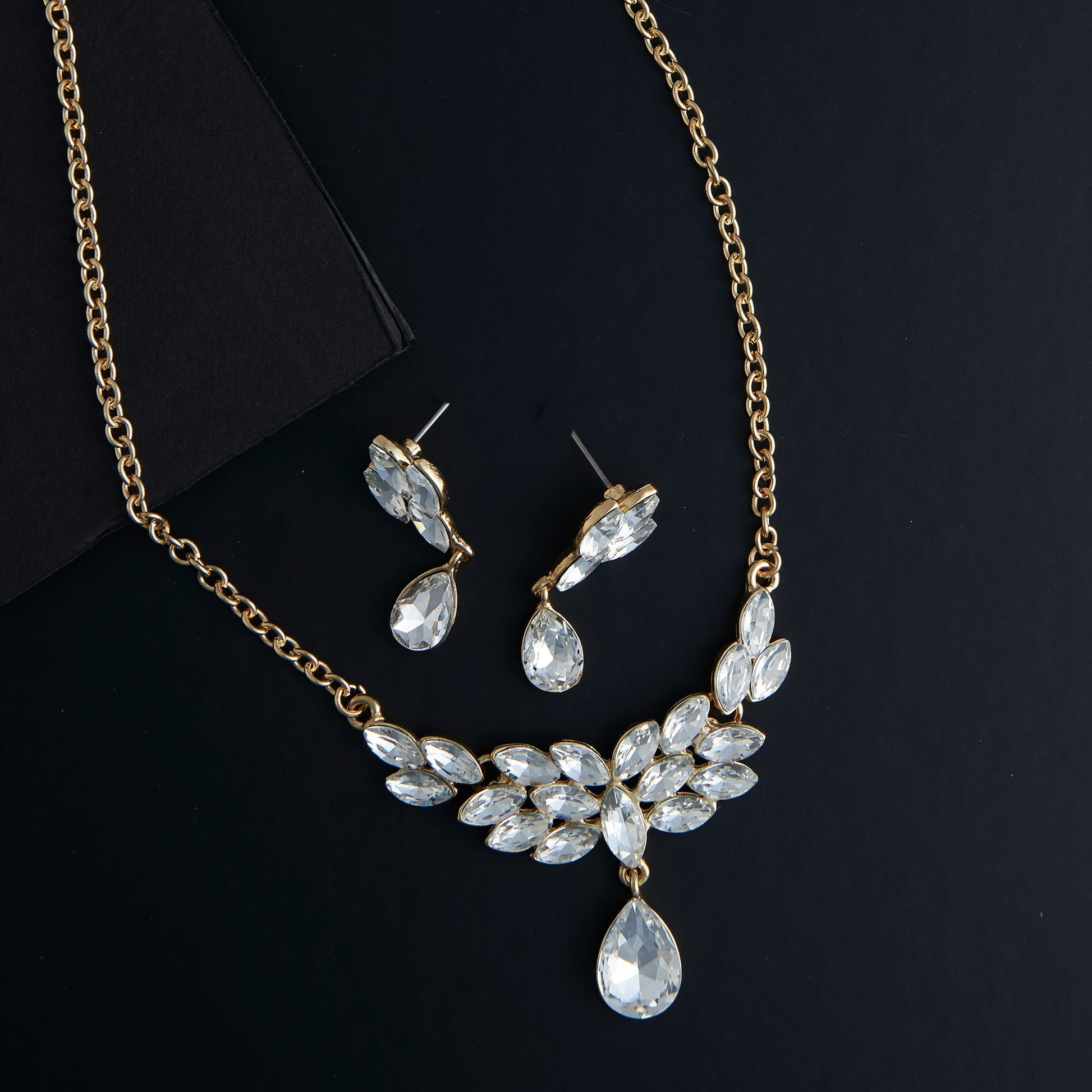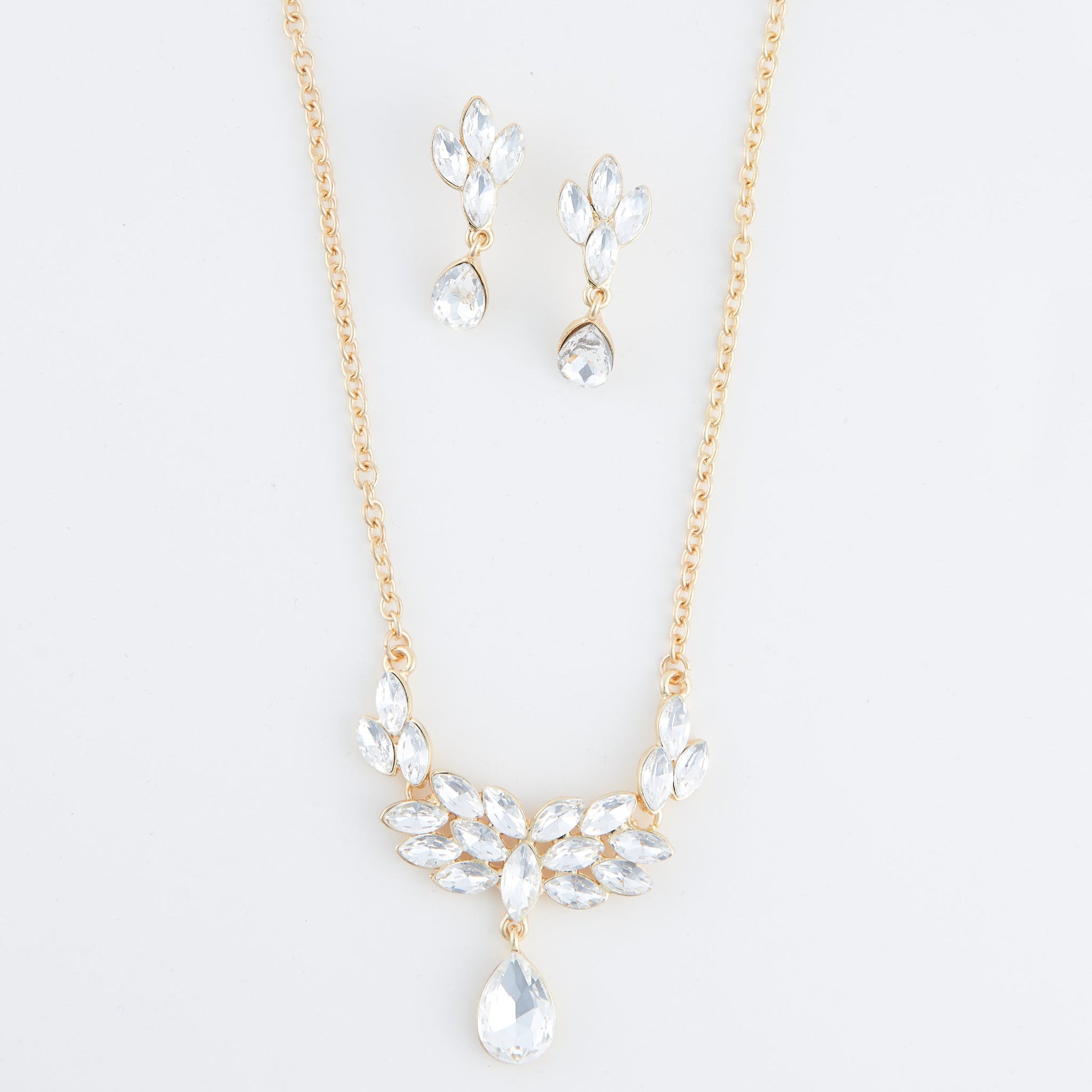 Add some sparkle to your wardrobe with the Aurea Teardrop Crystal Earring and Necklace Set. The necklace features shimmery stones set in a stunning teardrop pendant dropping from a gorgeous silver chain, while the earrings offer a chic teardrop design and post backing. This matching set is all you need for your next formal event.