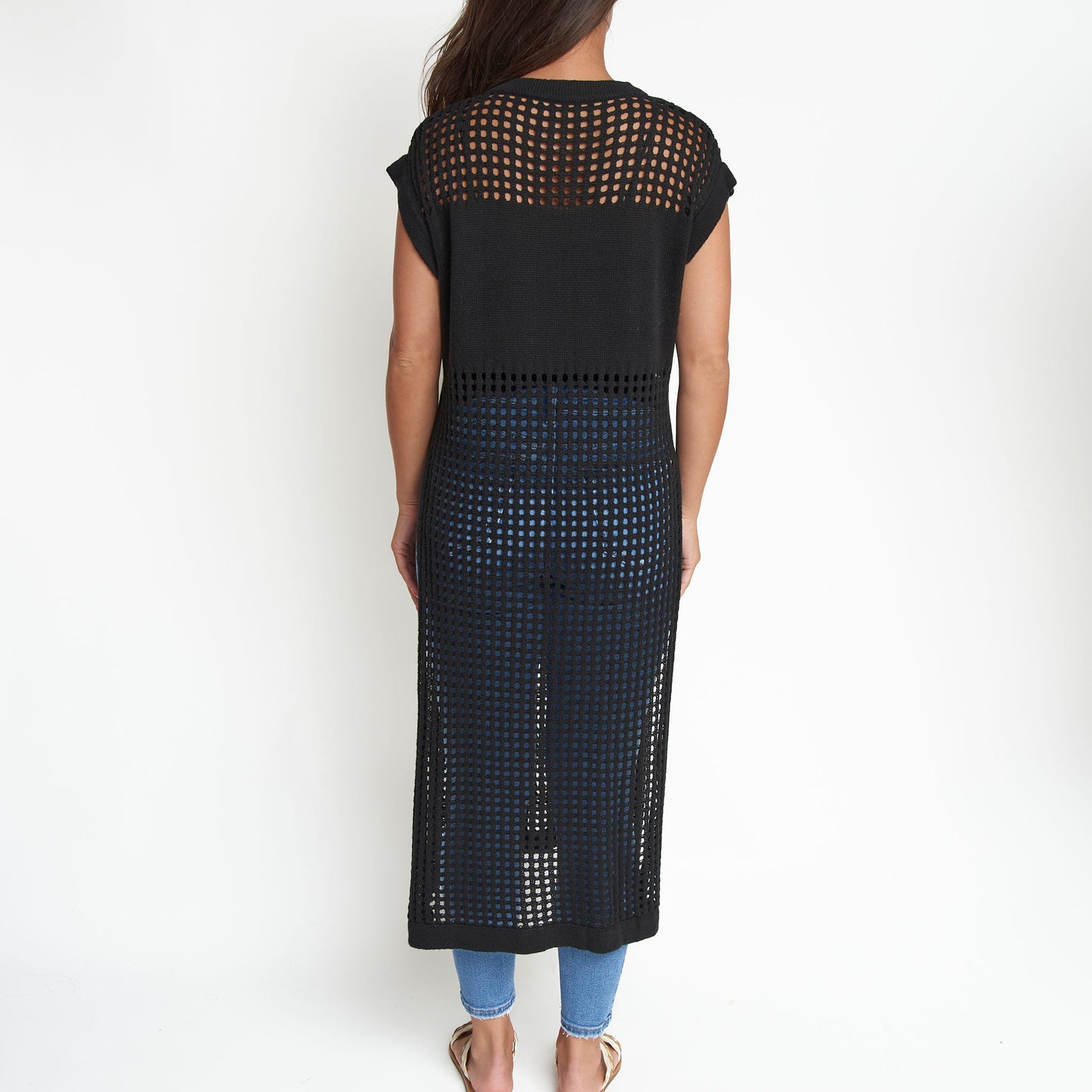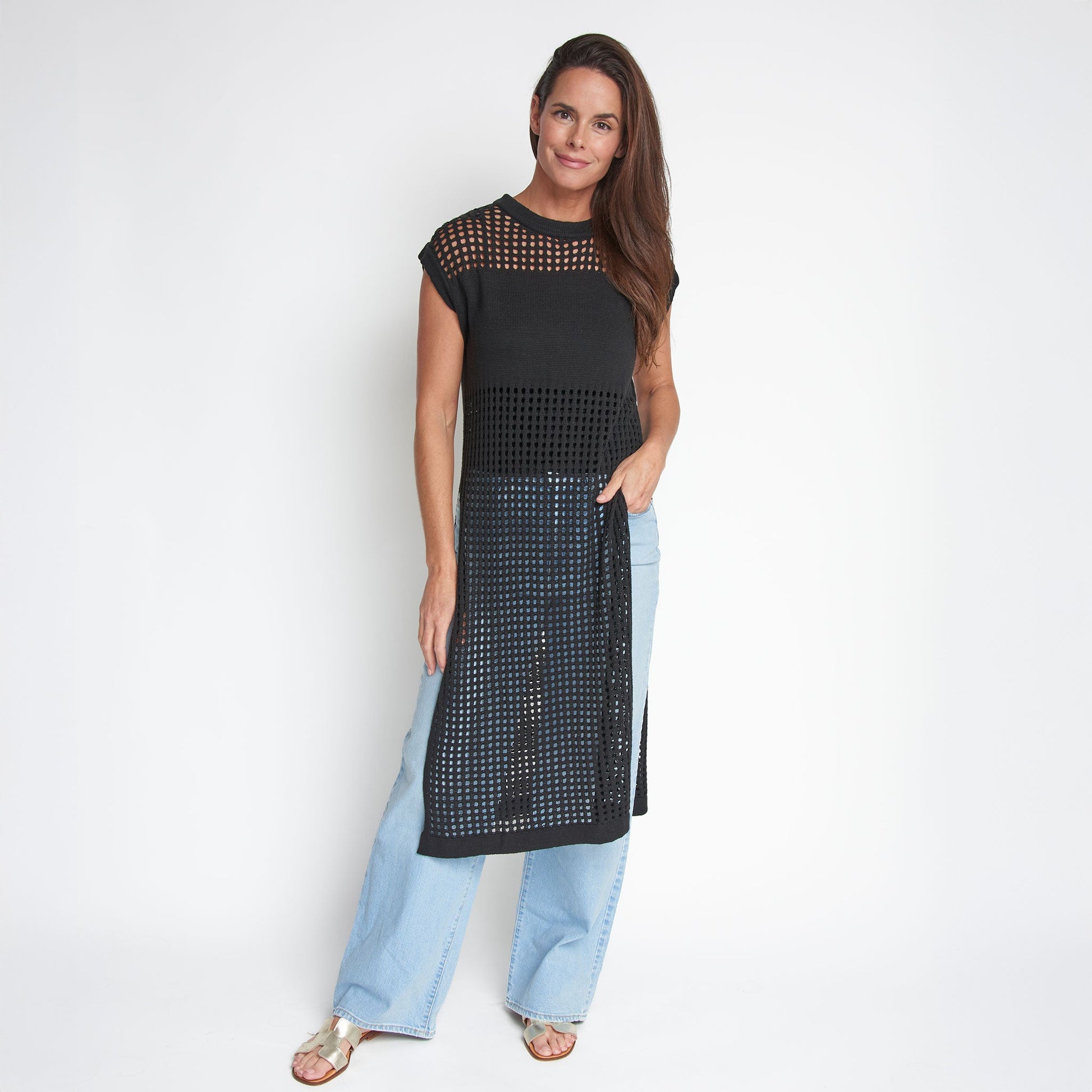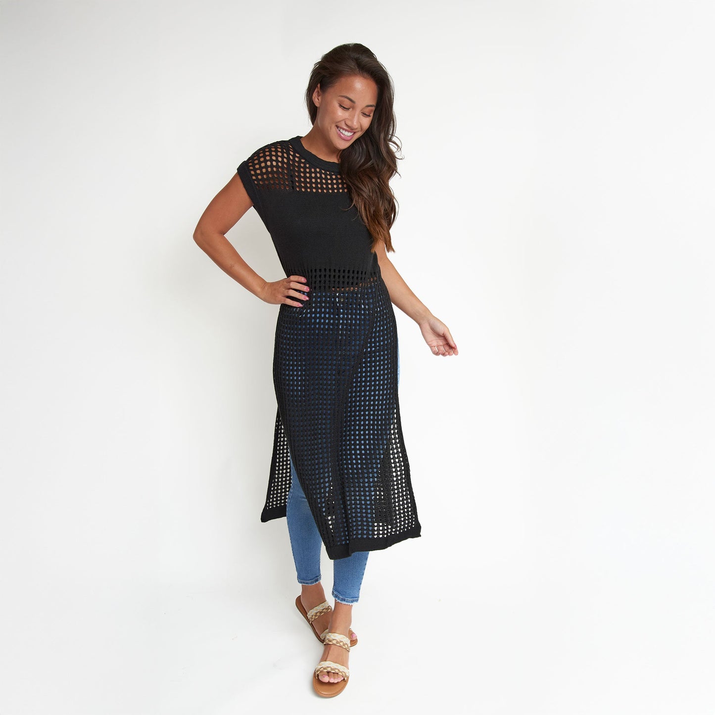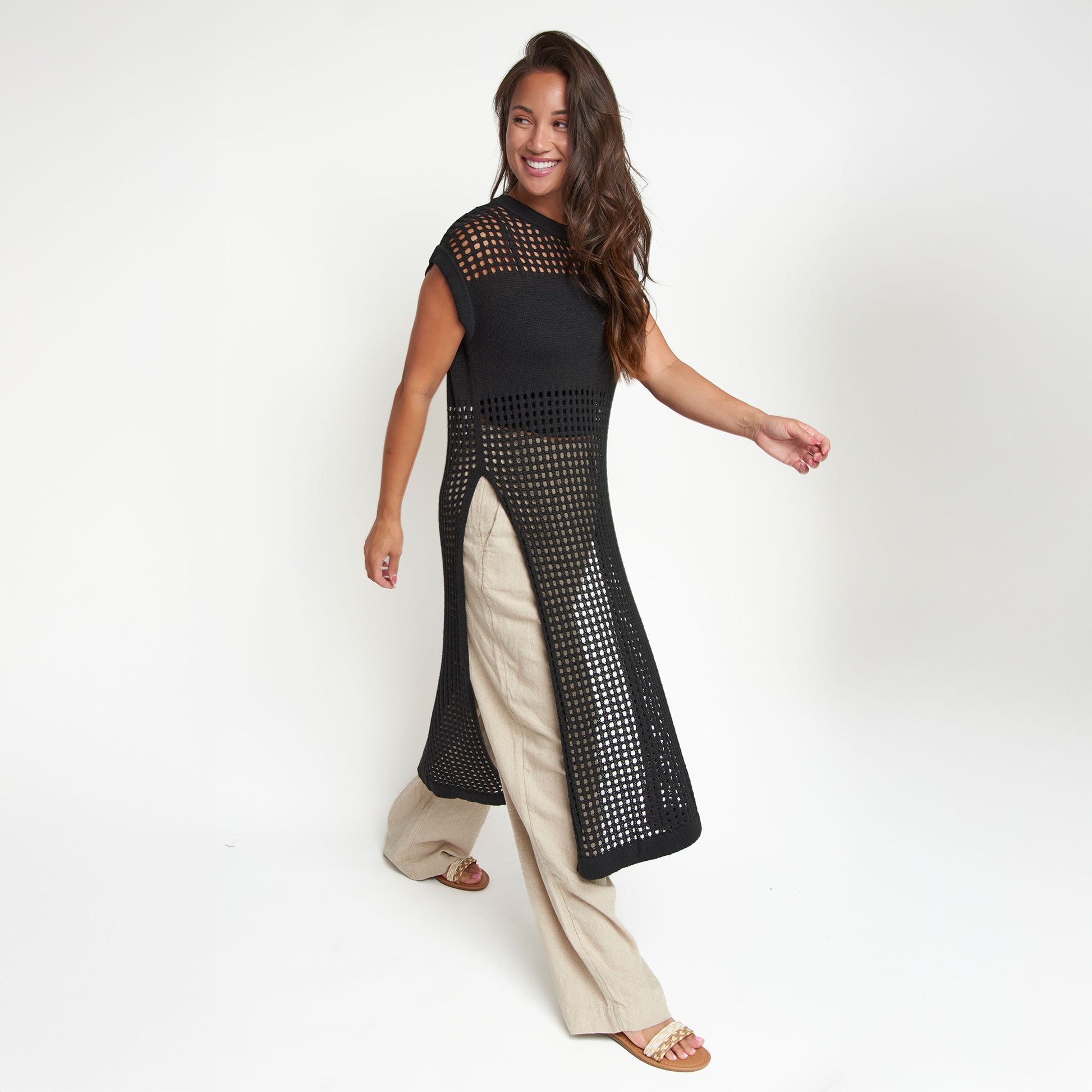 Sophisticated yet fun, the Azalea Sleeveless Longline Crochet Sweater is on-trend with a stunning, longline design, stylish blocking, and classic jet black coloring. Pair it with your favorite trousers, shorts, or jeans, or over a swimsuit - the styling ideas are endless.