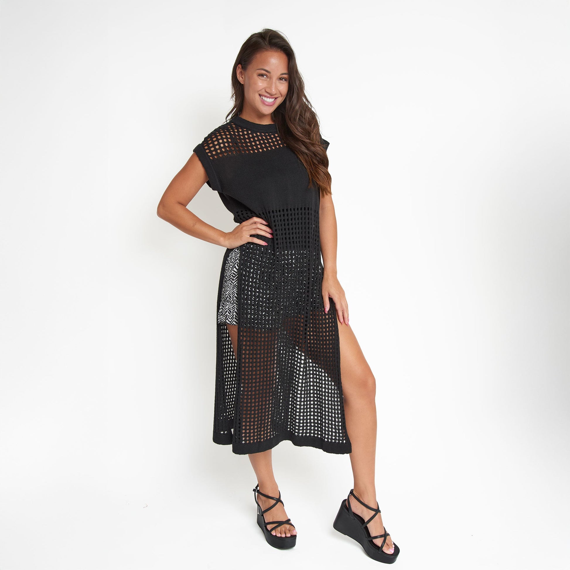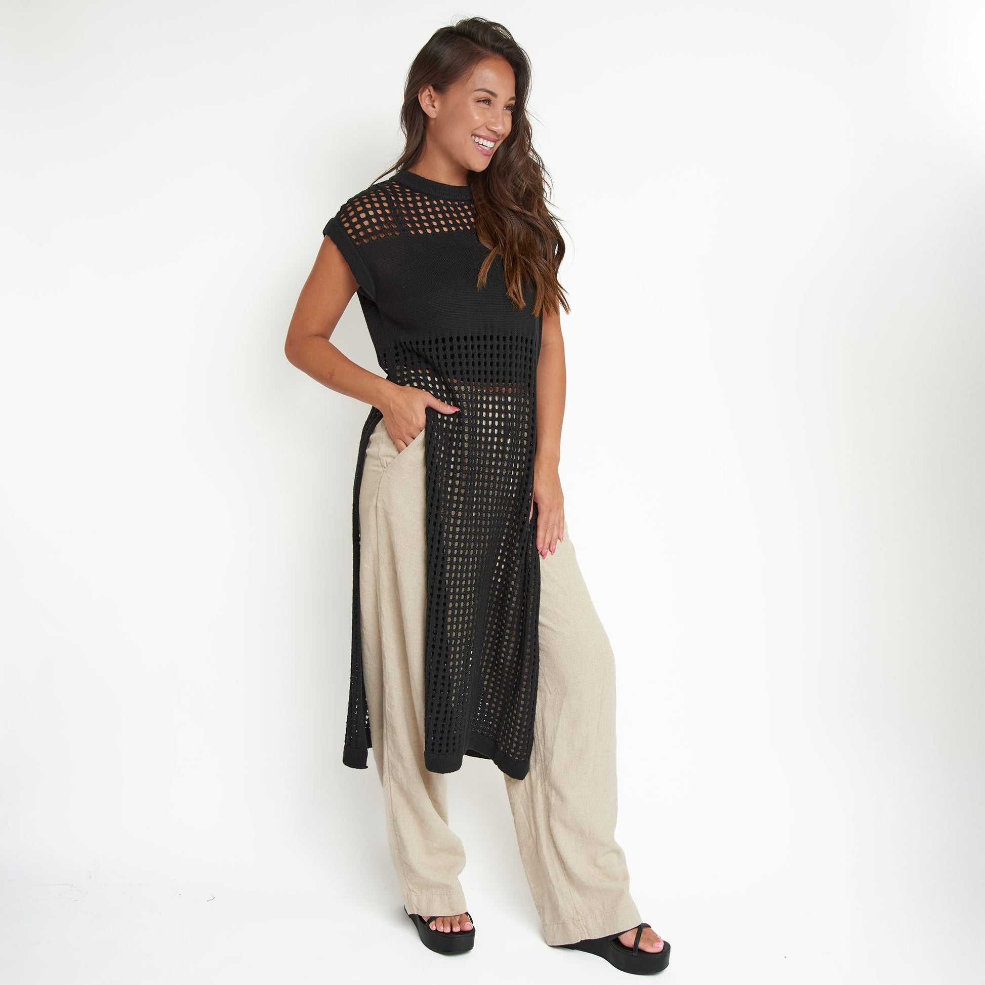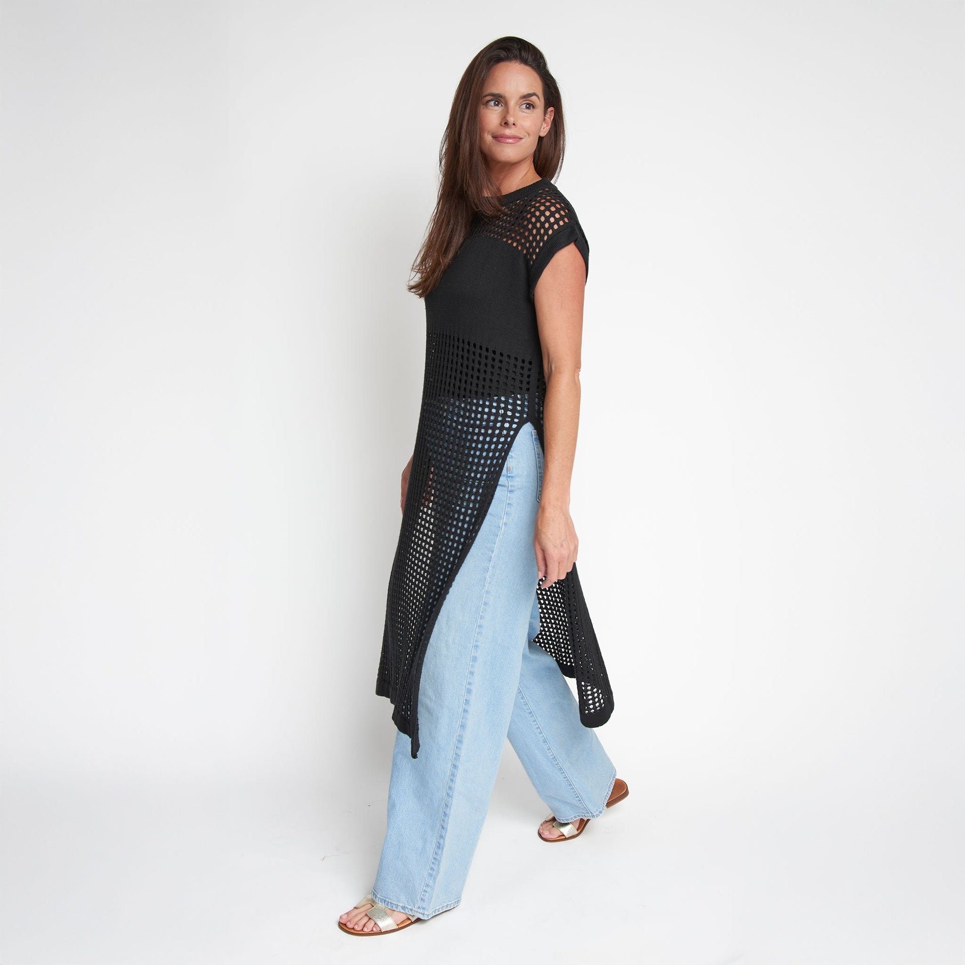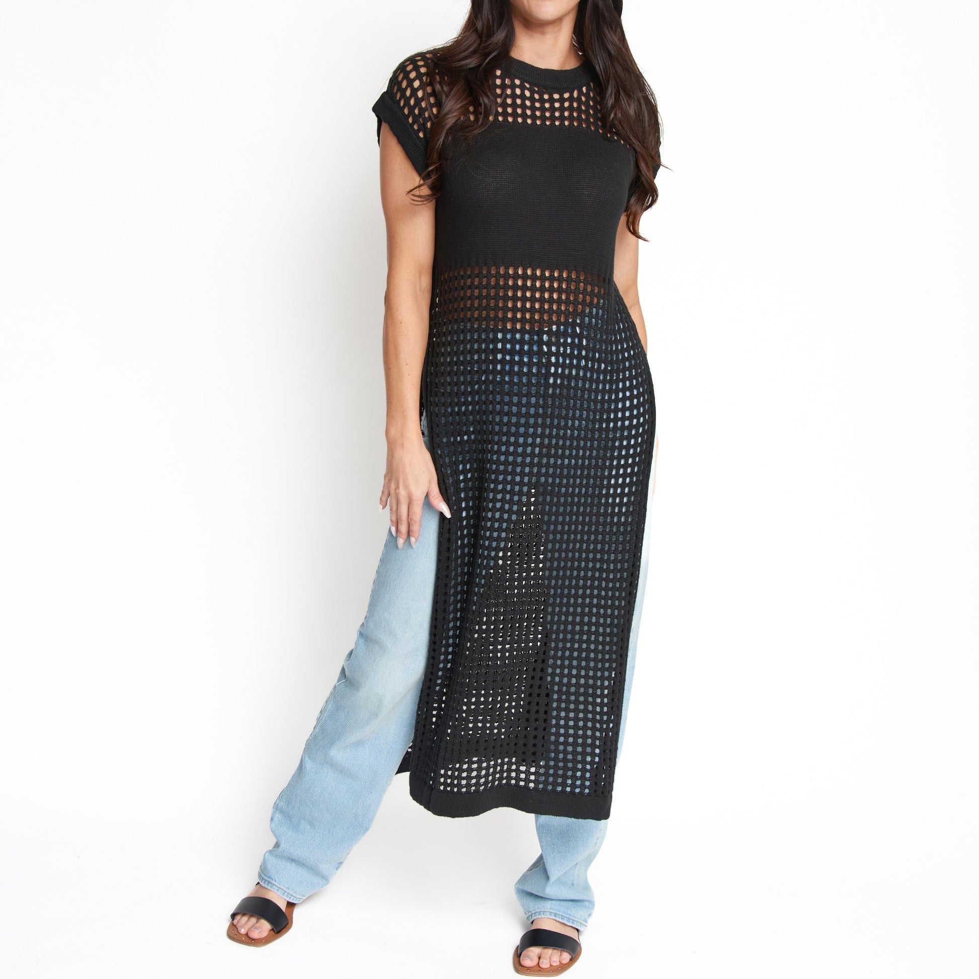 Sophisticated yet fun, the Azalea Sleeveless Longline Crochet Sweater is on-trend with a stunning, longline design, stylish blocking, and classic jet black coloring. Pair it with your favorite trousers, shorts, or jeans, or over a swimsuit - the styling ideas are endless.