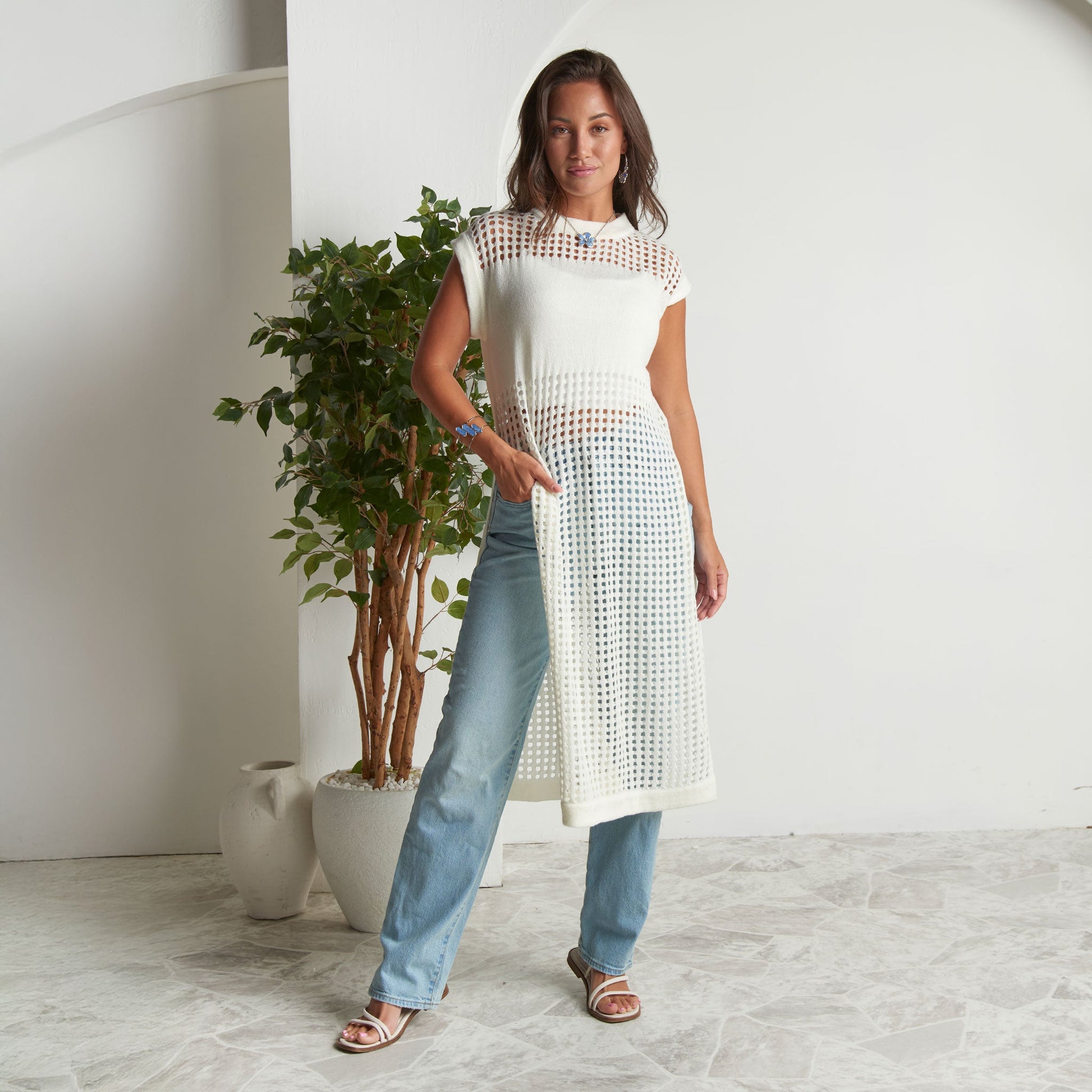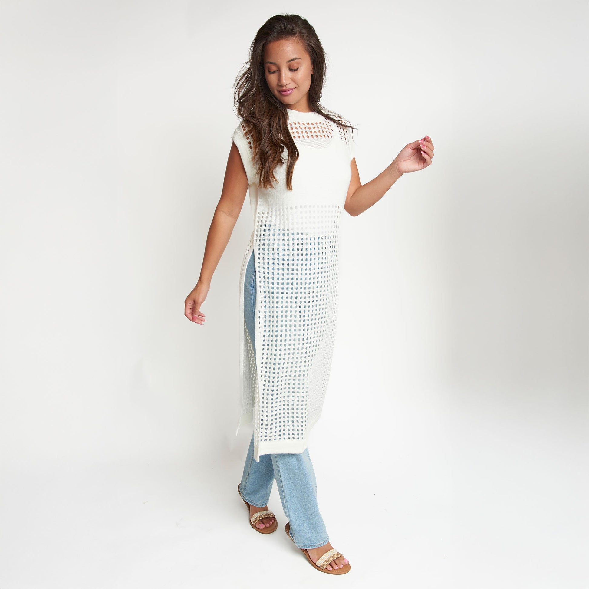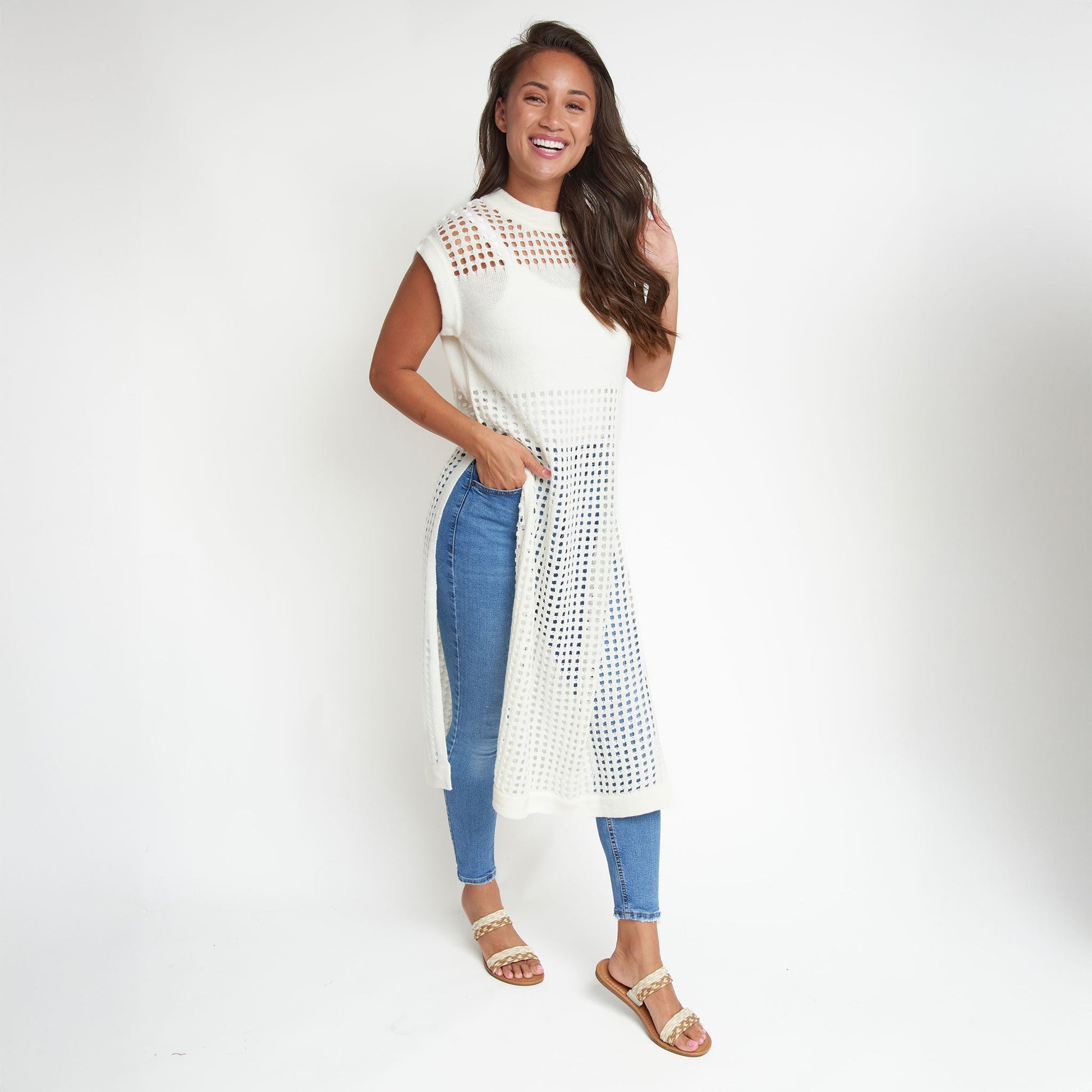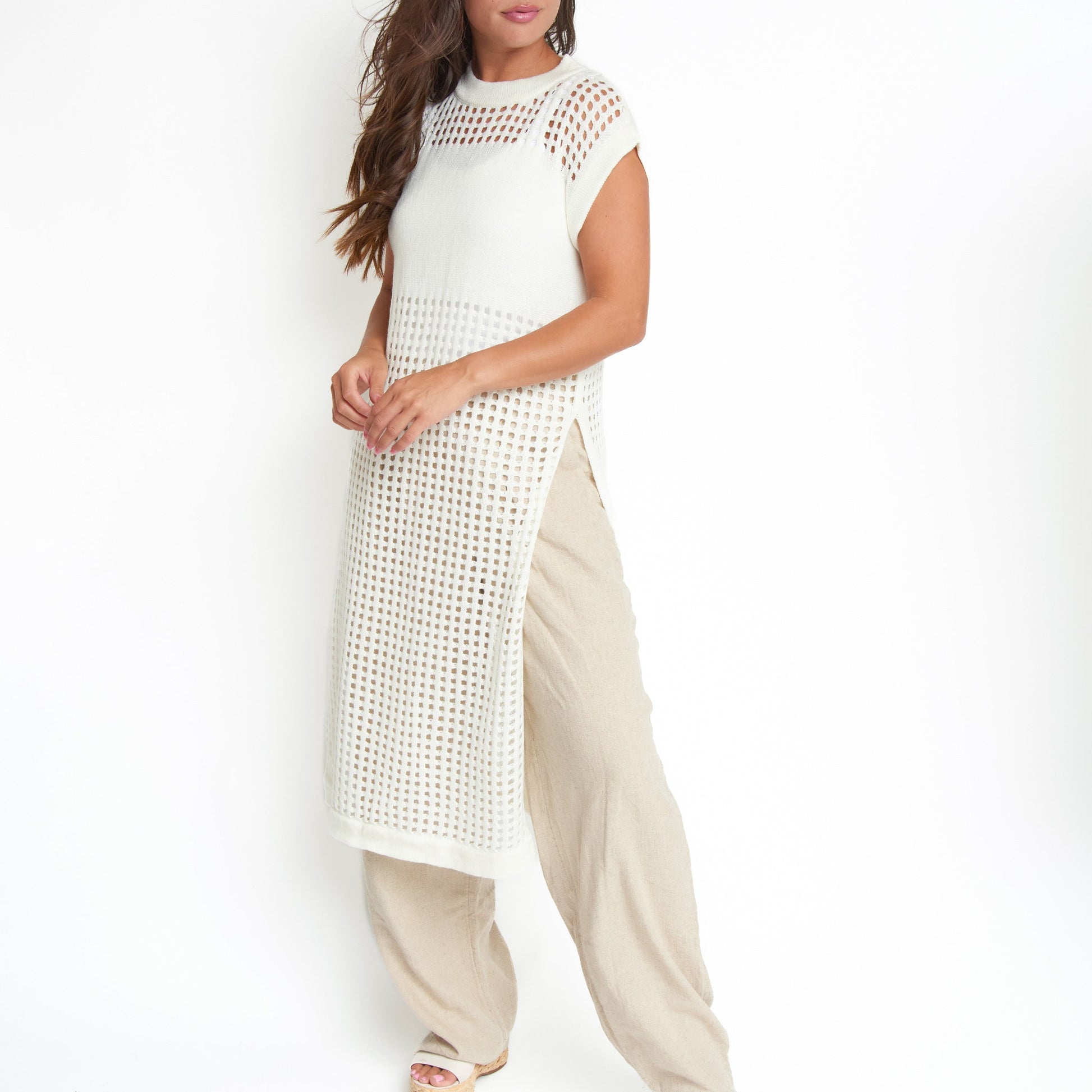 Sophisticated yet fun, the Azalea Sleeveless Longline Crochet Sweater is on-trend with a stunning, longline design, stylish blocking, and crisp snow white coloring. Pair it with your favorite trousers, shorts, or jeans, or over a swimsuit - the styling ideas are endless.