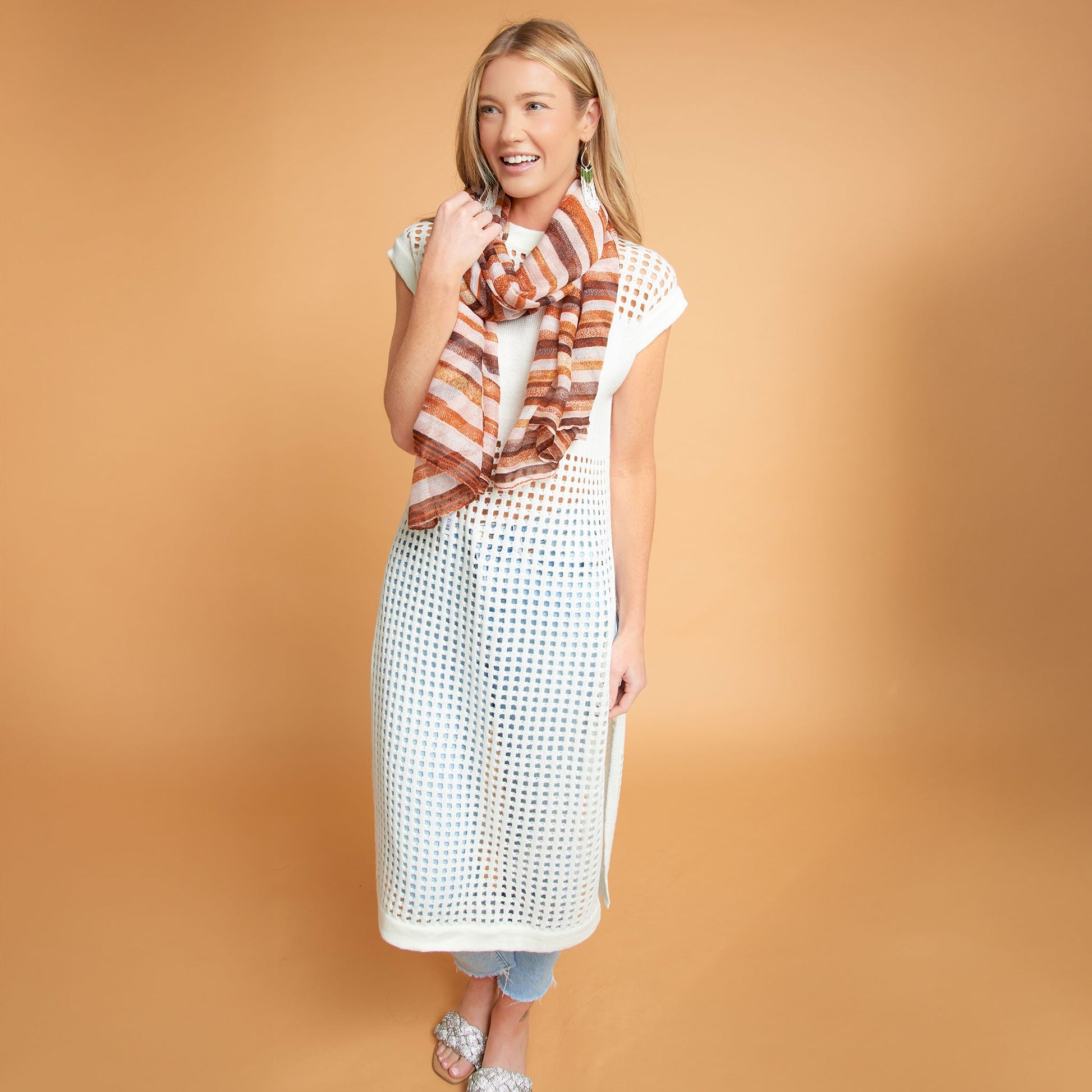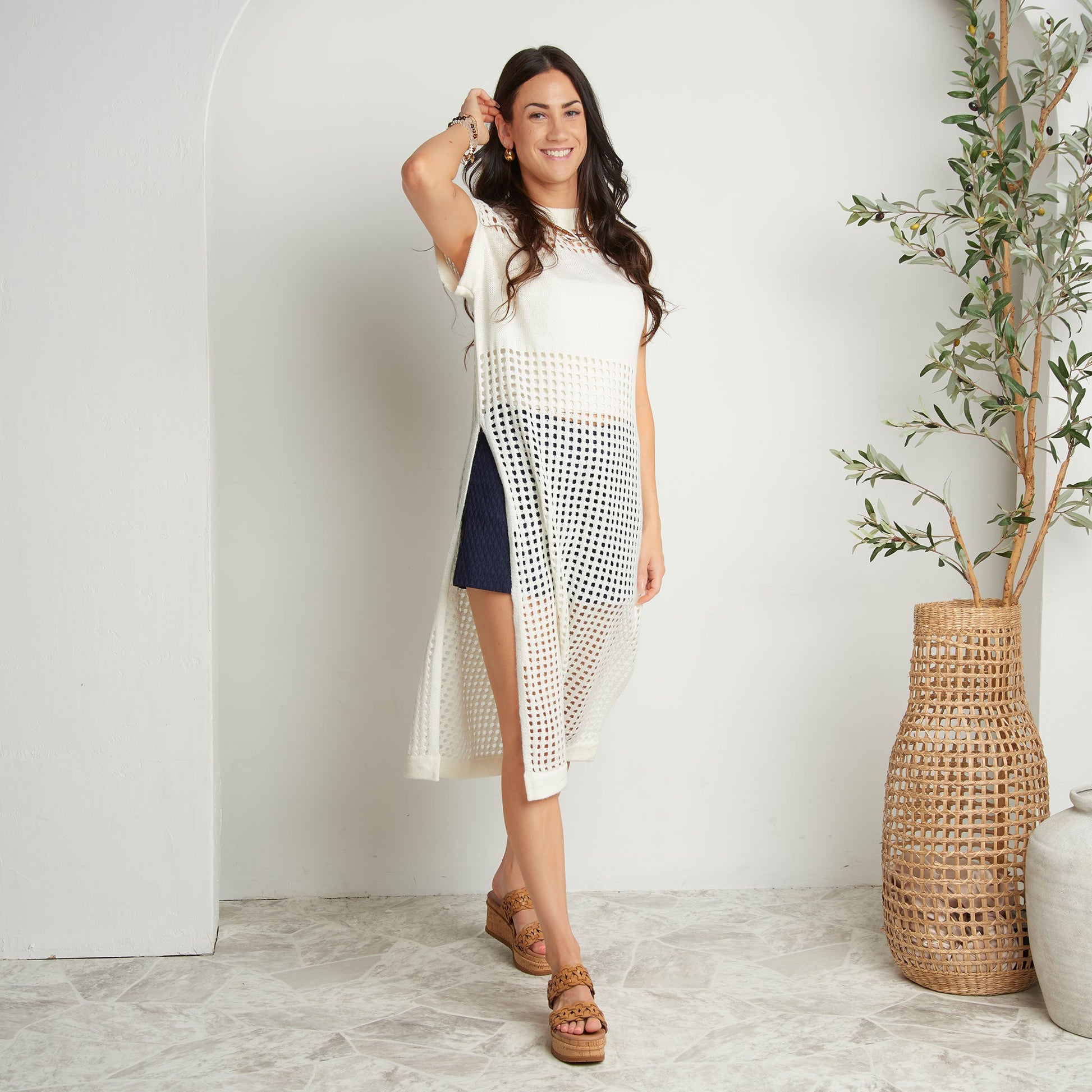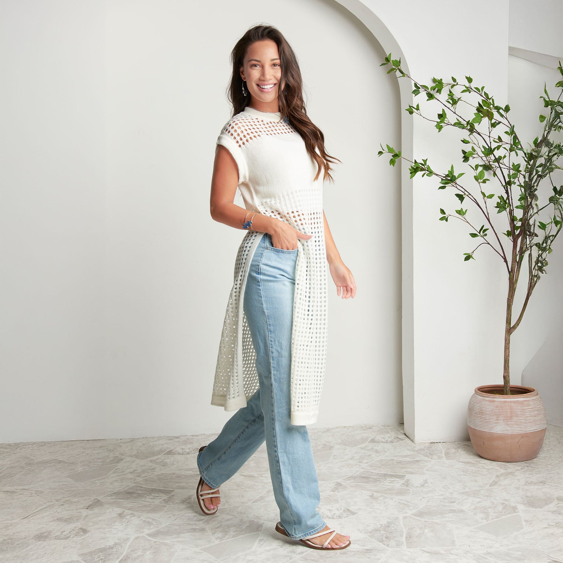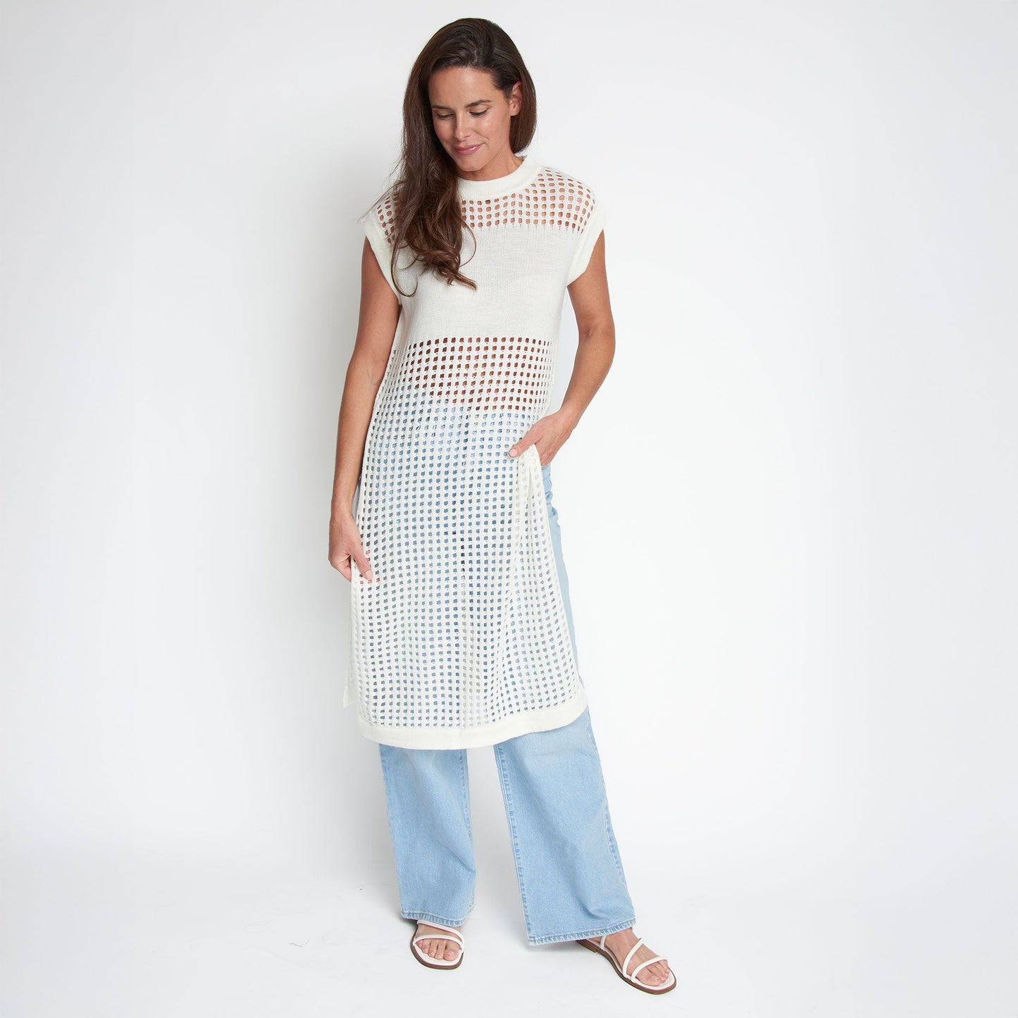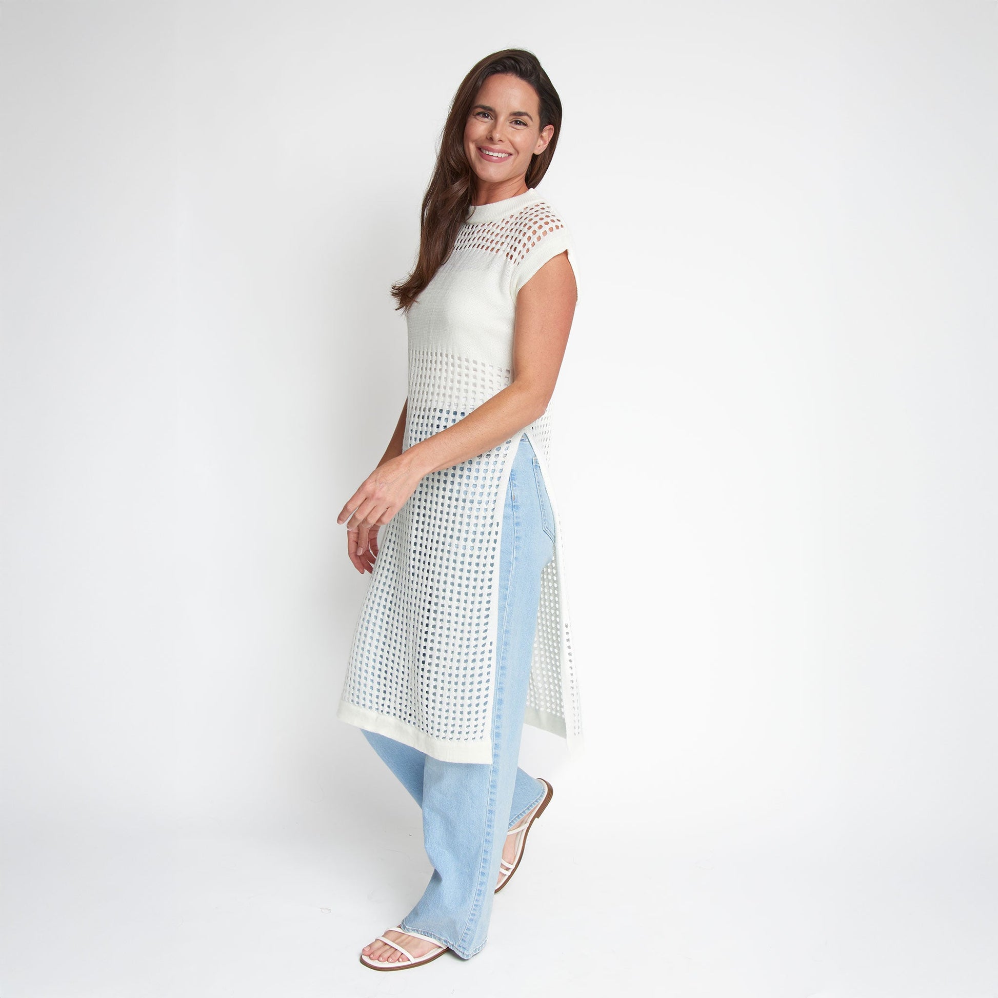 Sophisticated yet fun, the Azalea Sleeveless Longline Crochet Sweater is on-trend with a stunning, longline design, stylish blocking, and crisp snow white coloring. Pair it with your favorite trousers, shorts, or jeans, or over a swimsuit - the styling ideas are endless.