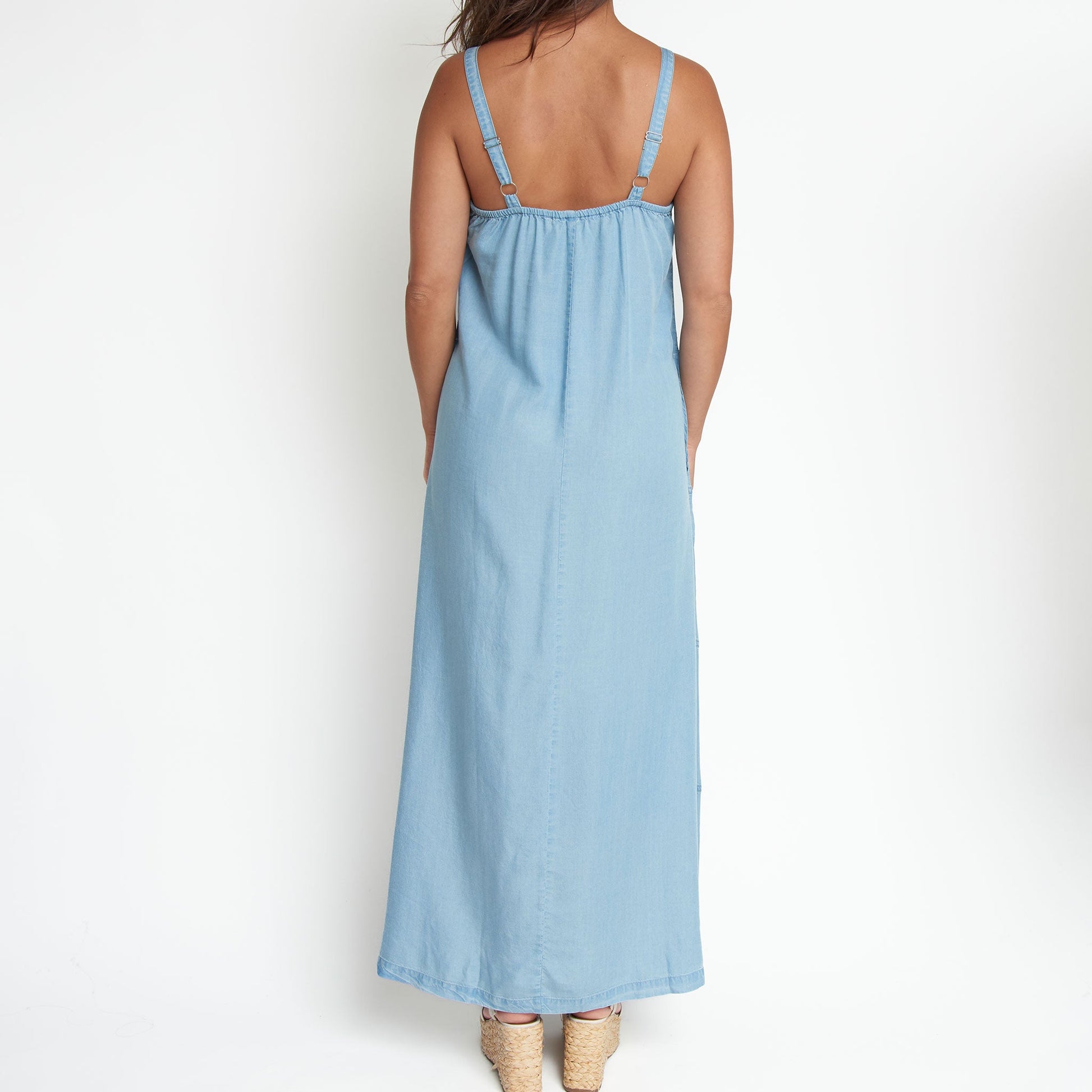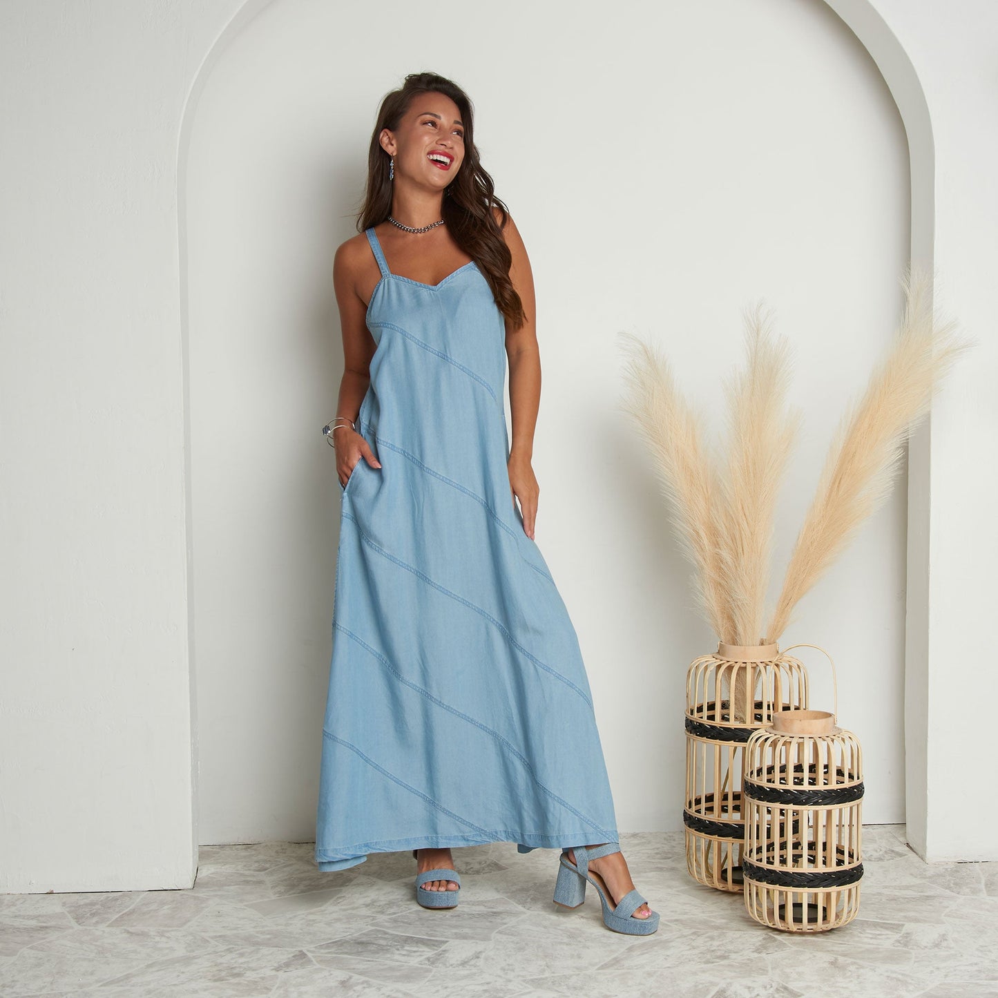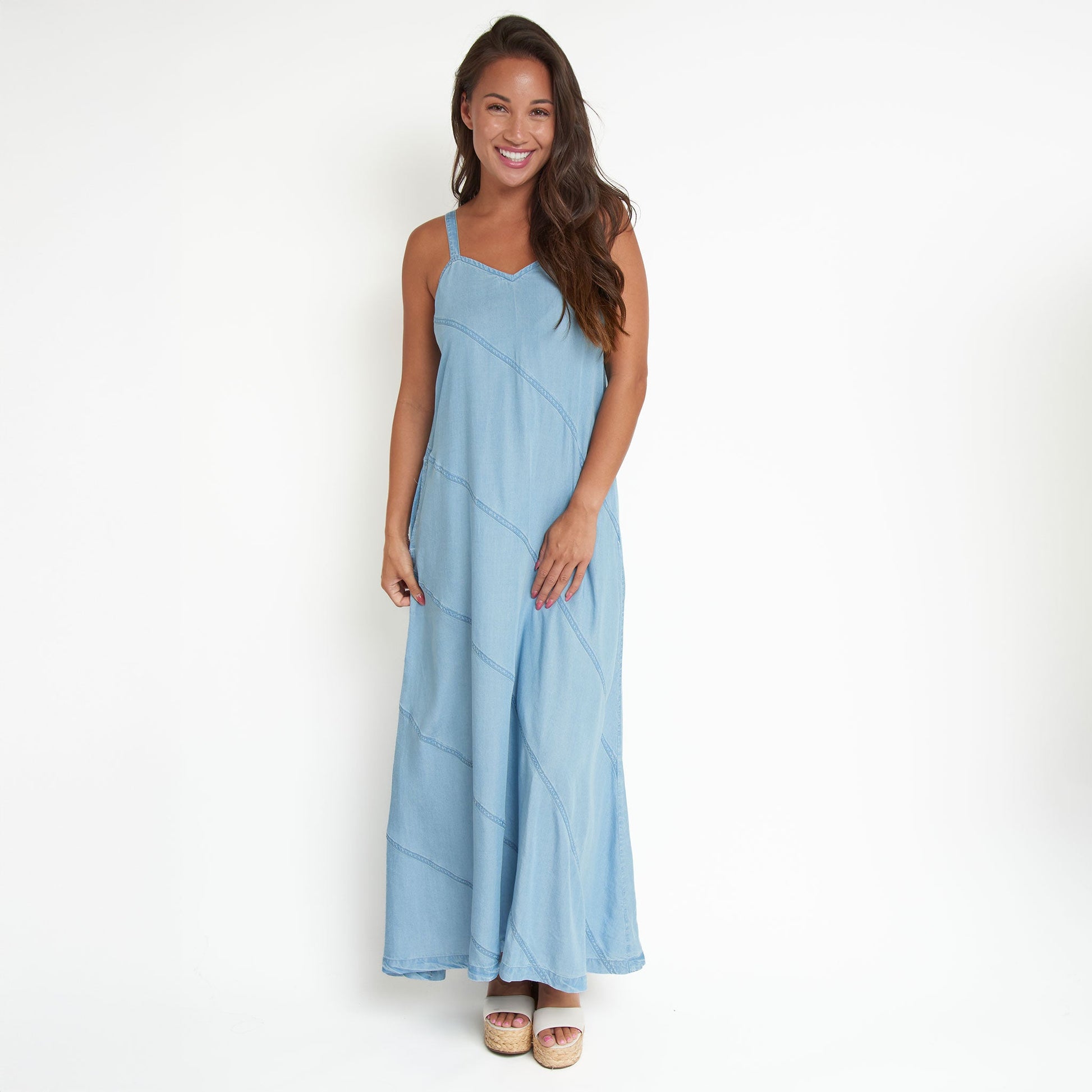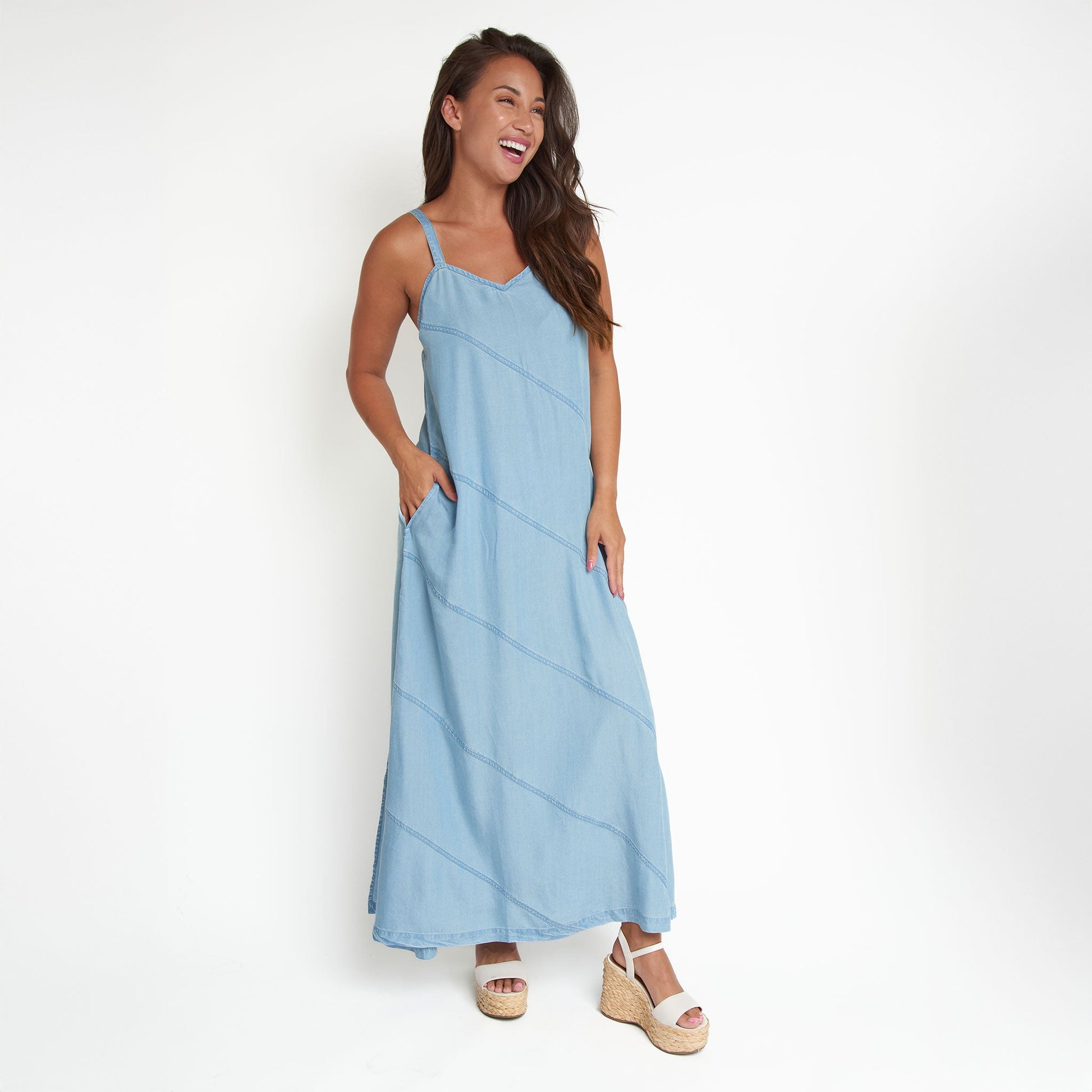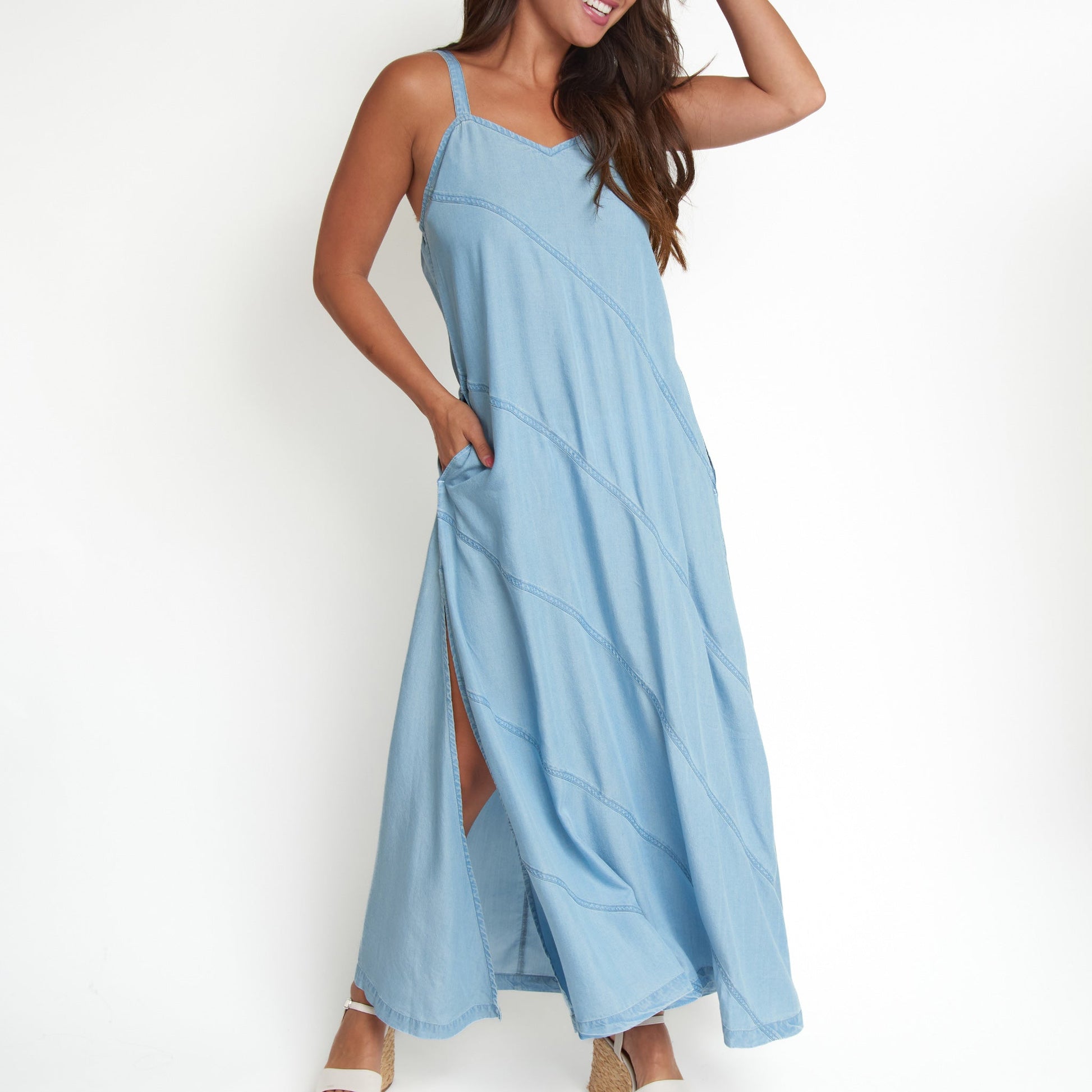 Chic and comfortable, the Bailey Chambray Maxi Dress features breezy, lightweight lyocell fabric, with a fun diagonal seam design, side slit, and adjustable straps. This on-trend dress is easy to style and even easier to wear.