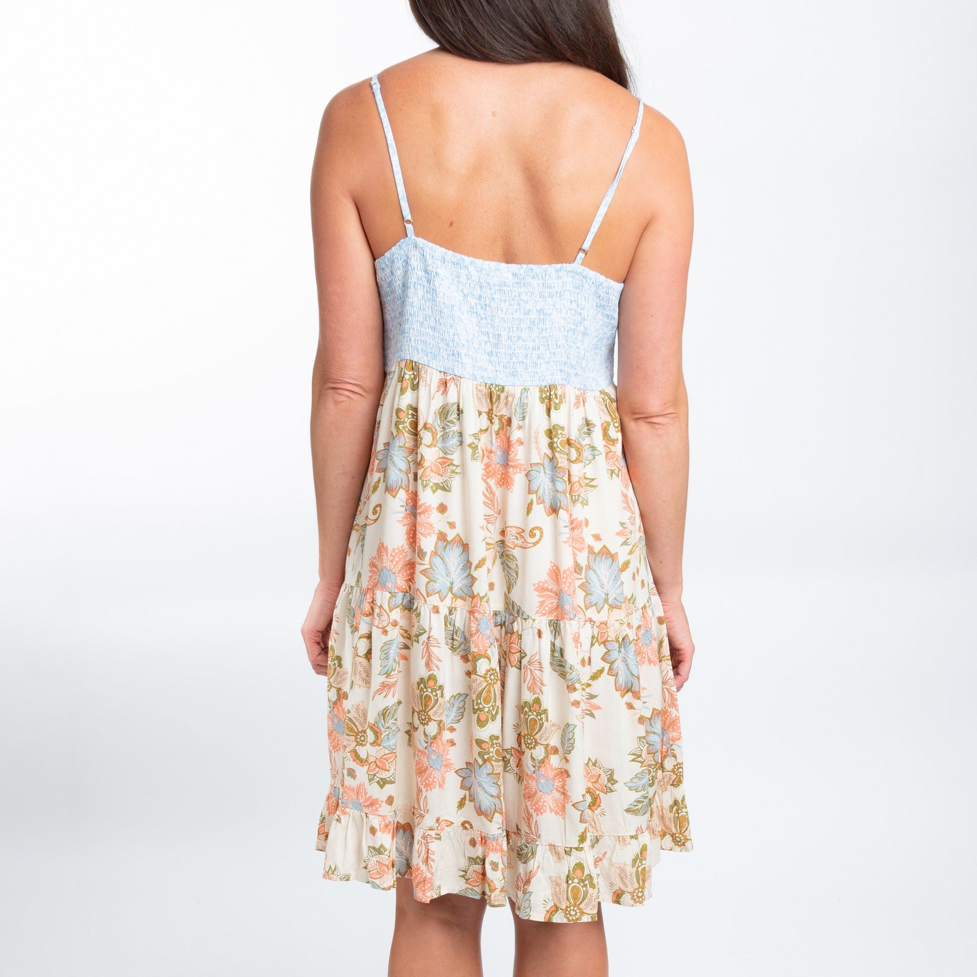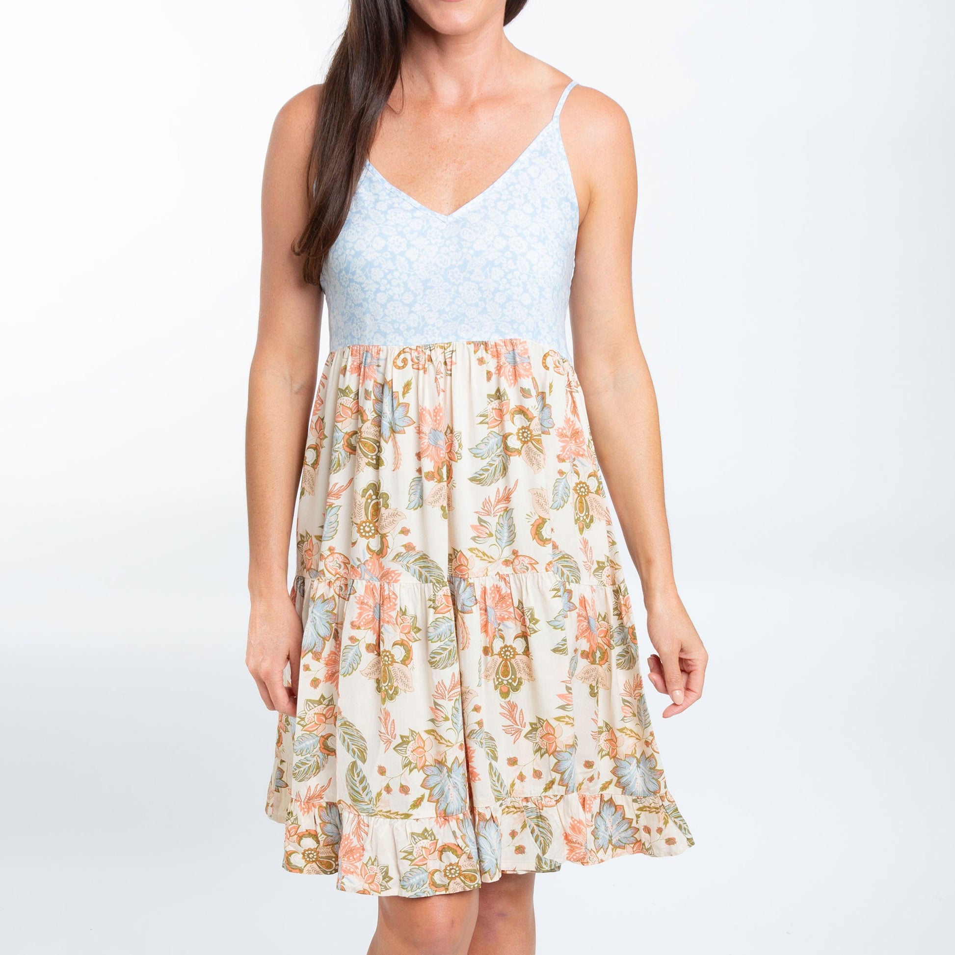 A summer staple! The Bellamy Spaghetti Strap Tiered Dress is a cute tiered panel dress featuring a two tone soft floral print, and boasting spaghetti style adjustable straps. Dress it up with your favorite summer heels or down with flip flops for a versatile summer piece.