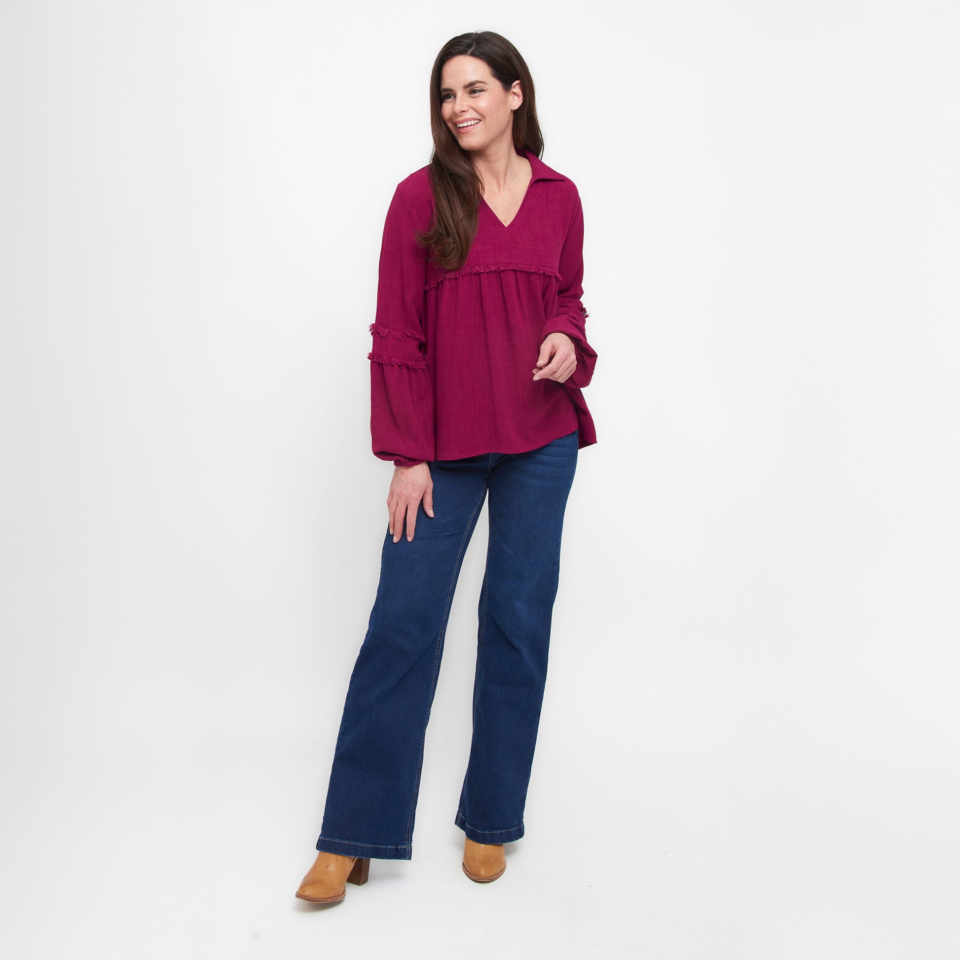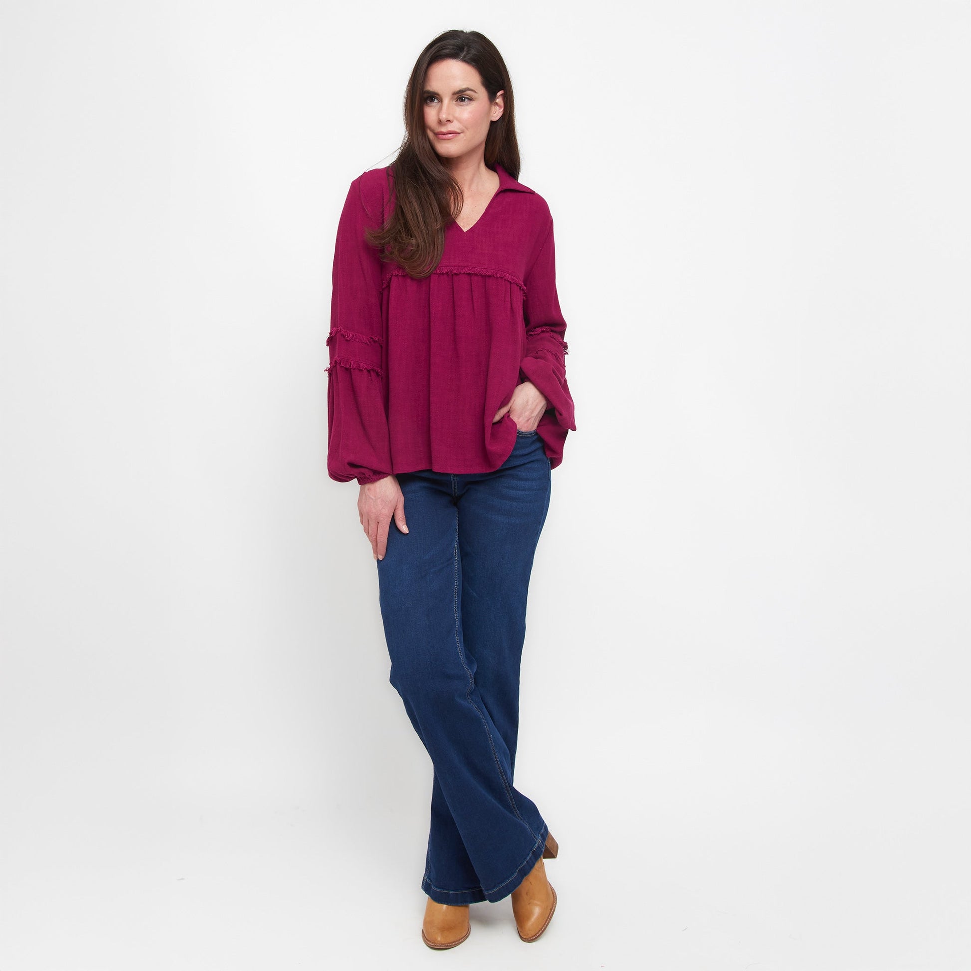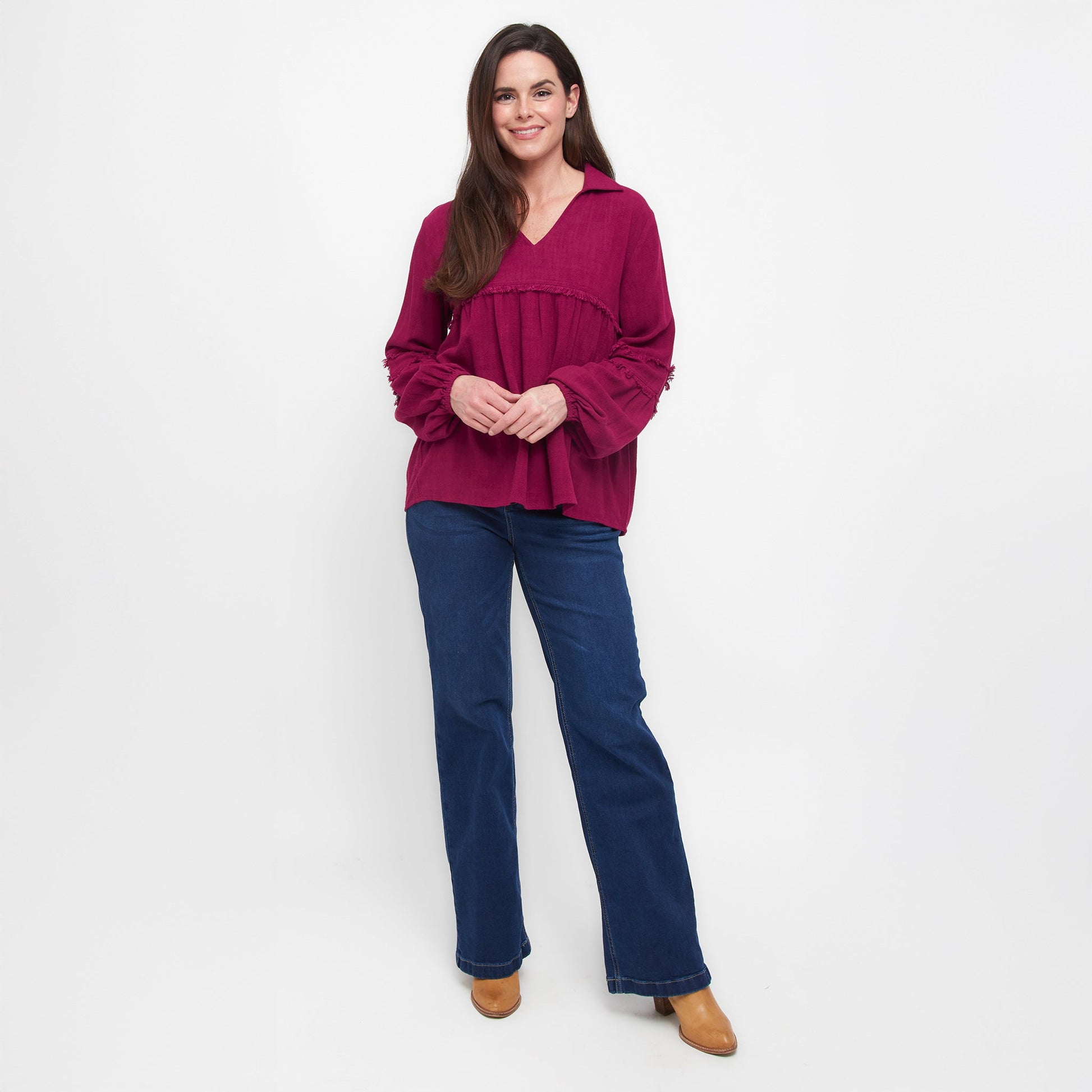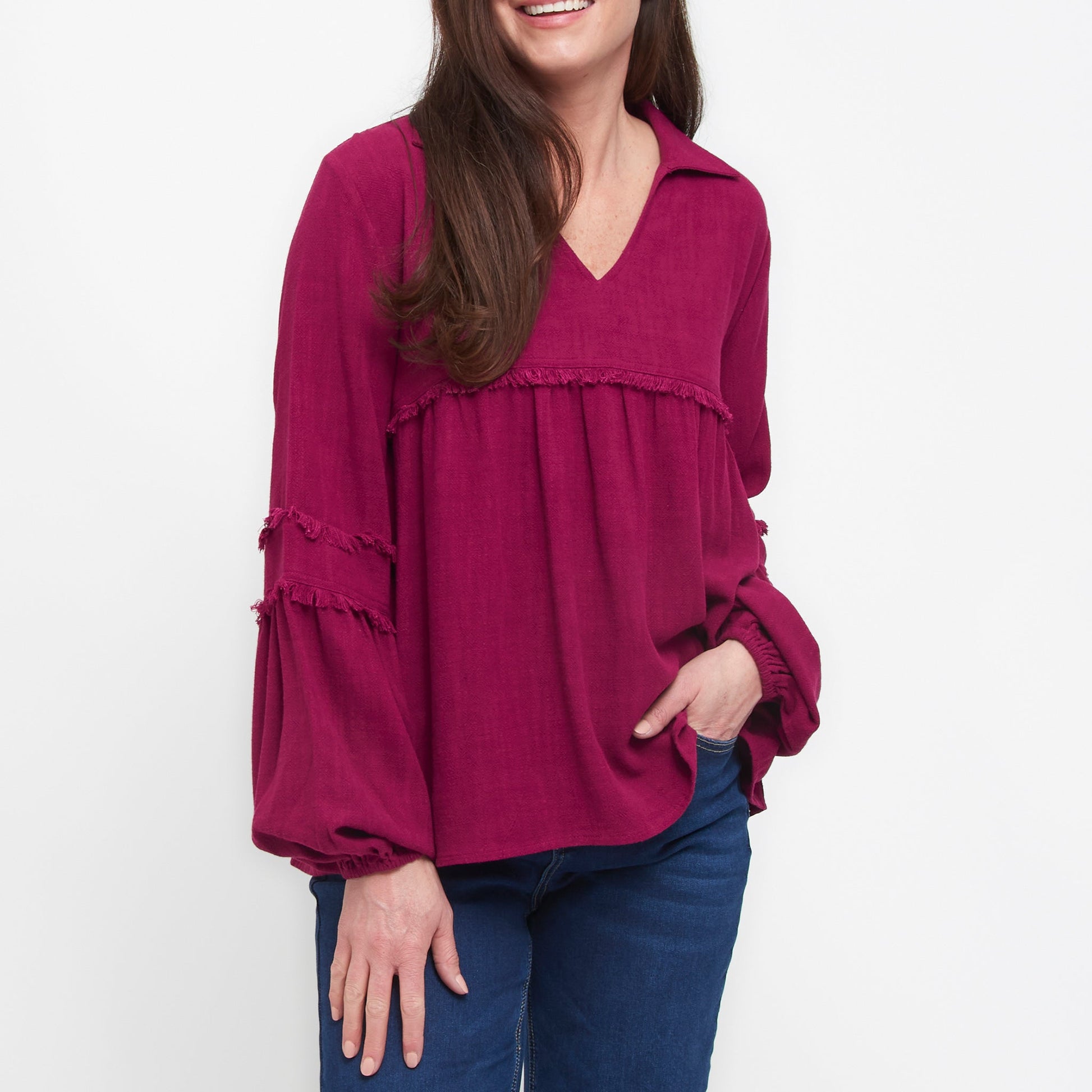 Update your wardrobe with the Blayke Babydoll Blouse. Featuring a soft linen blend fabric, v-neckline with a collar and classic babydoll design with frayed hem accents, this blouse will keep you feeling chic and cozy all season long.