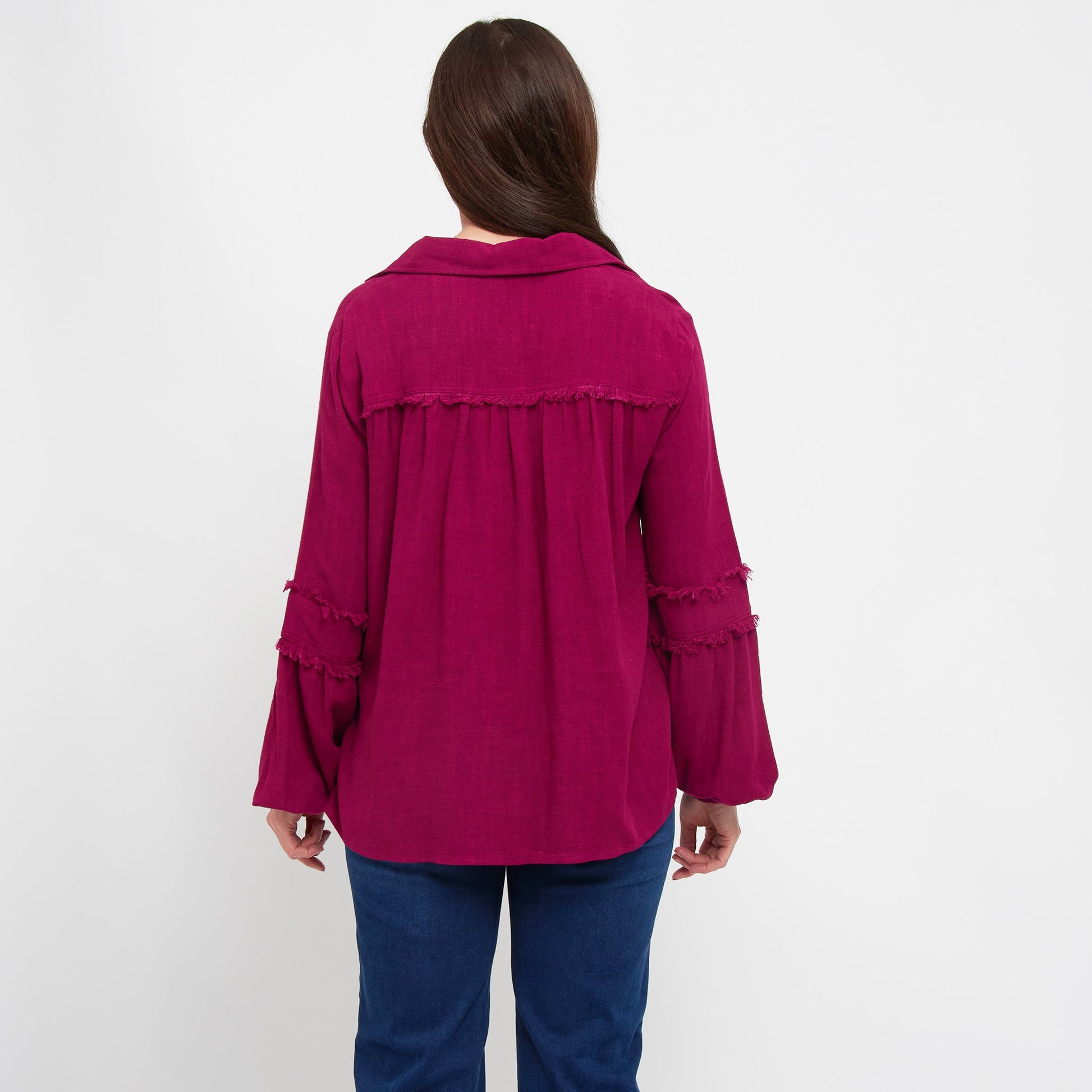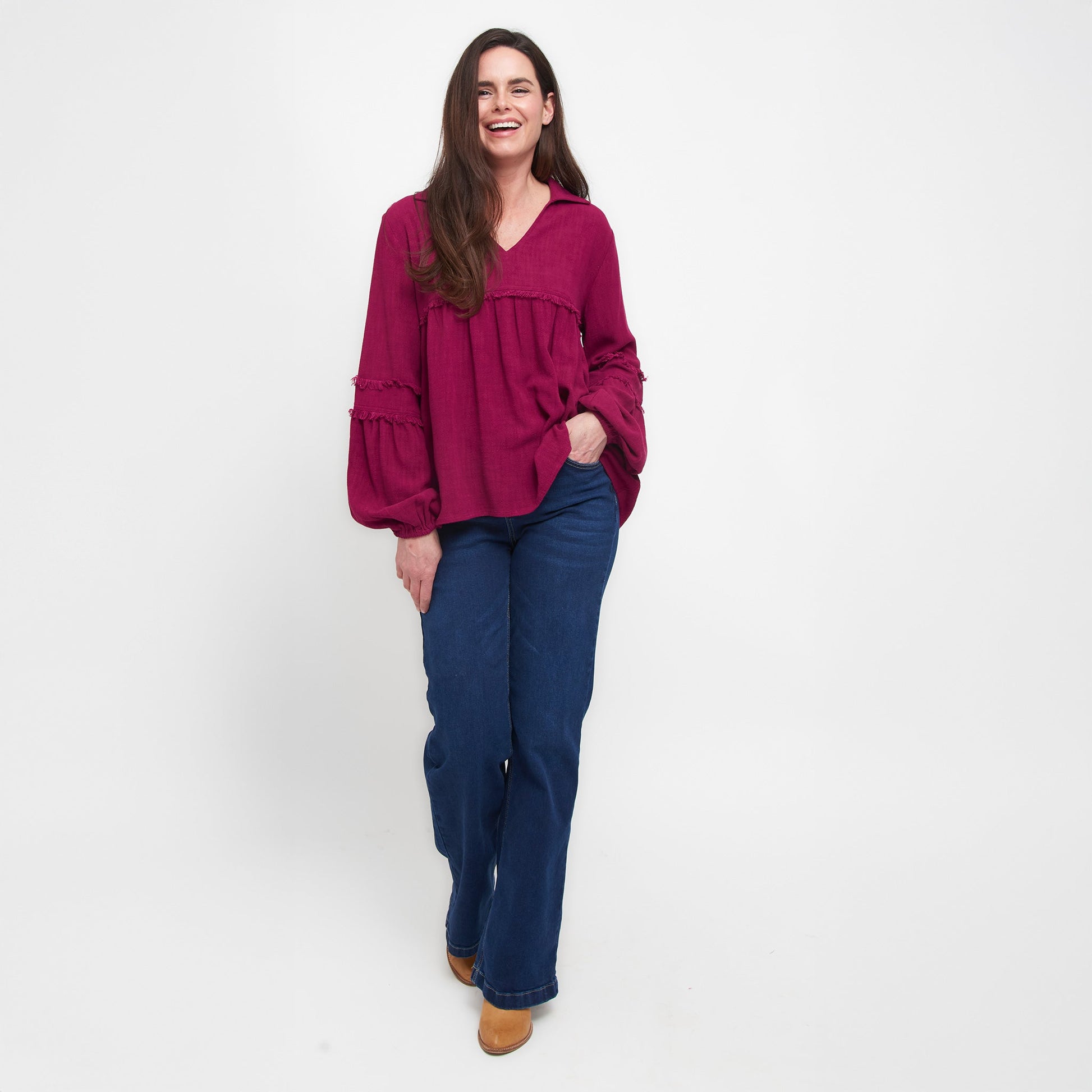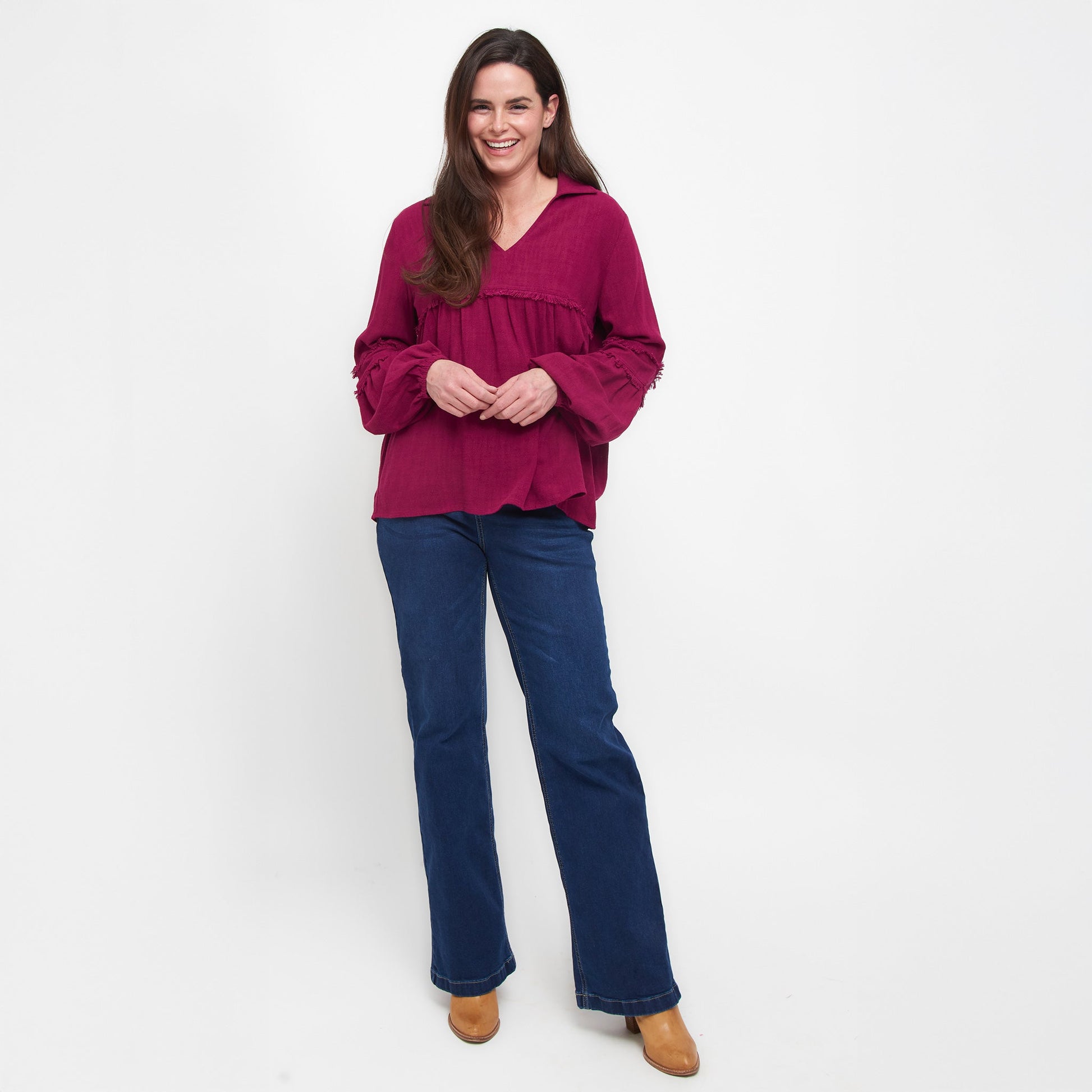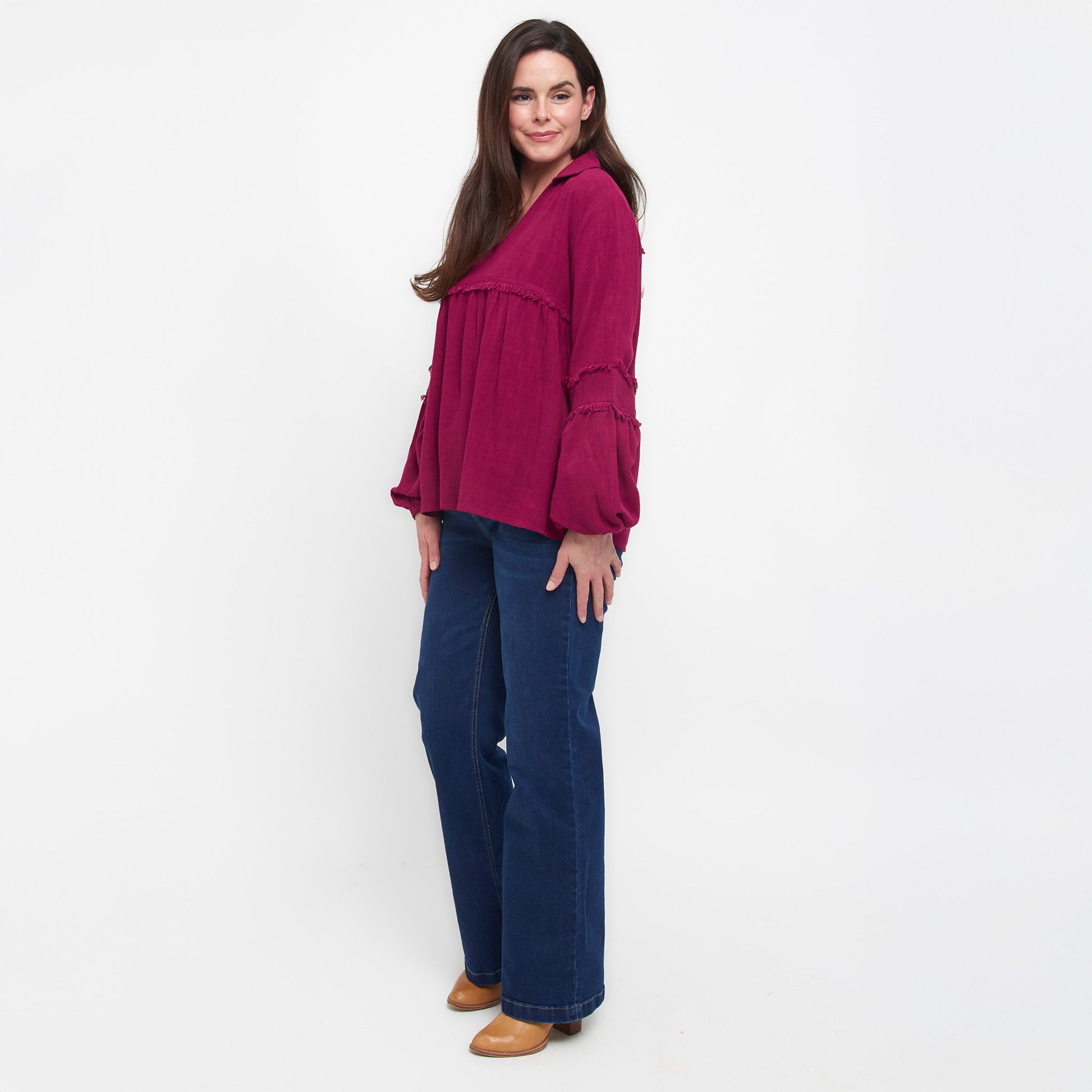 Update your wardrobe with the Blayke Babydoll Blouse. Featuring a soft linen blend fabric, v-neckline with a collar and classic babydoll design with frayed hem accents, this blouse will keep you feeling chic and cozy all season long.