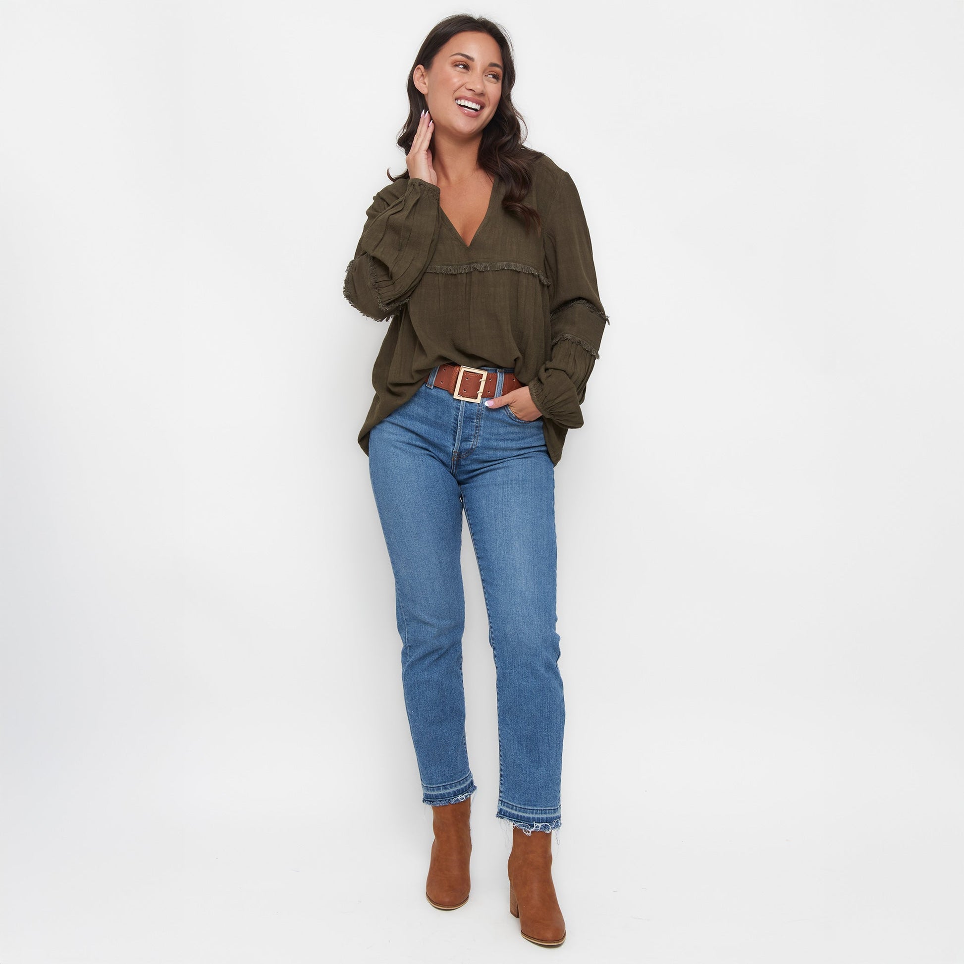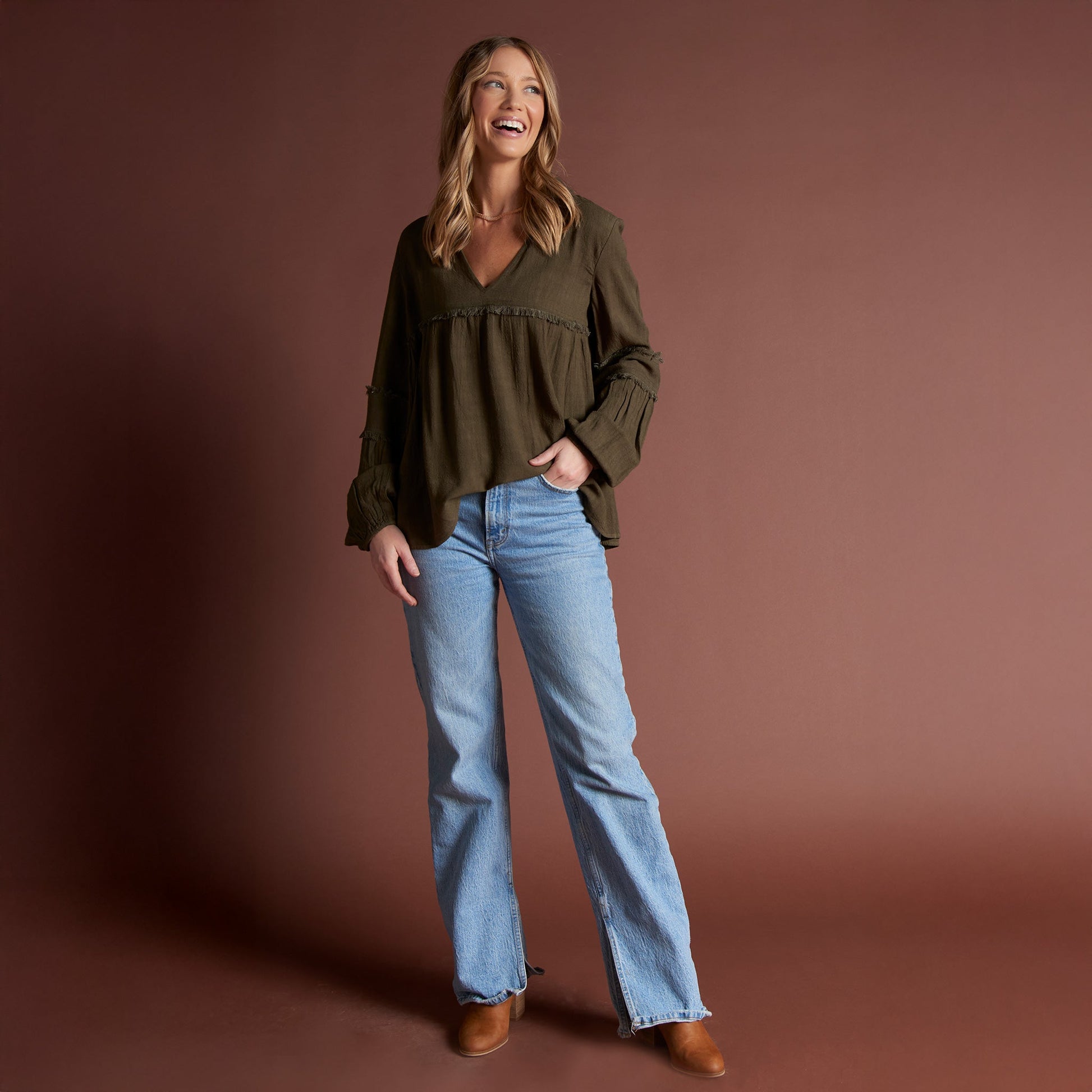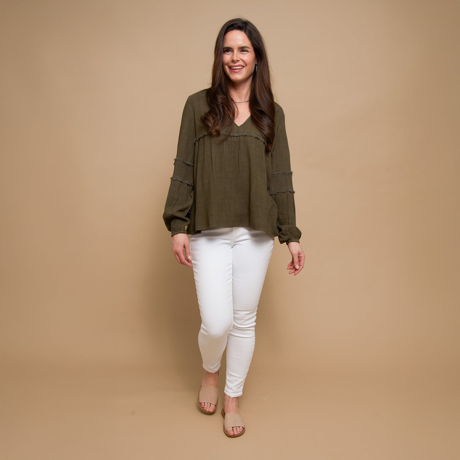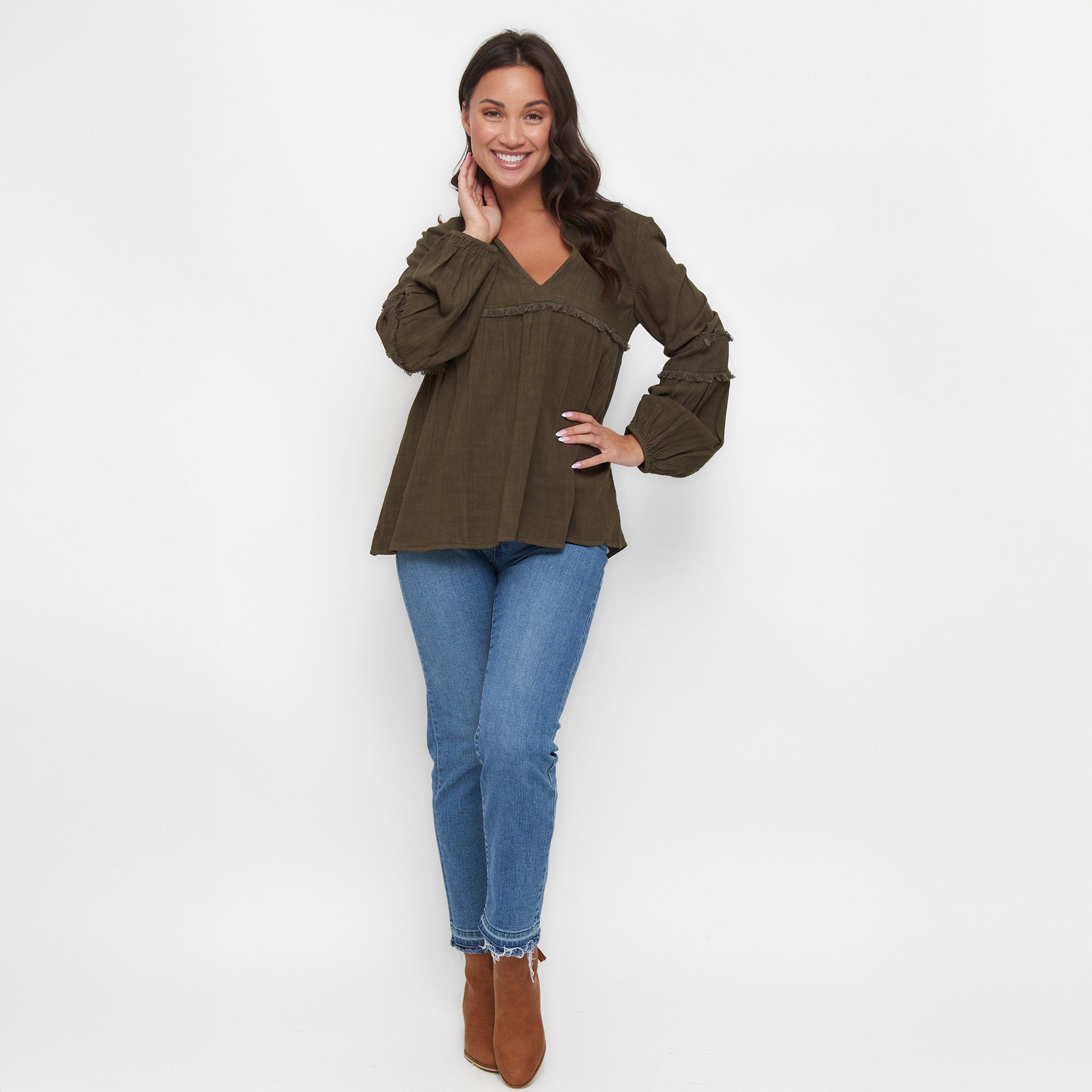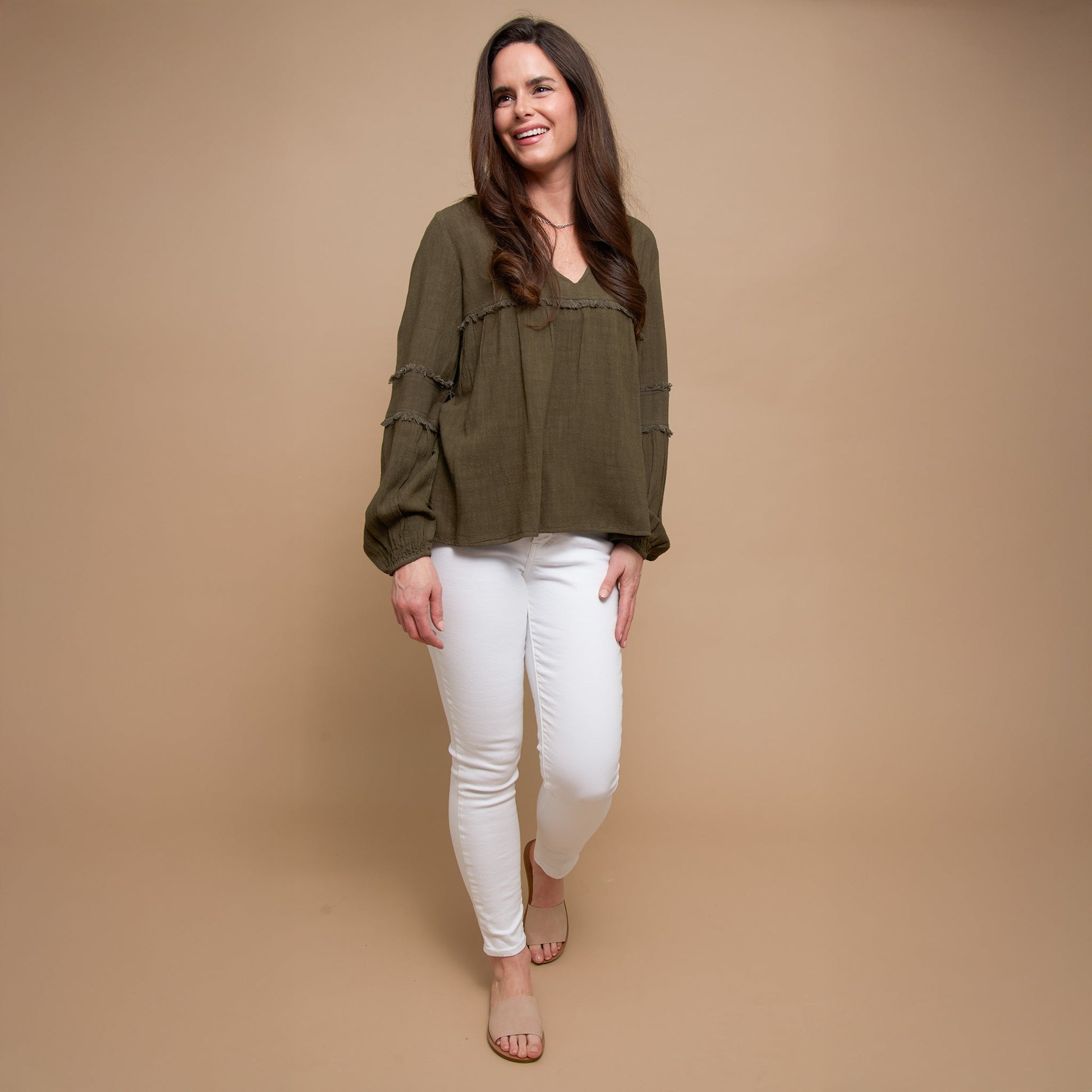 Update your wardrobe with the Blayke Babydoll Blouse. Featuring a soft linen blend fabric, v-neckline with a collar and classic babydoll design with frayed hem accents, this blouse will keep you feeling chic and cozy all season long.