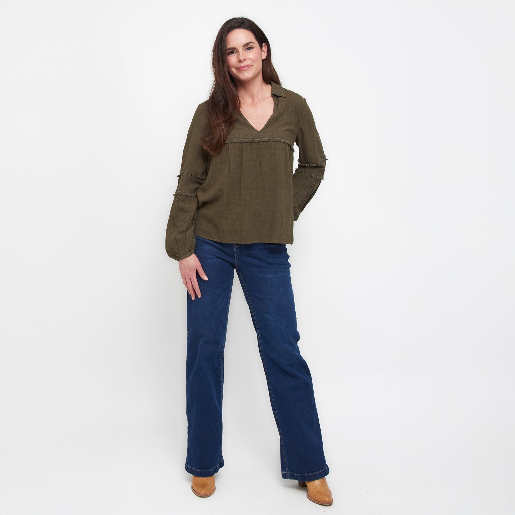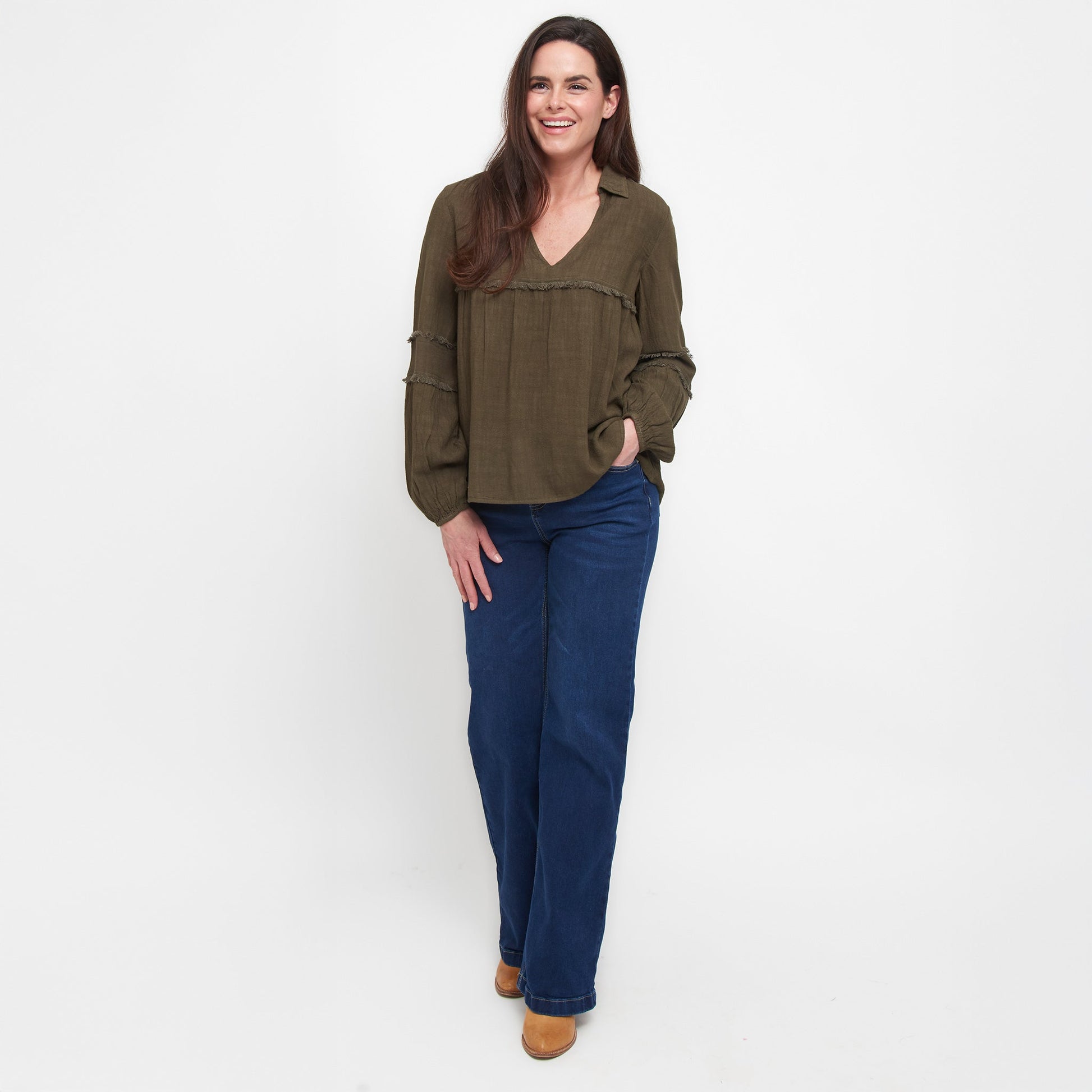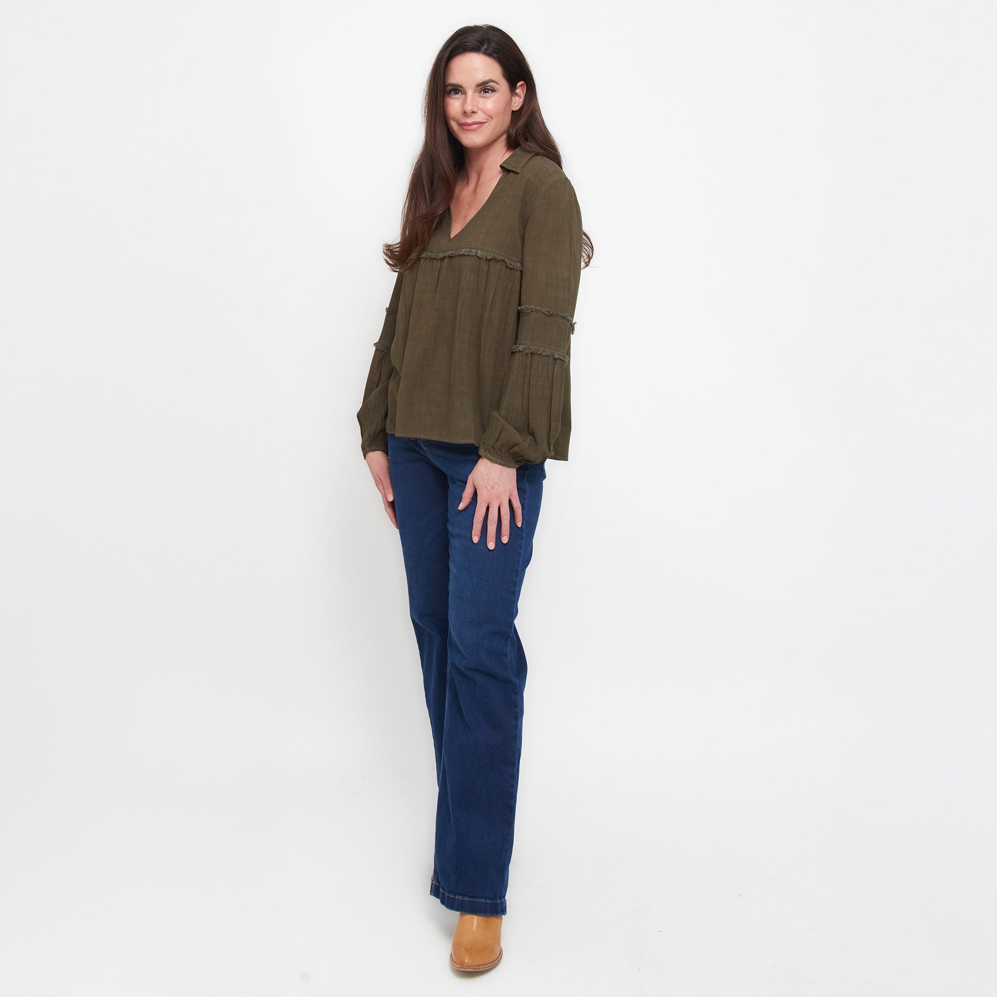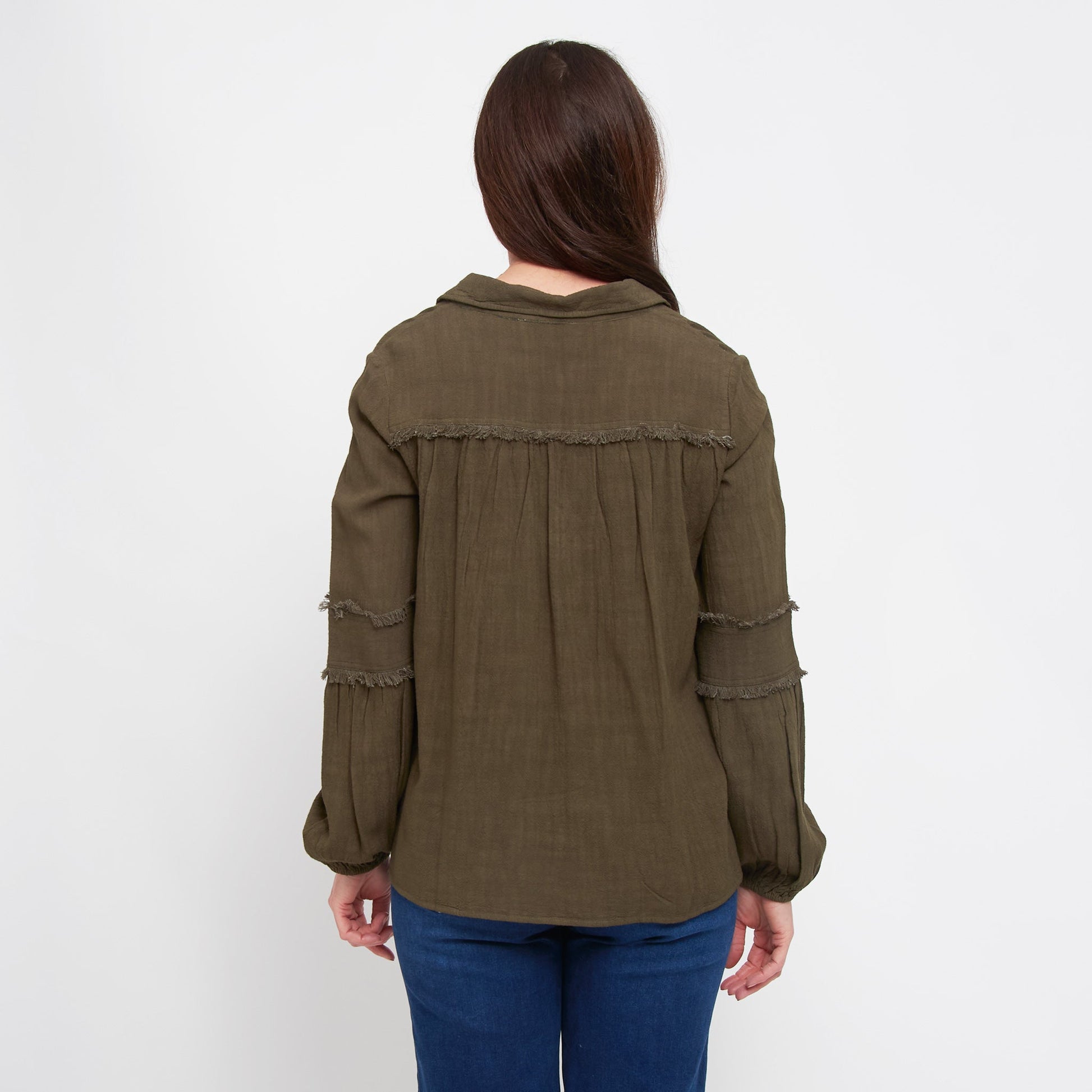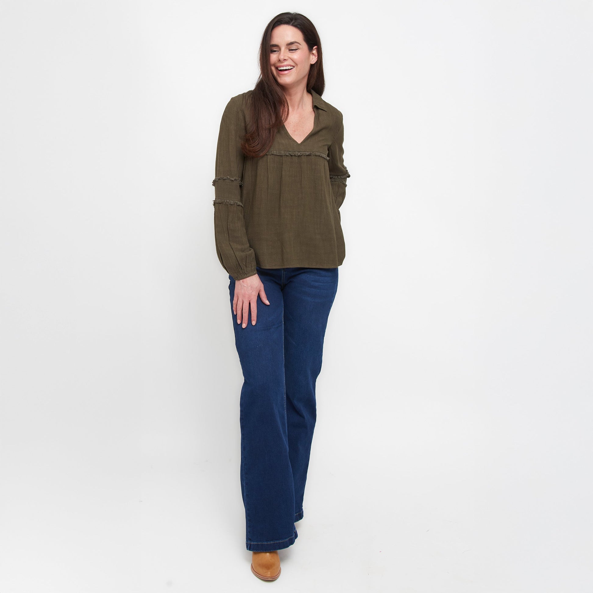 Update your wardrobe with the Blayke Babydoll Blouse. Featuring a soft linen blend fabric, v-neckline with a collar and classic babydoll design with frayed hem accents, this blouse will keep you feeling chic and cozy all season long.
