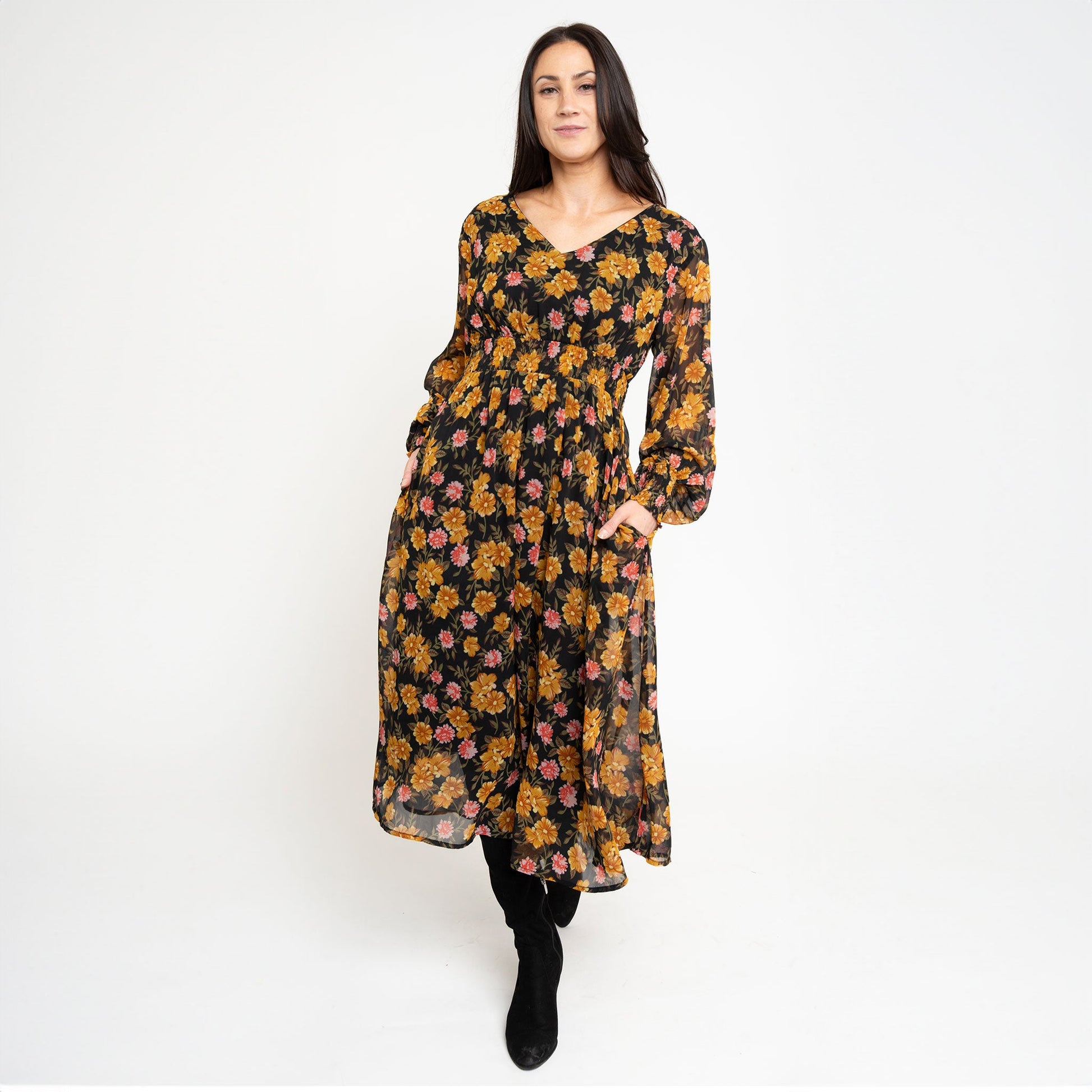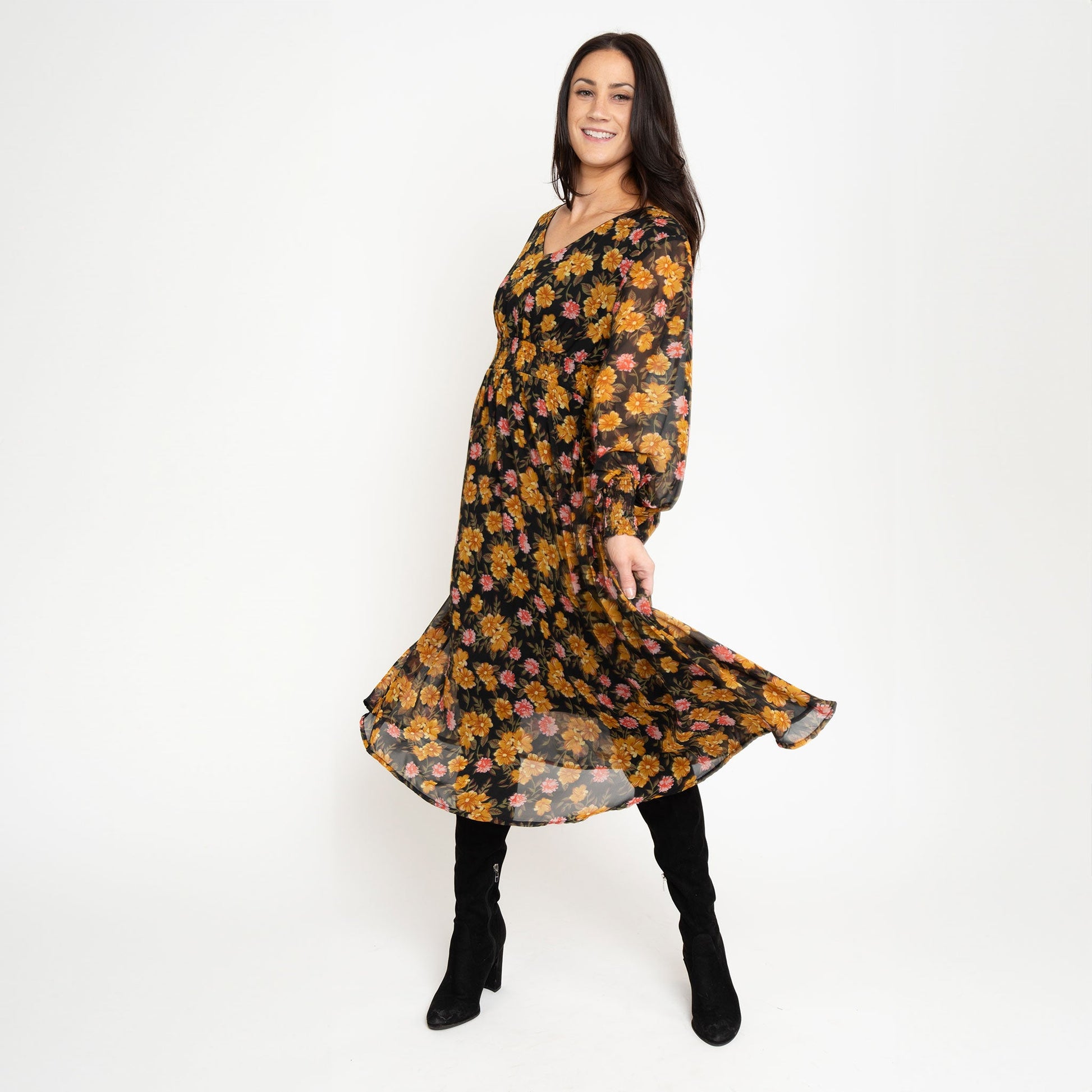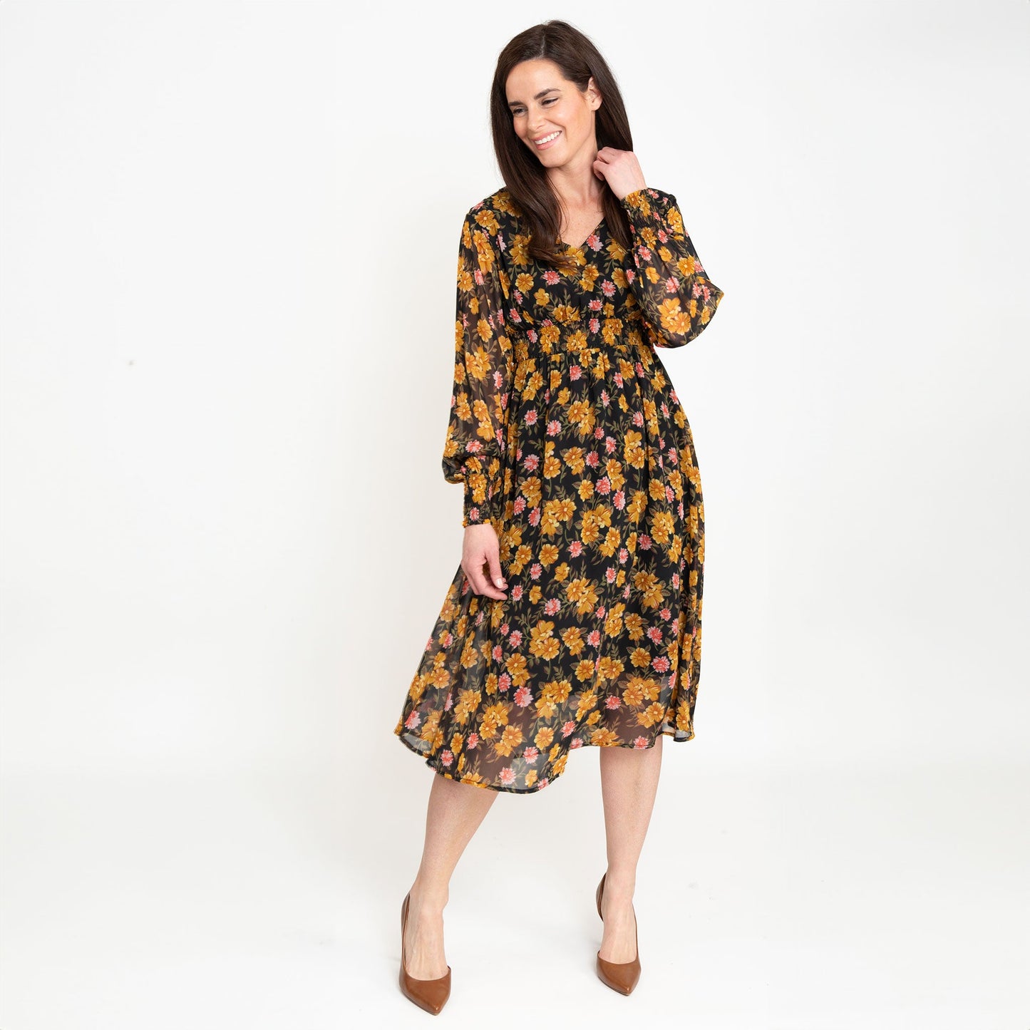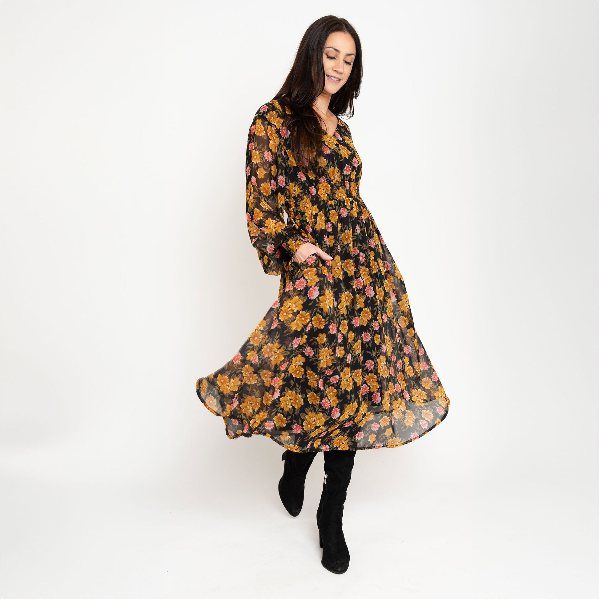 Chic in floral! Featuring a flattering v-neck design, gorgeous midi silhouette, side pockets, all in a vibrant marigold floral pattern, the Brett Midi Dress is easy to style and easy to love.