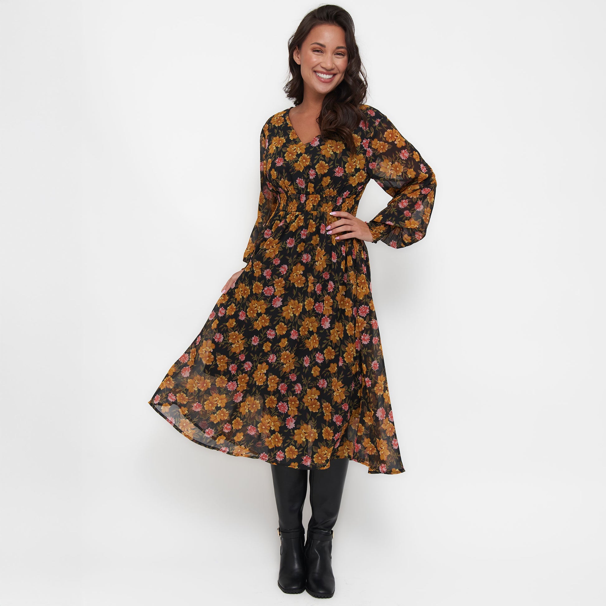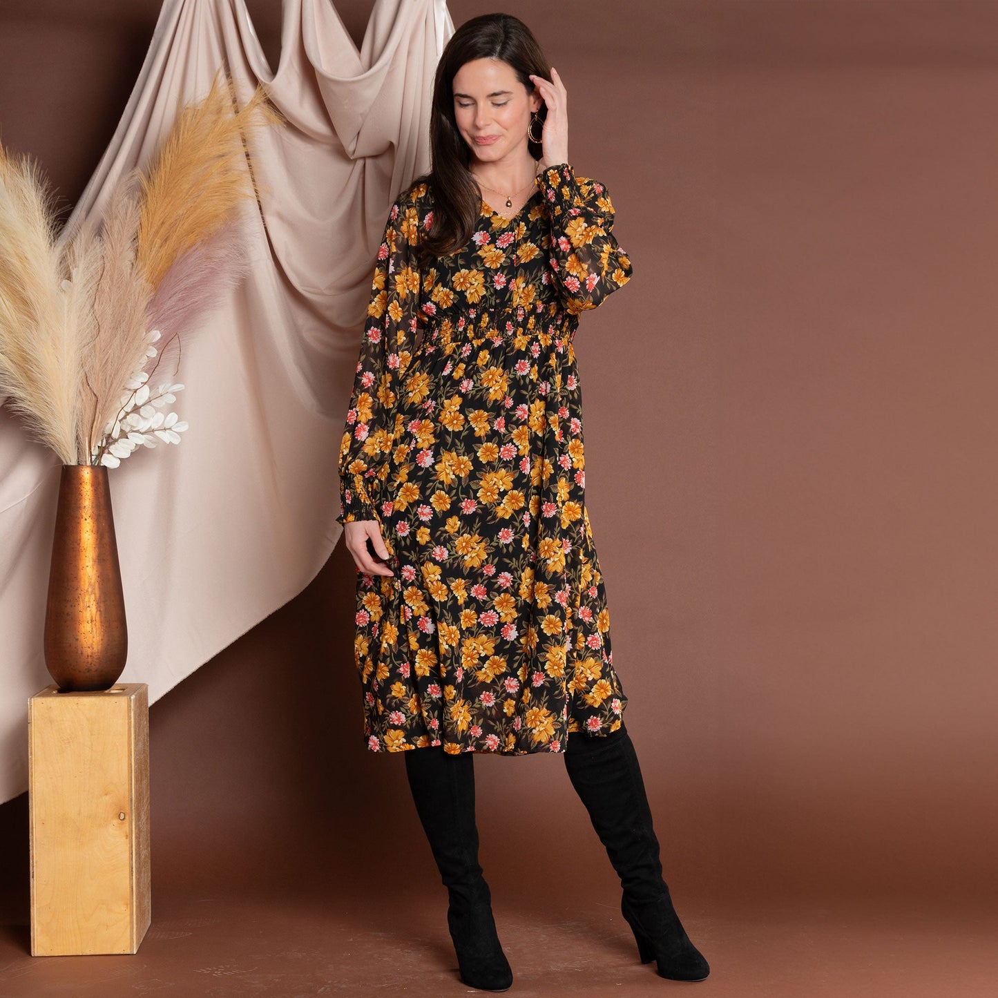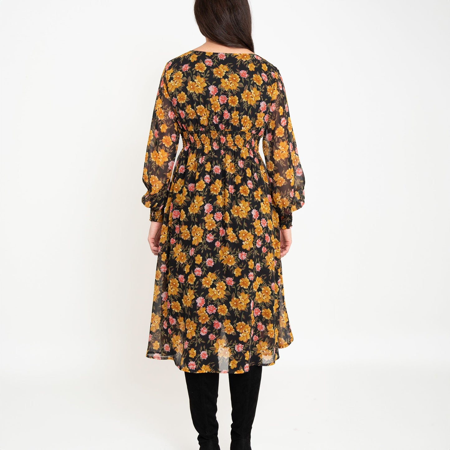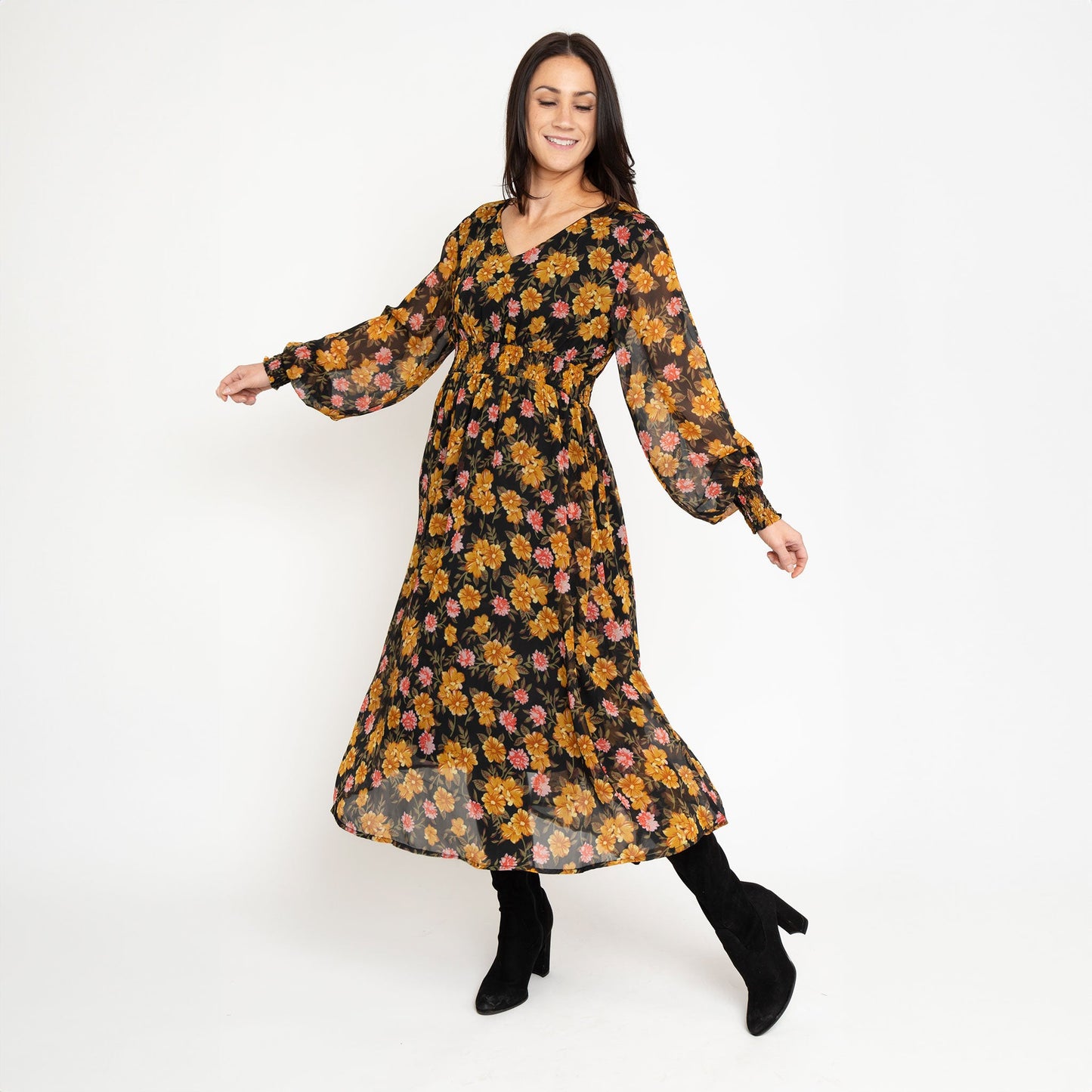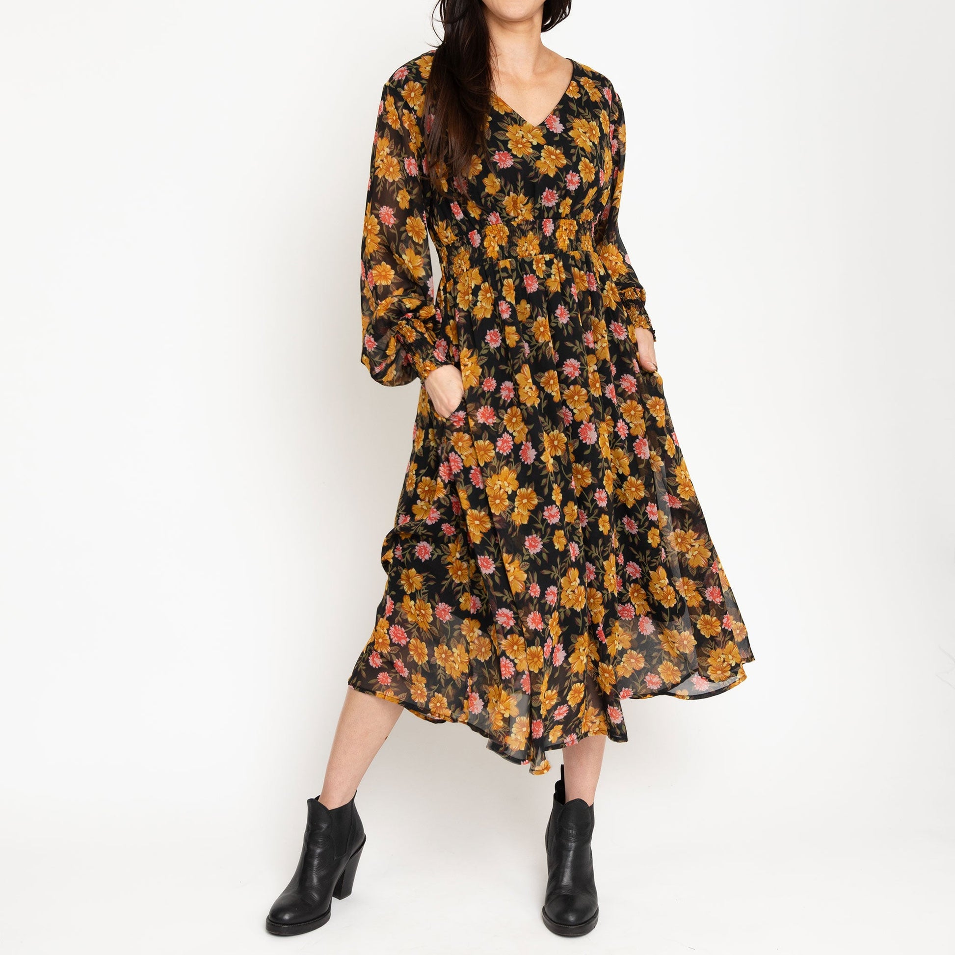 Chic in floral! Featuring a flattering v-neck design, gorgeous midi silhouette, side pockets, all in a vibrant marigold floral pattern, the Brett Midi Dress is easy to style and easy to love.