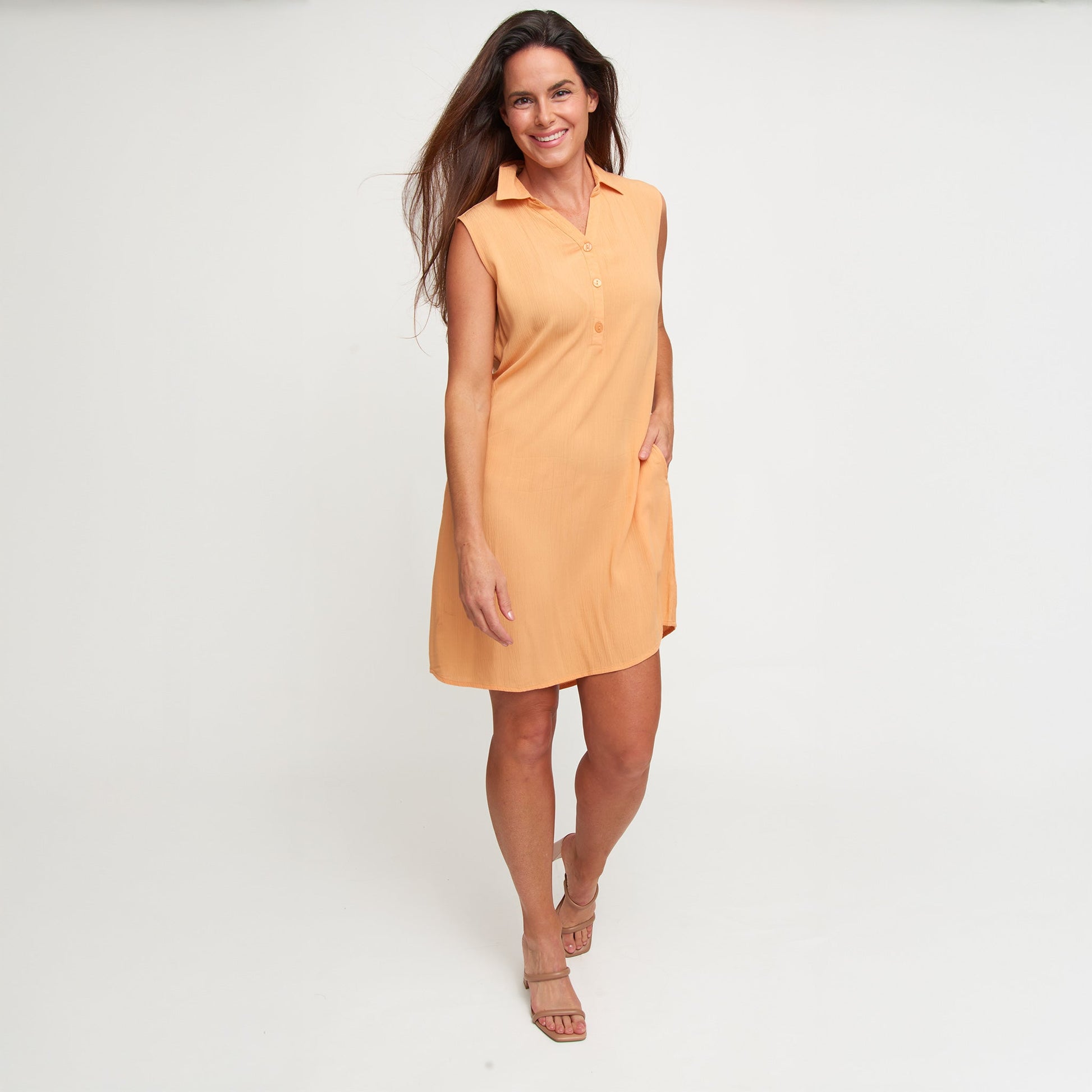 Classic, cool, and effortlessly wearable — the Camille Sleeveless Dress is your go-to for warm-weather sophistication. Crafted from soft, breathable rayon crepe, this dress drapes beautifully while maintaining a polished, easy silhouette. The collared neckline adds a tailored touch, complemented by a functional button-front V-placket for a refined yet relaxed look. Designed with a mild high-low hemline and convenient side pockets, it blends comfort and practicality in one versatile piece. Whether you’re dressing up for brunch or keeping things casual on the weekend, this dress moves seamlessly through your day. Available in two elegant hues — Jet, a timeless black, and Peach, a sun-kissed soft orange — the Camille Sleeveless Dress pairs perfectly with sandals, wedges, or casual sneakers.
