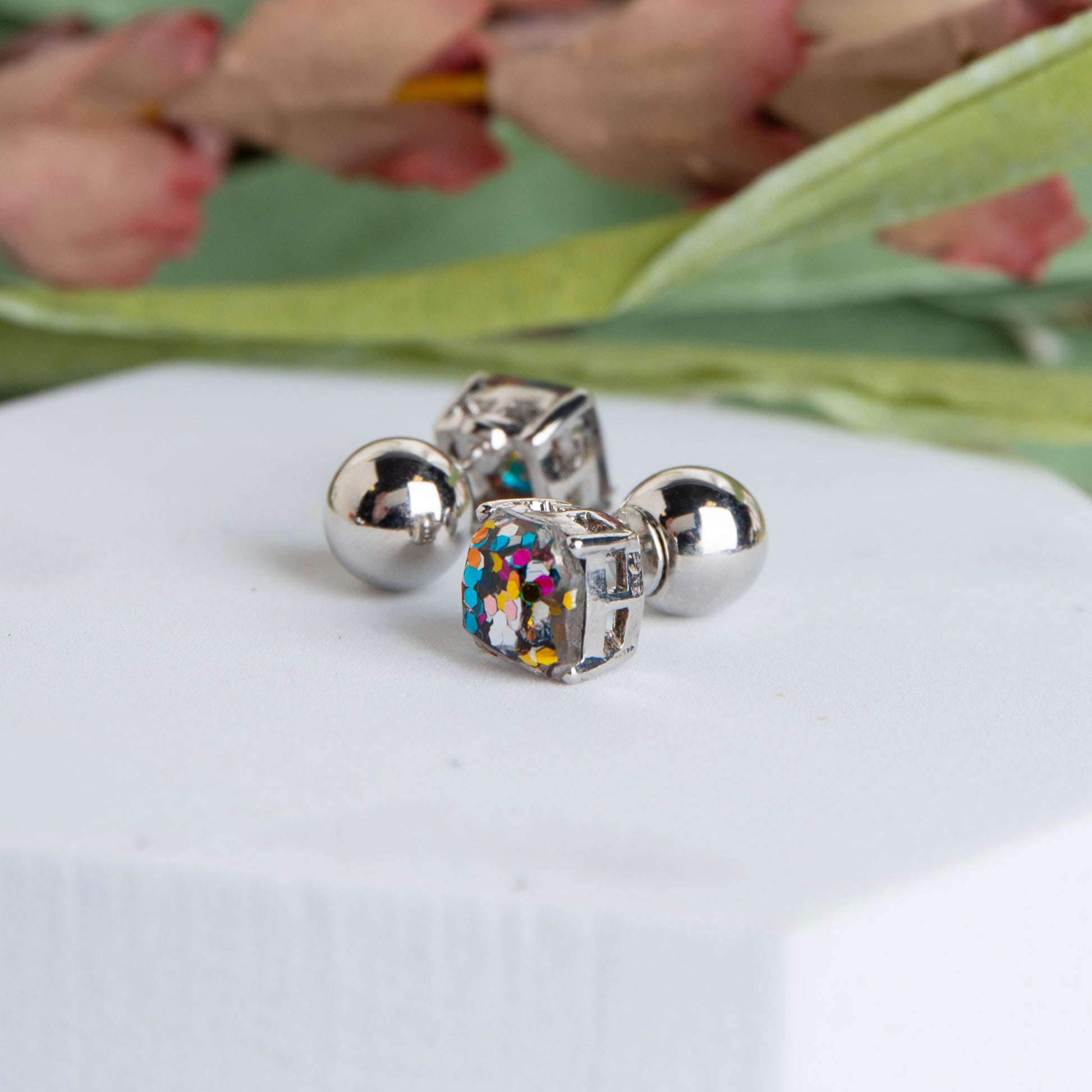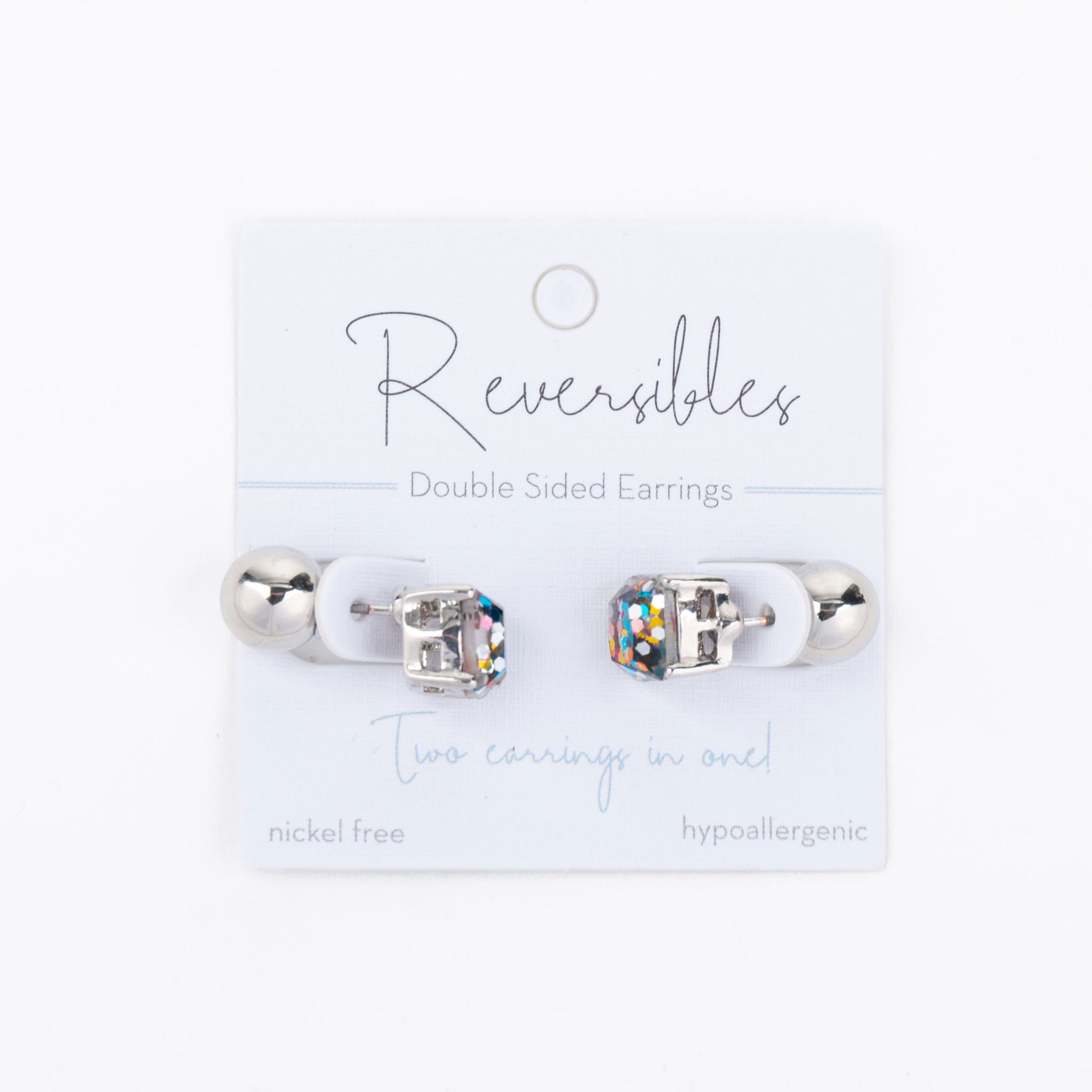 | Two ways to slay! Featuring a vibrant epoxy confetti detailing on one side and silver bead on the other, the Confetti & Bead Reversible Earrings are simple and unique and perfect for any occasion. |
