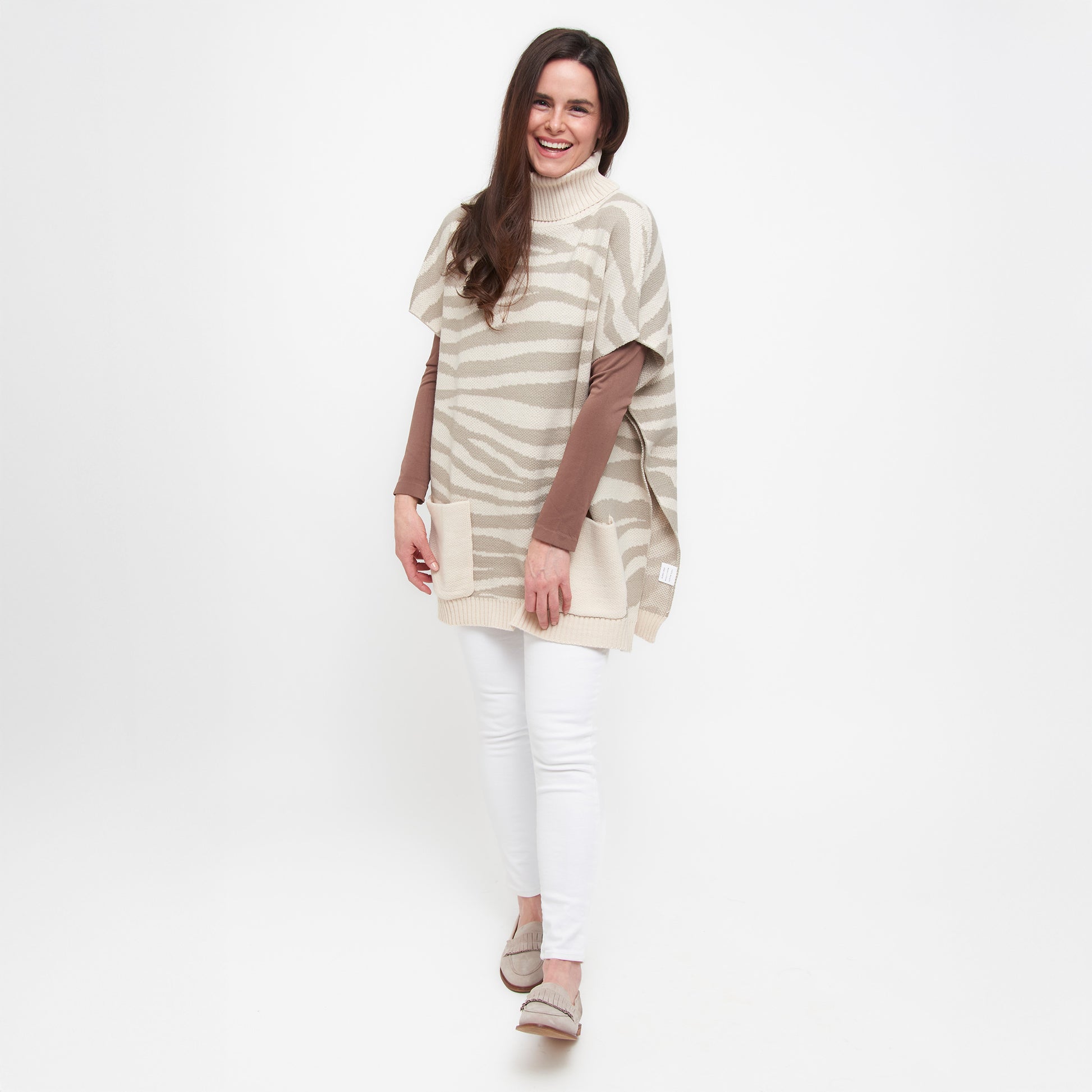 Cream Tiger Turtleneck Poncho With Patch Pockets