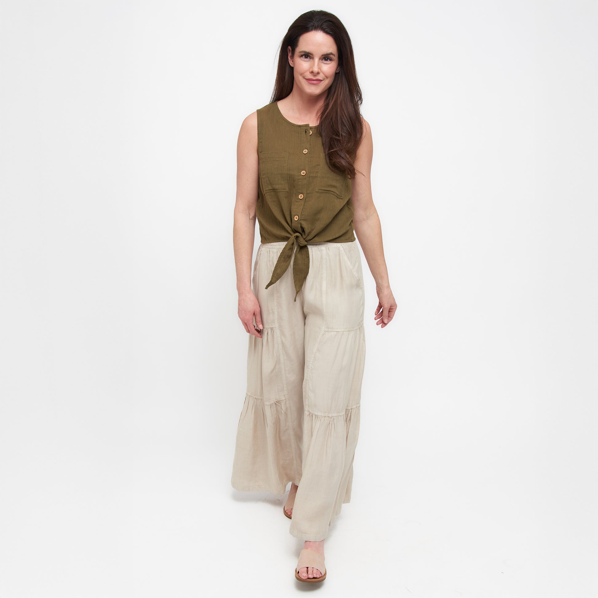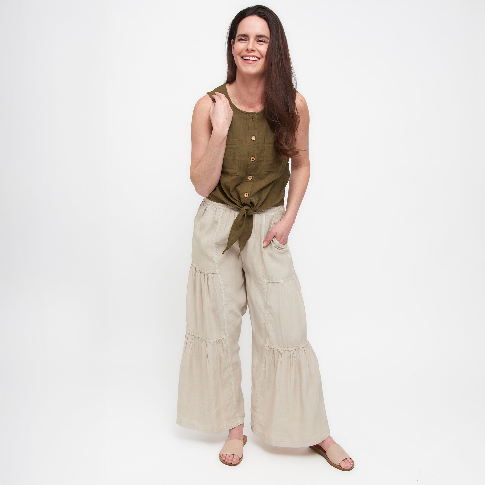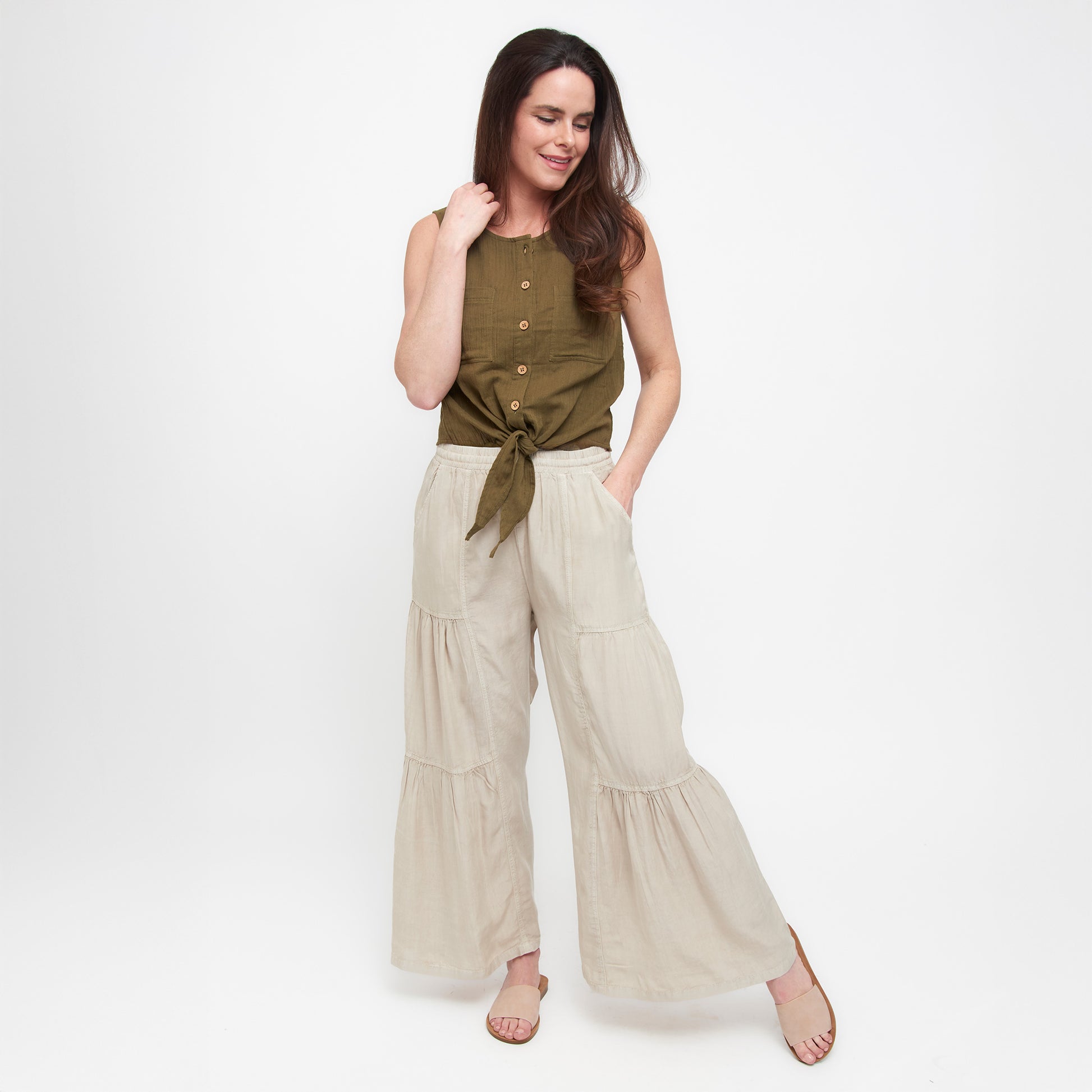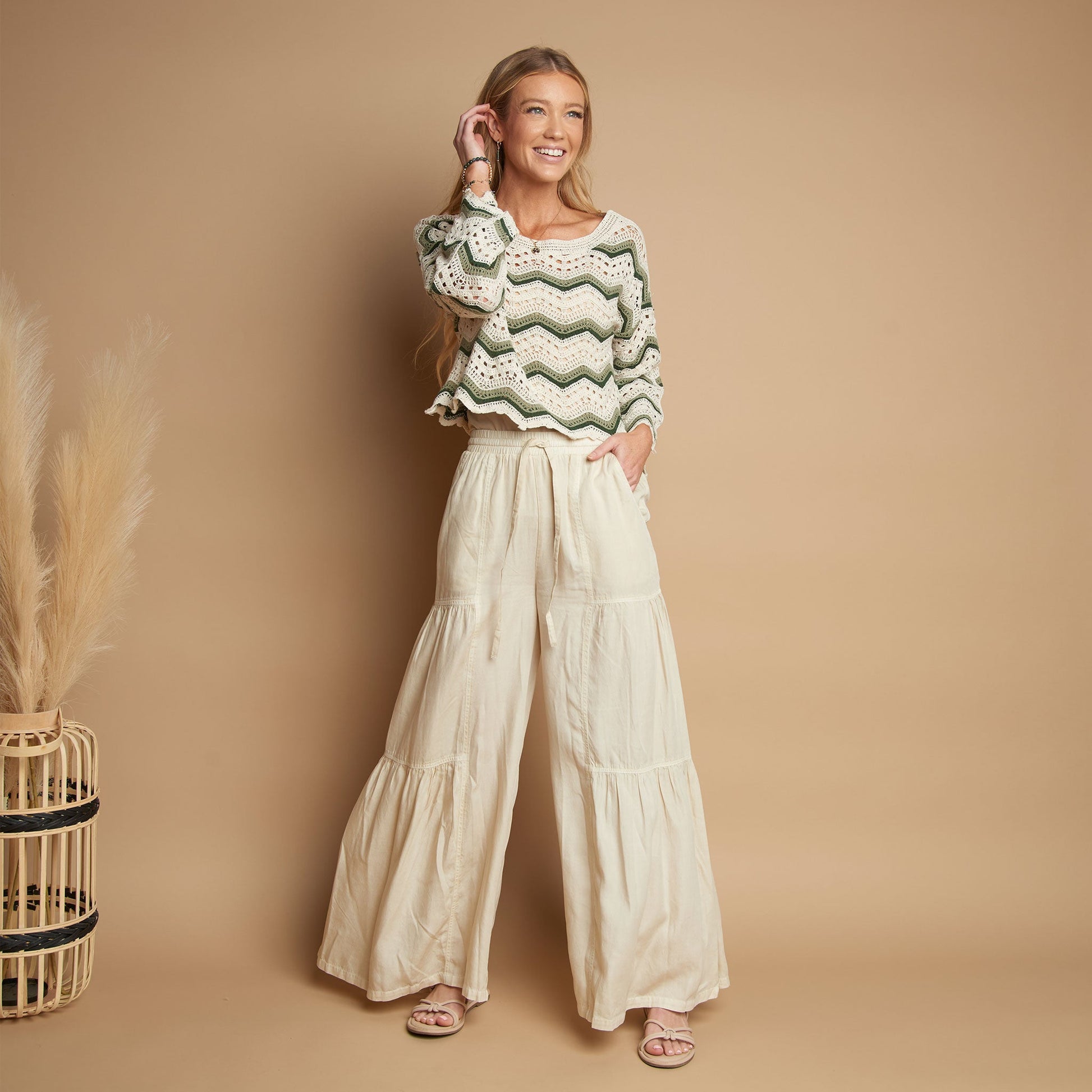 Trendy and so comfortable! The Delaney Wide Leg Tiered Chambray Pants features a lightweight Lyocell fabric with an oversized, tiered wide leg opening, elastic waistband and drawstring tie. Pair them with your favorite tee or tank for an easy, effortless look!