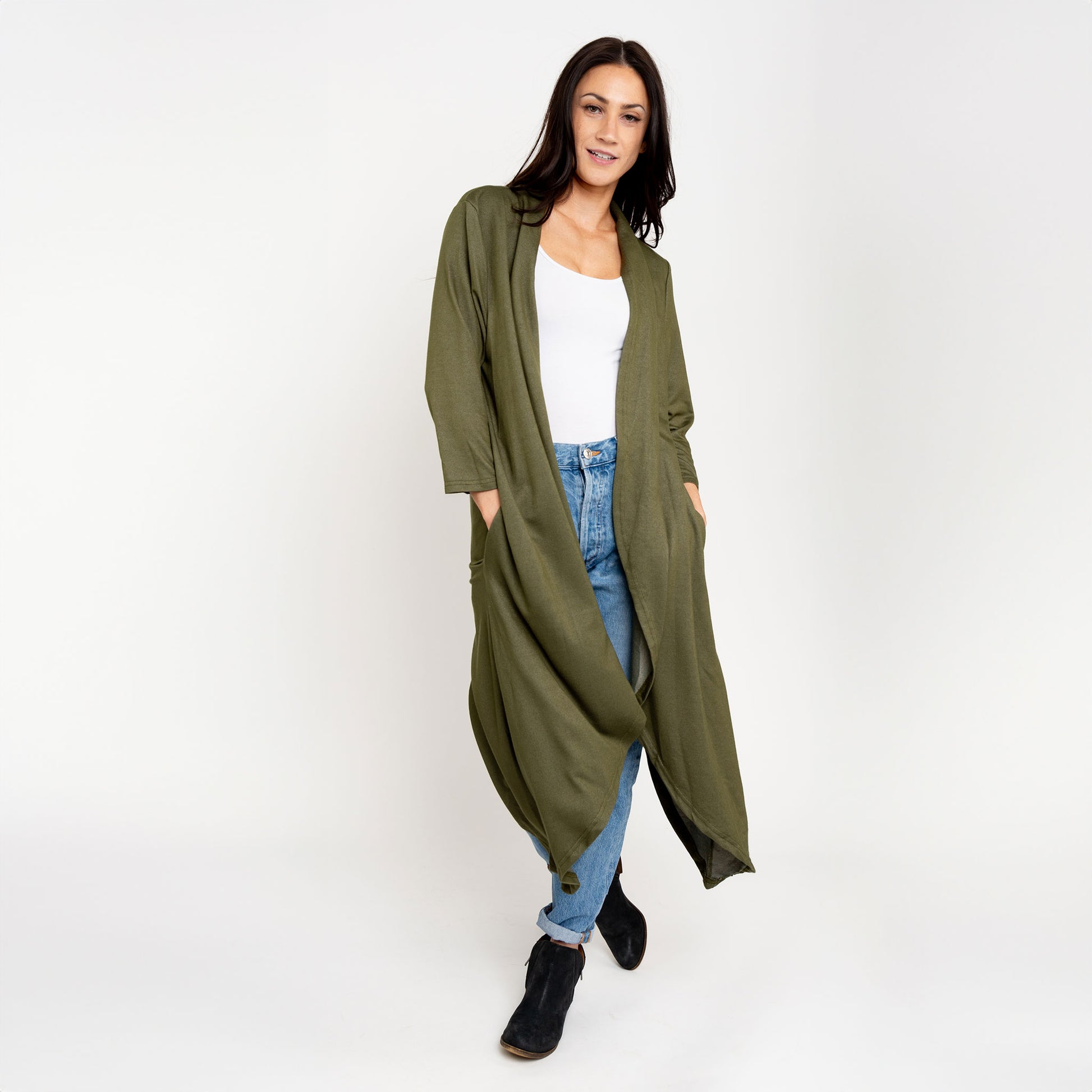 Stay cozy and cute with this must-have cardigan. Featuring a soft, stretch knit denim fabric, flattering waterfall shape, long length, and pockets, the Diana Cardigan is certain to become a staple.