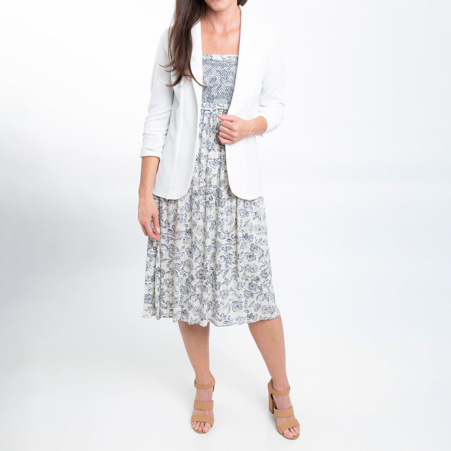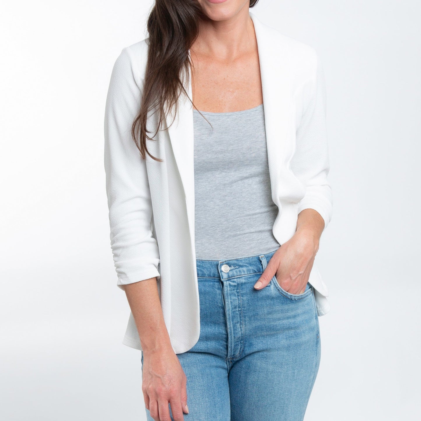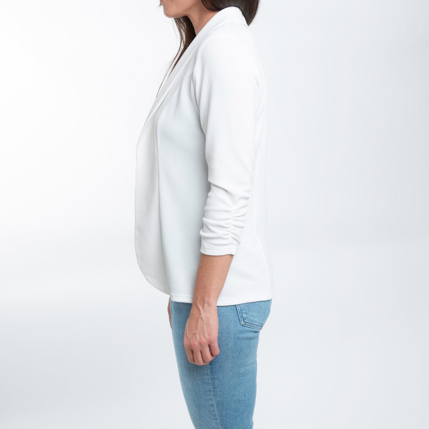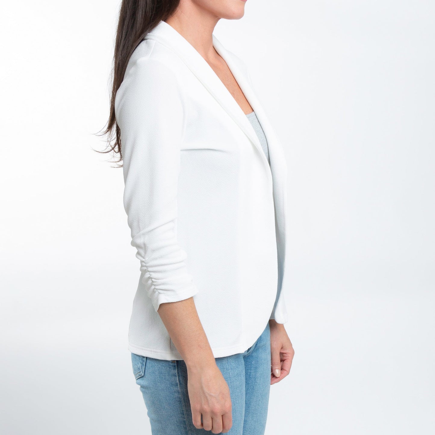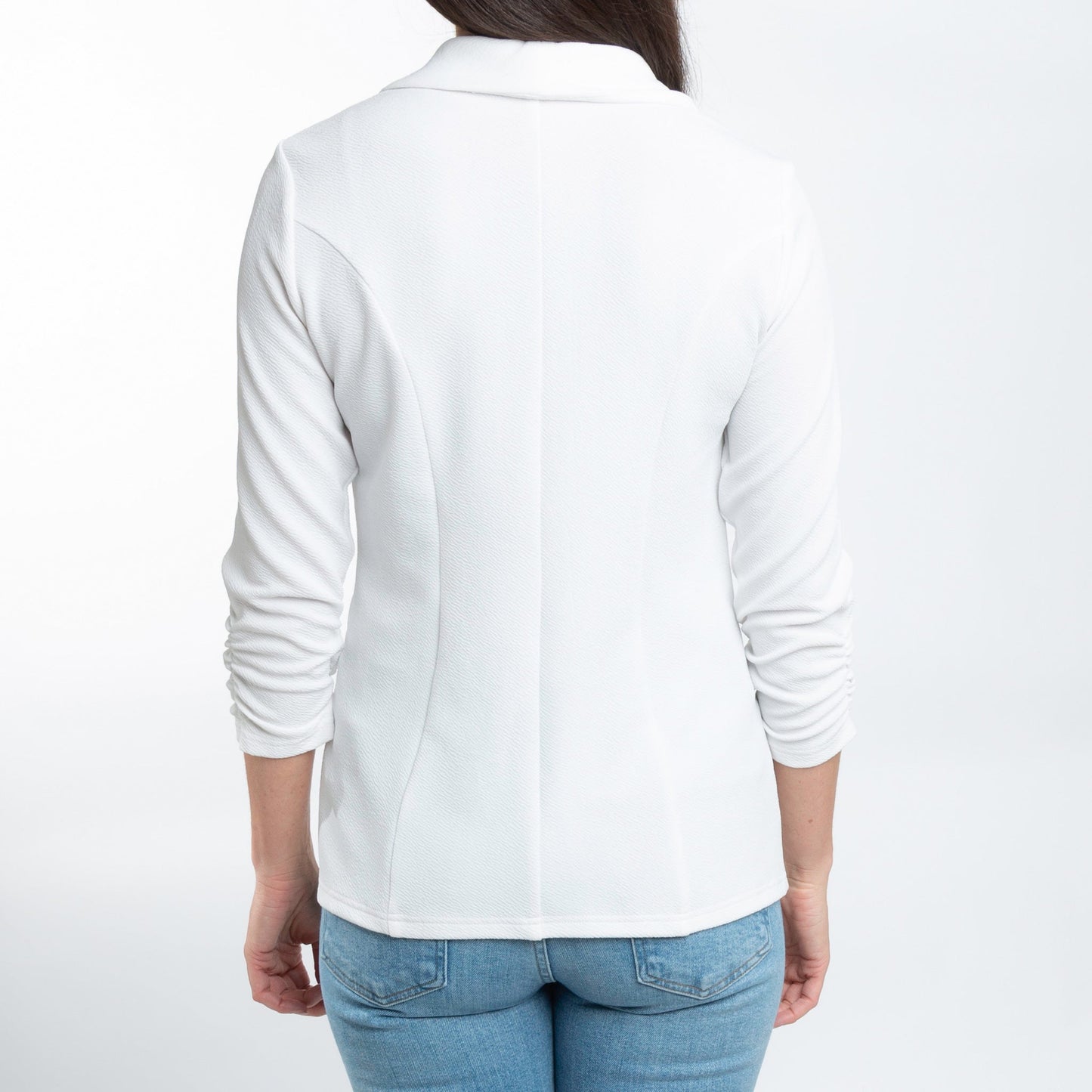 Dress any outfit up with the Dove Ruched Stretch Blazer. Featuring a gorgeous white ruched crepe fabric with 3/4 sleeves and structured collar, this stretchy blazer is both comfortable and chic.