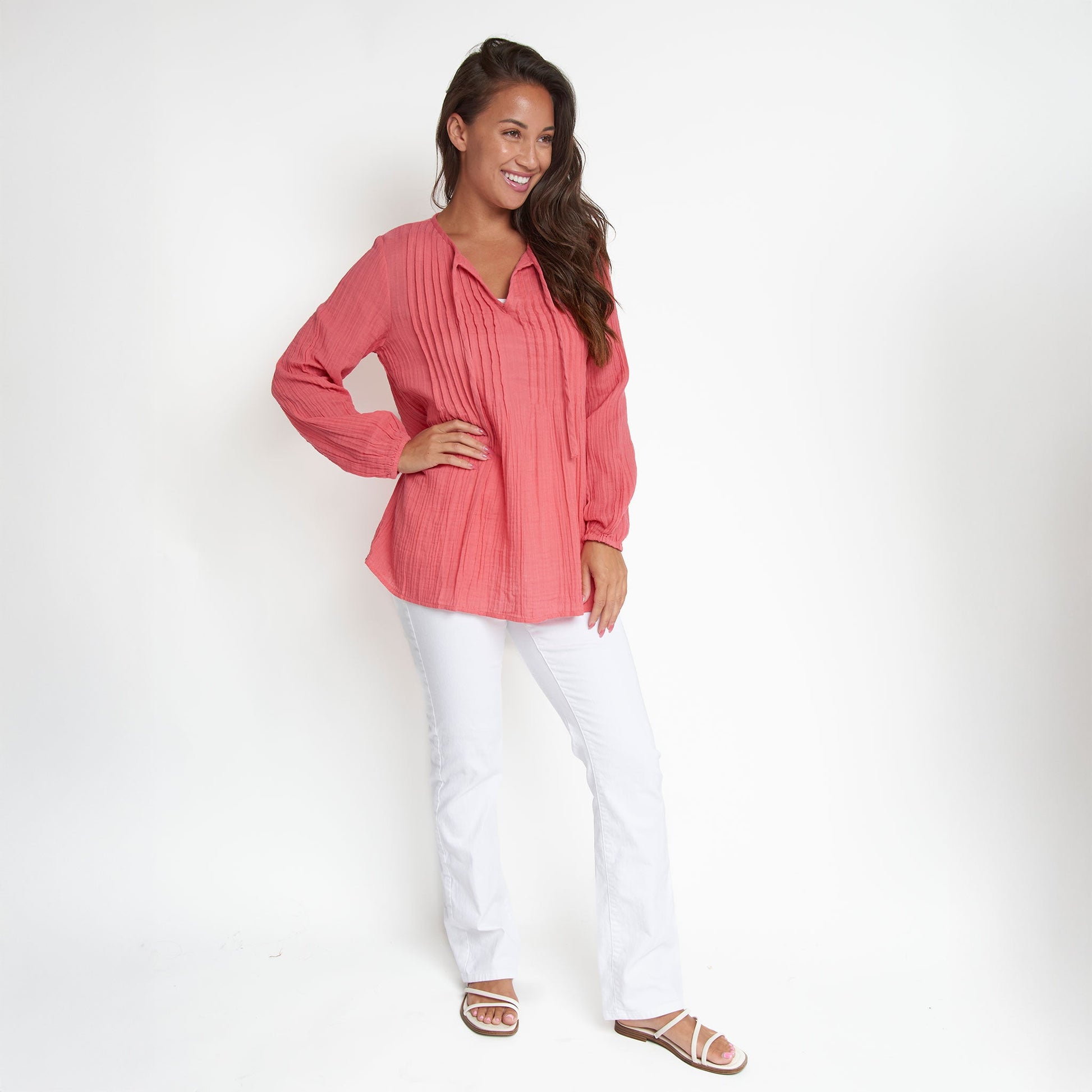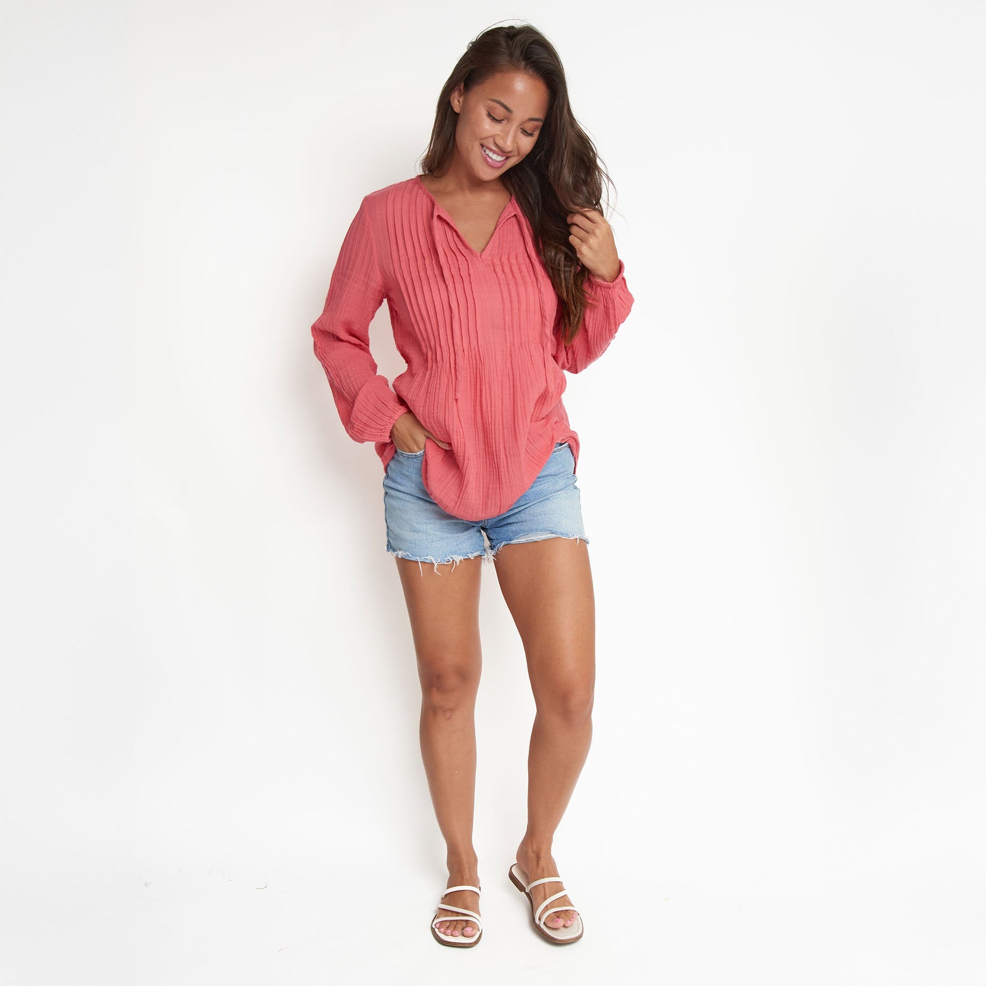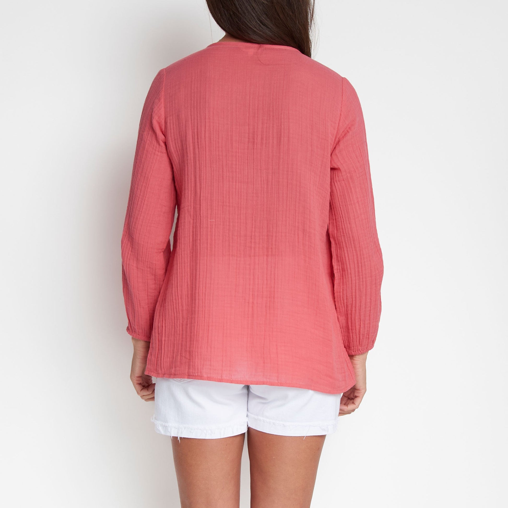 Cute and comfortable, the Eisley Gauze V-Neck Tunic features lightweight cotton gauze in a vibrant coral with long sleeves, tie detailing, and relaxed fit. Style it with your favorite jeans or shorts for an easy, effortless look.