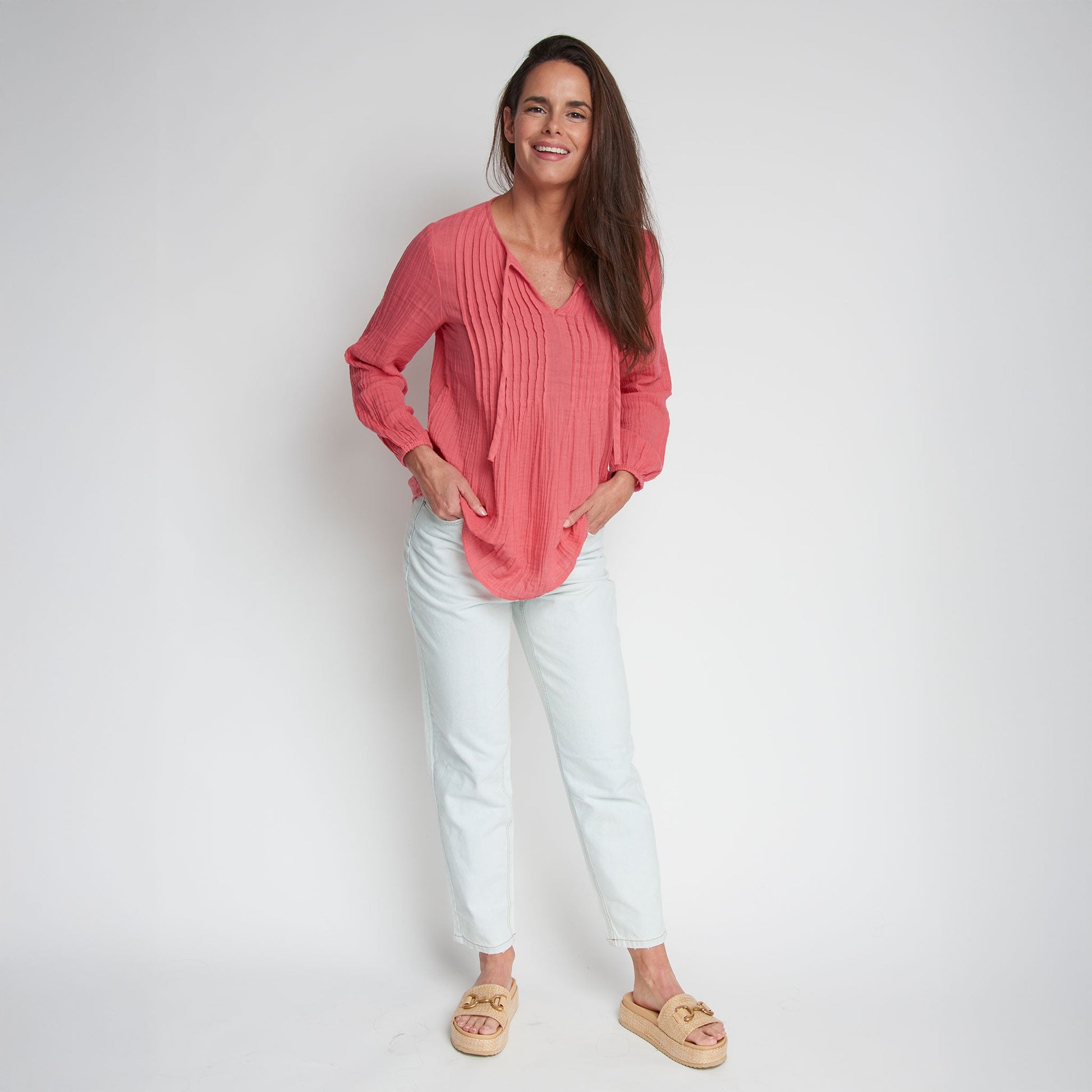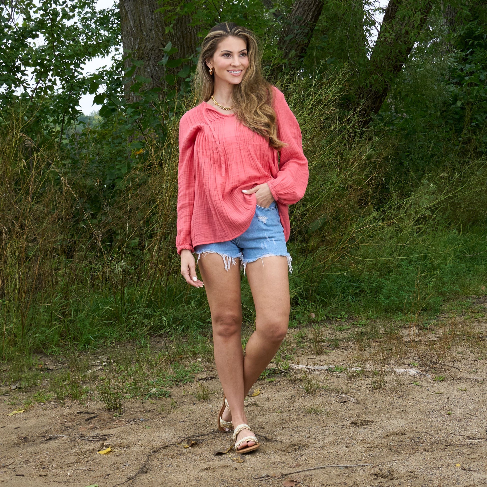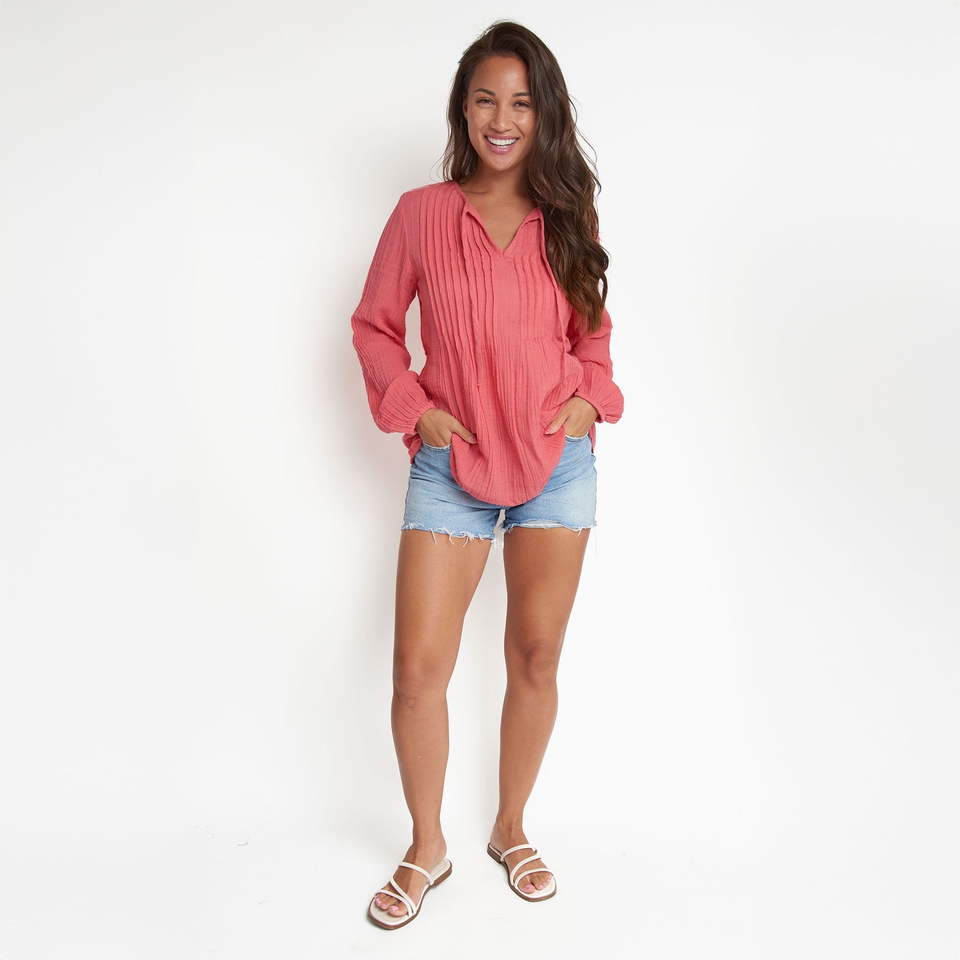 Cute and comfortable, the Eisley Gauze V-Neck Tunic features lightweight cotton gauze in a vibrant coral with long sleeves, tie detailing, and relaxed fit. Style it with your favorite jeans or shorts for an easy, effortless look.