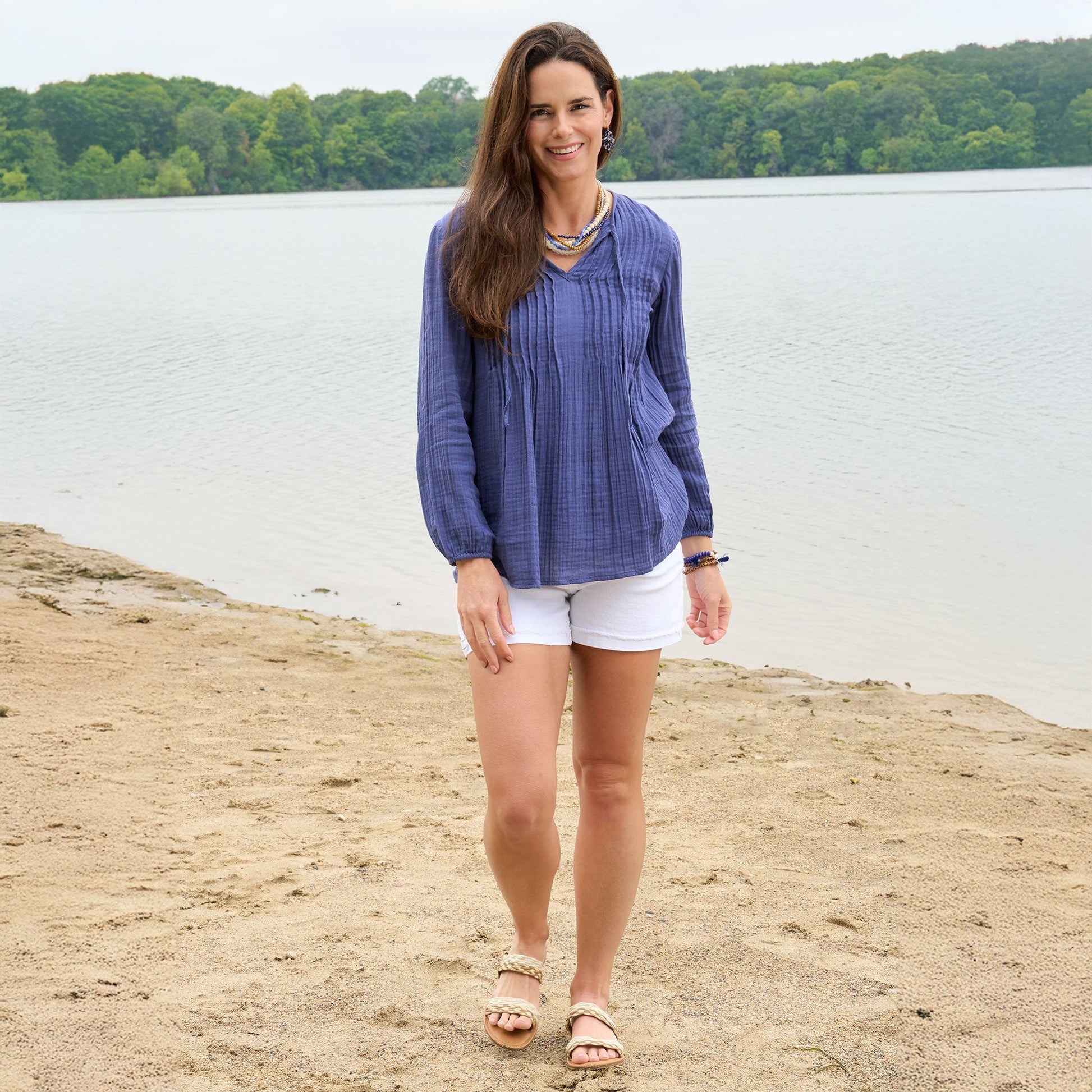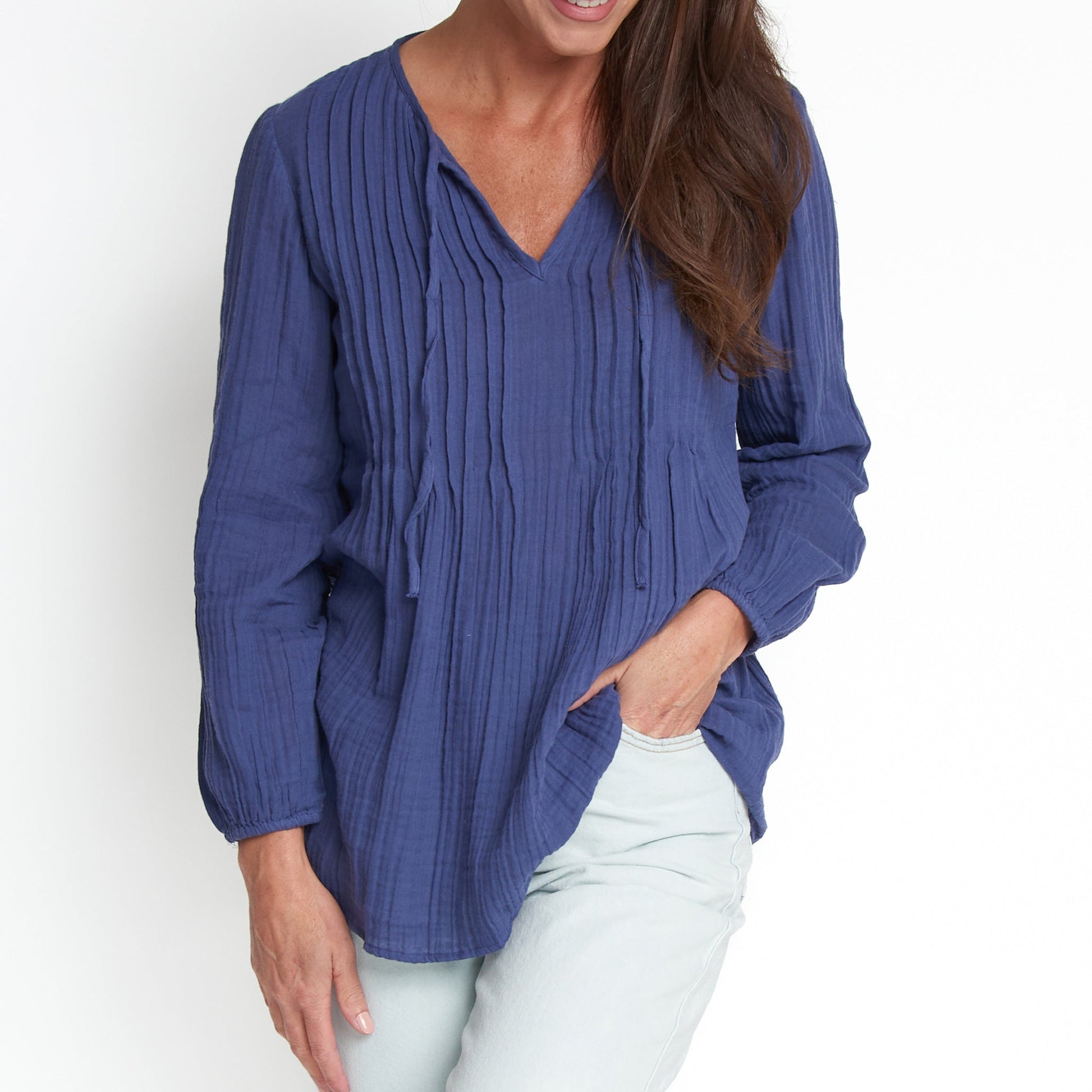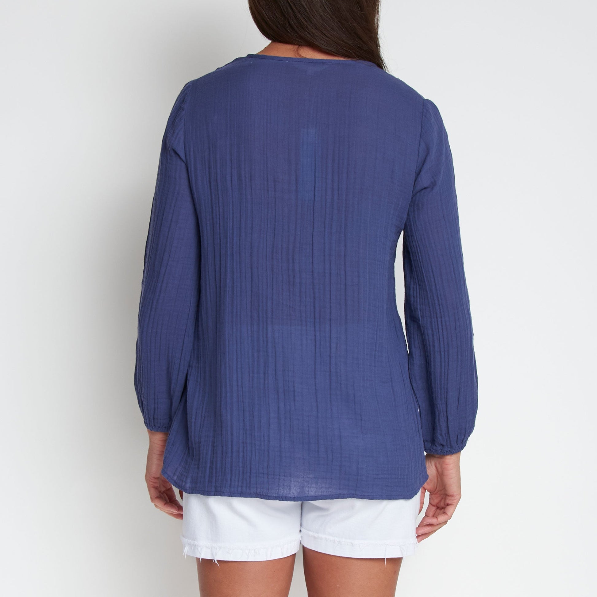 Cute and comfortable, the Eisley Gauze V-Neck Tunic features lightweight cotton gauze in a gorgeous indigo with long sleeves, tie detailing, and relaxed fit. Style it with your favorite jeans or shorts for an easy, effortless look.