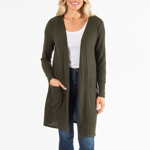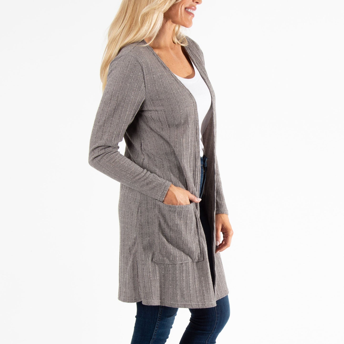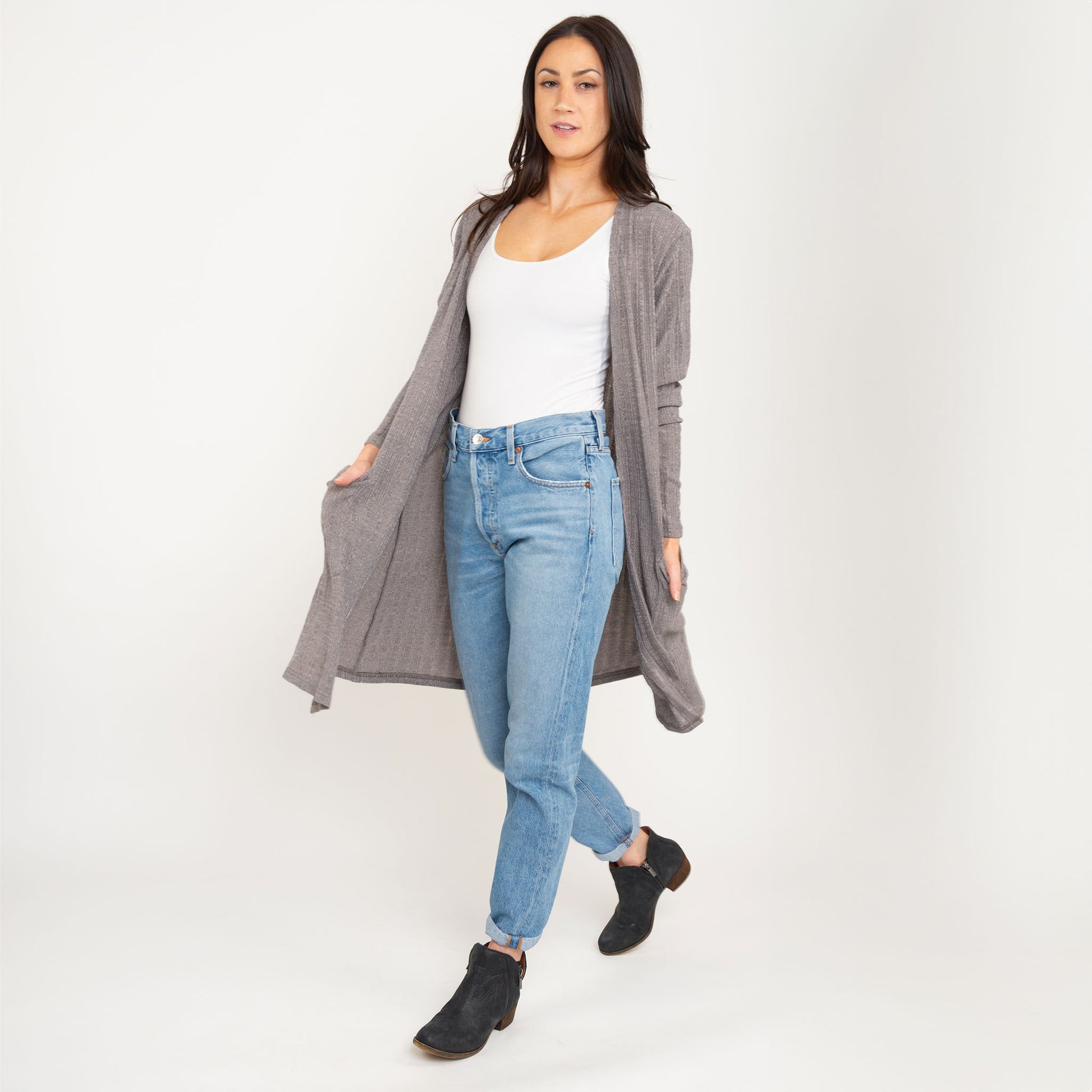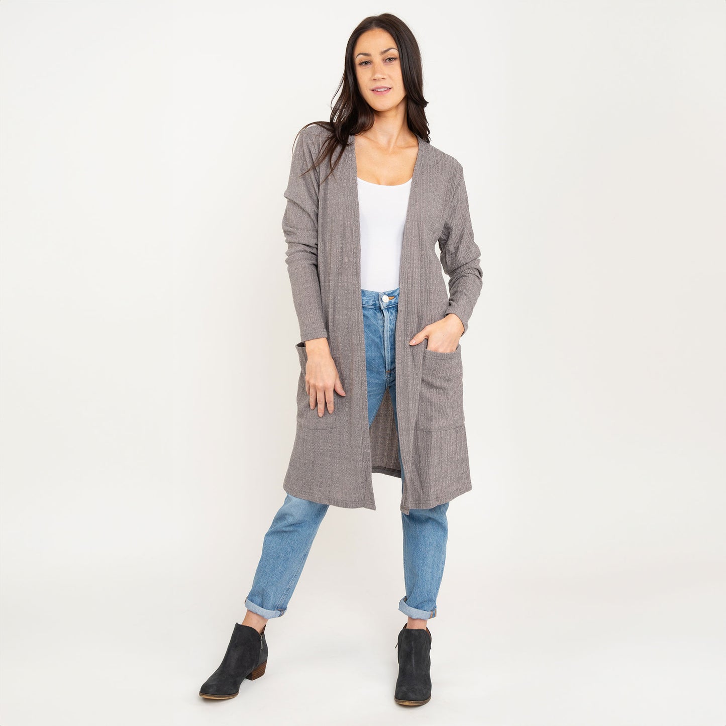 Nothing says comfort quite like the Ella Cardigan. Featuring front patch pockets, and a mid-thigh length, all in a ribbed jersey fabric, the Ella Cardigan easily adds warmth to your favorite t-shirt and jeans outfit, or to your favorite dress.
