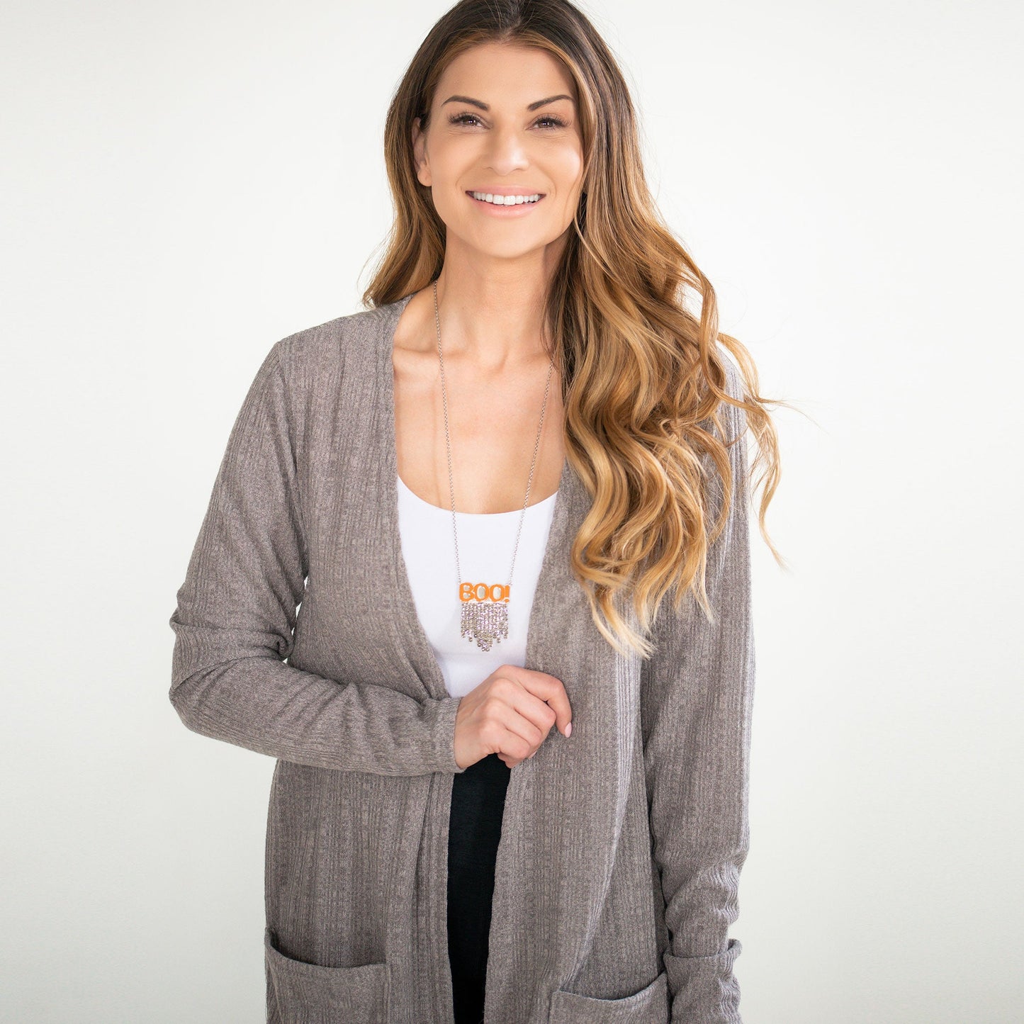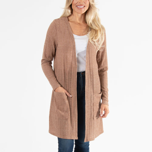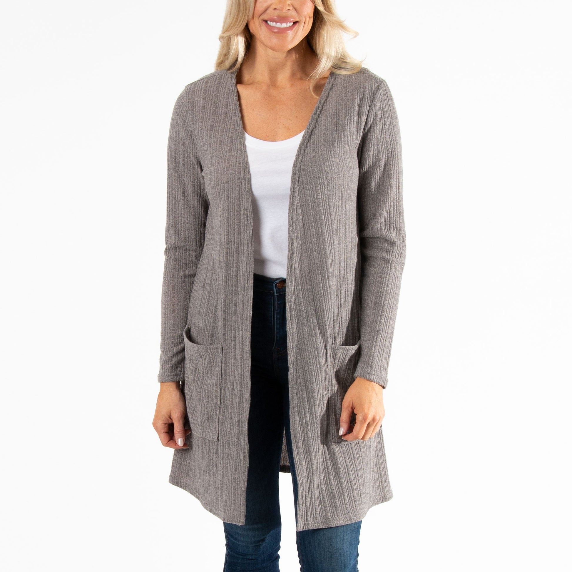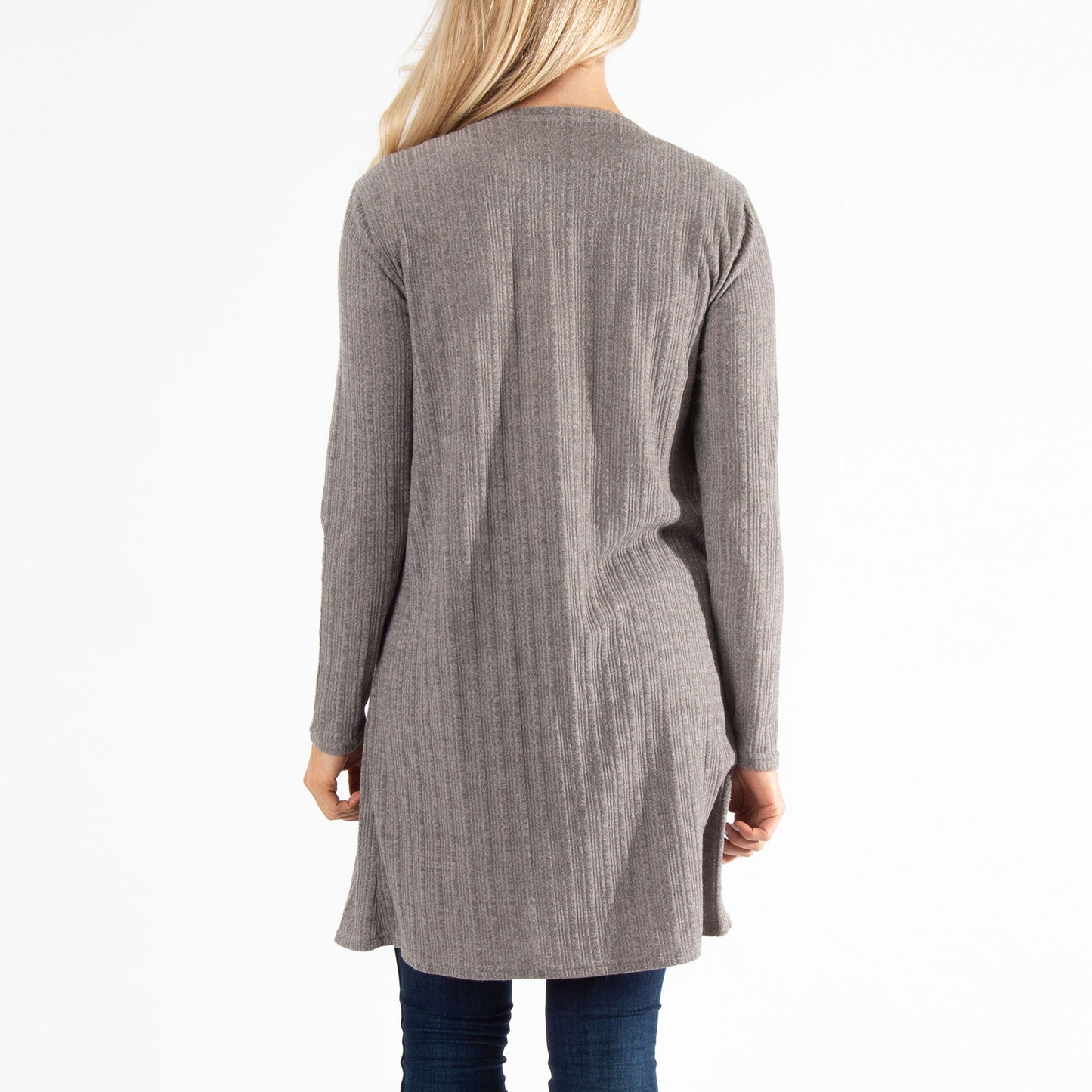 Nothing says comfort quite like the Ella Cardigan. Featuring front patch pockets, and a mid-thigh length, all in a ribbed jersey fabric, the Ella Cardigan easily adds warmth to your favorite t-shirt and jeans outfit, or to your favorite dress.
