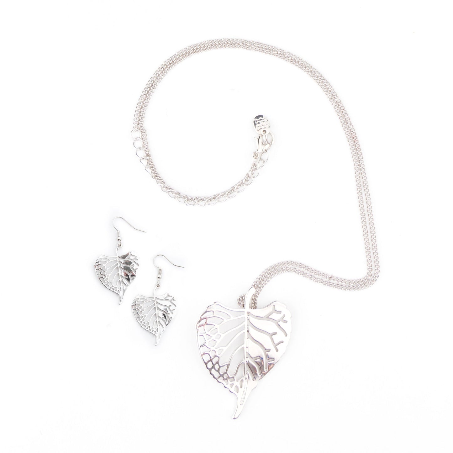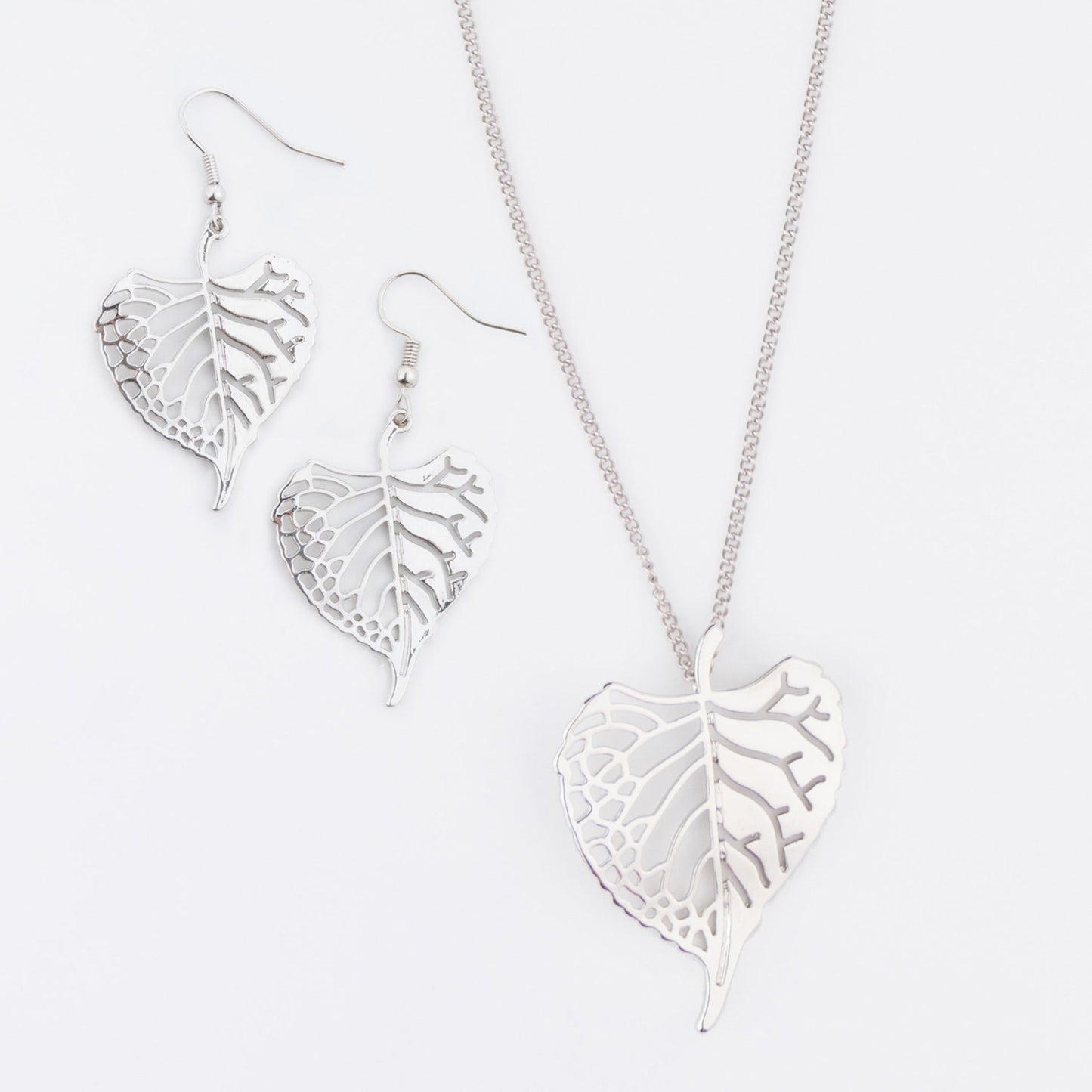 Add interest to any outfit with the Elora Poplar Leaf Pendant Necklace & Earring Set. Featuring a delicate silver chain with intricate silver poplar leaf pendant and matching earrings, this set is bound to become a favorite.
