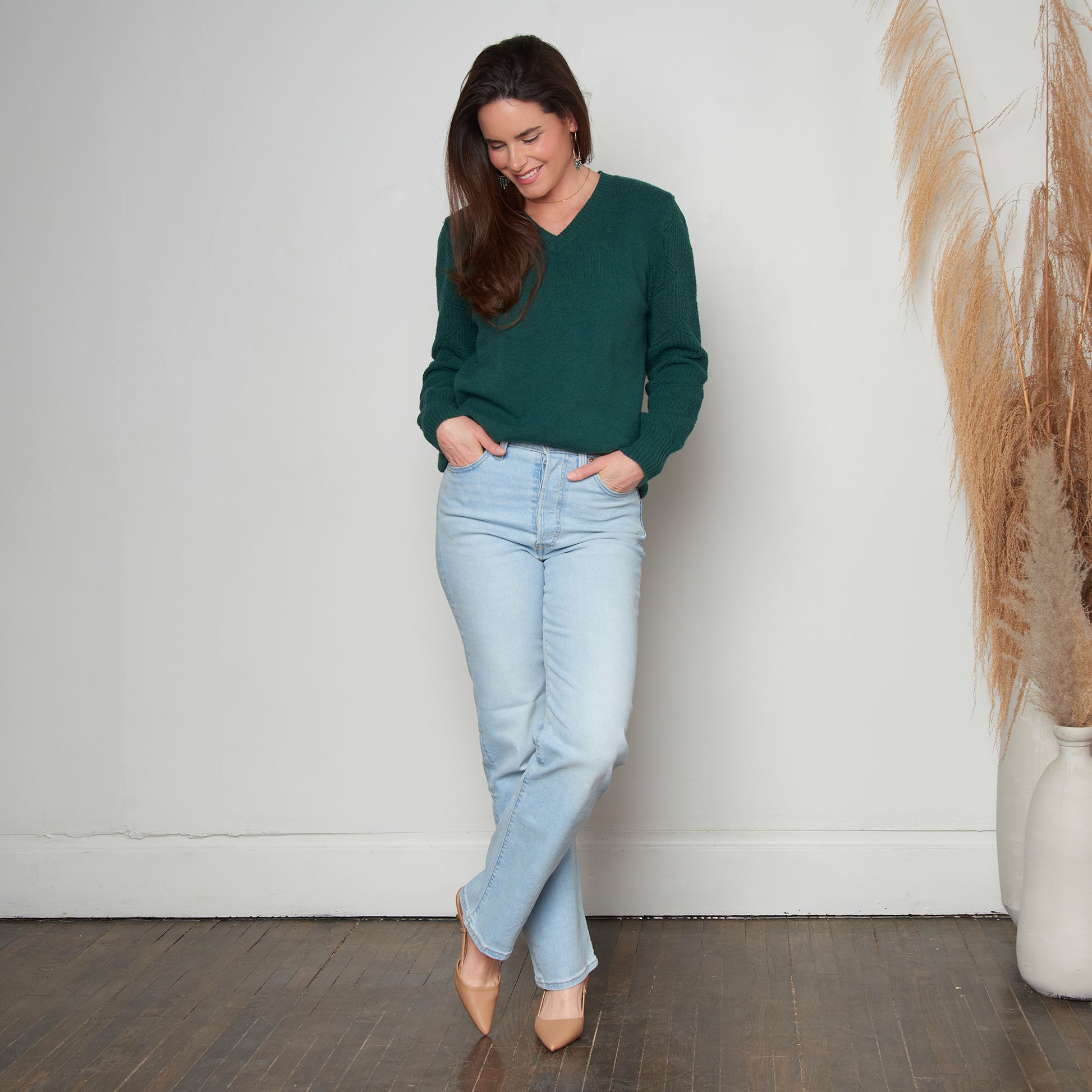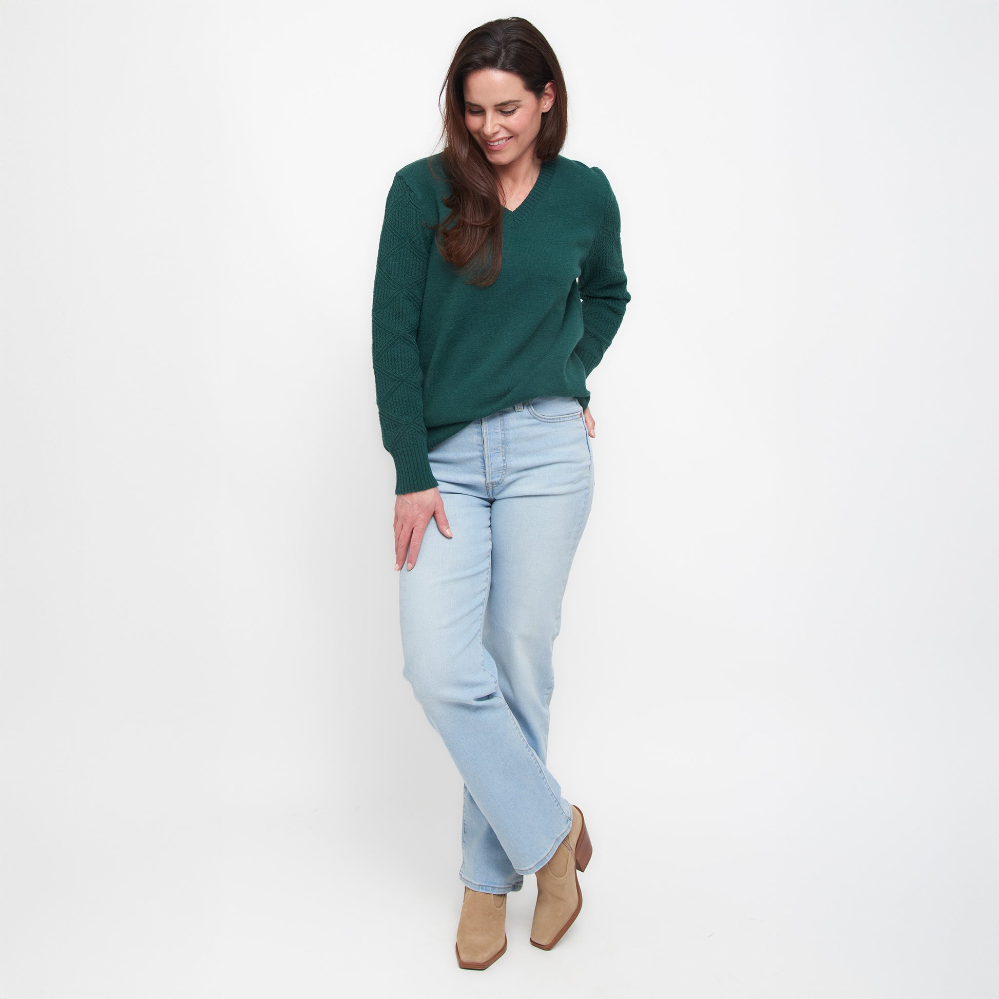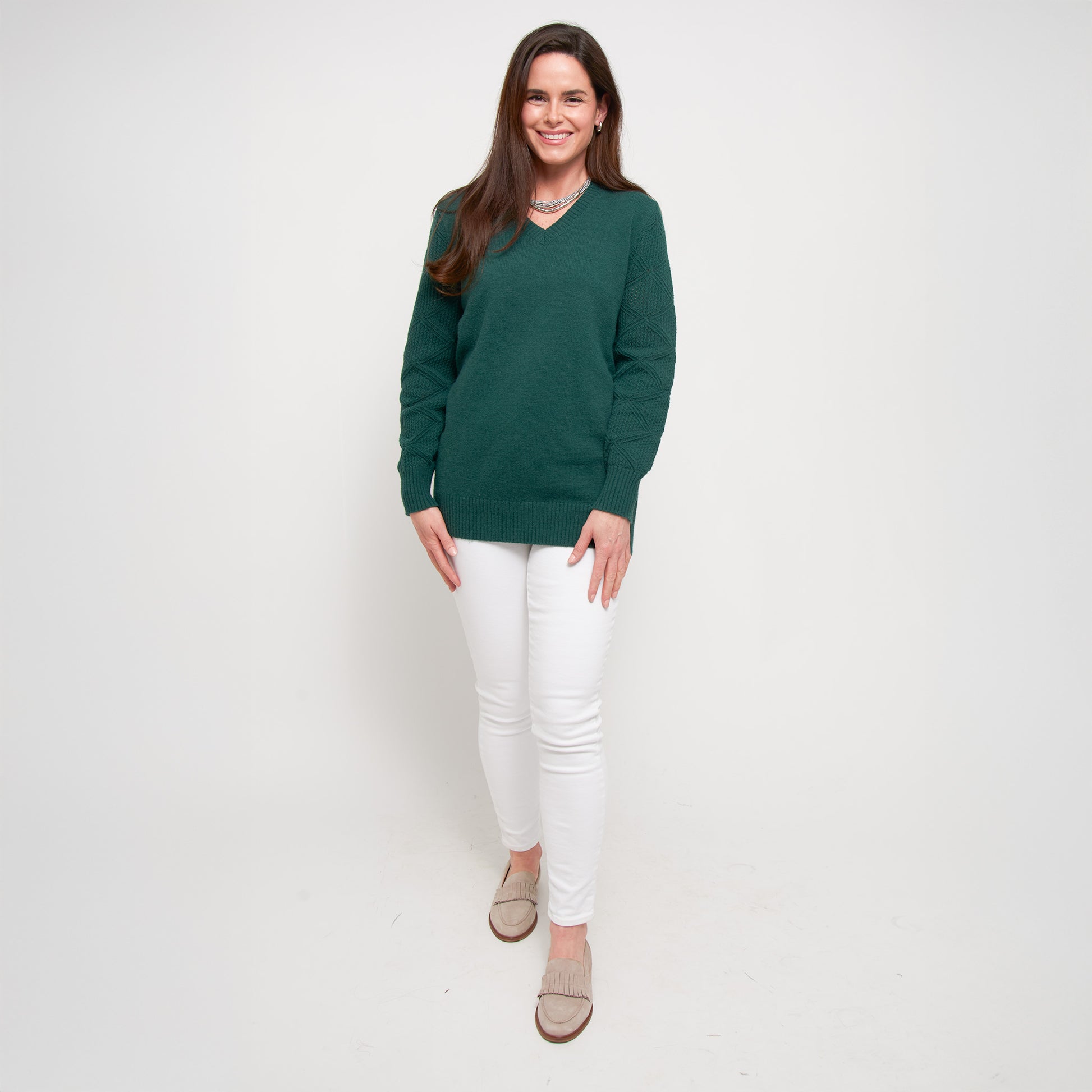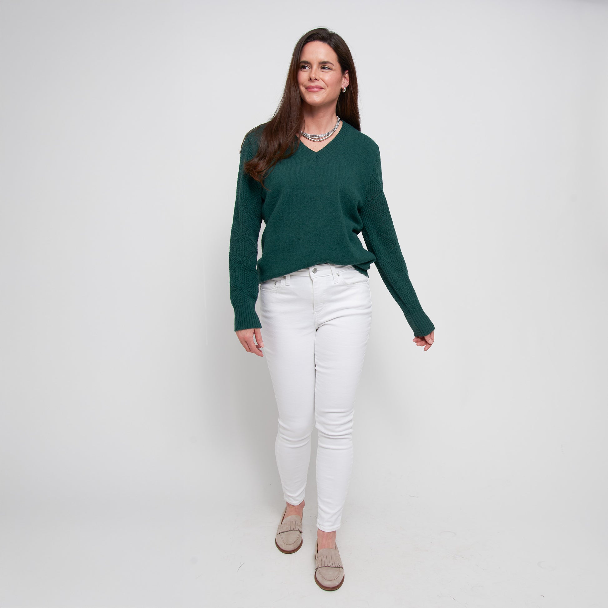 Stay cozy and stylish with the Emery Crochet Sleeve Sweater. Featuring a slight V-neck and adorable diamond crochet sleeves, this sweater is an absolute fall and winter staple.