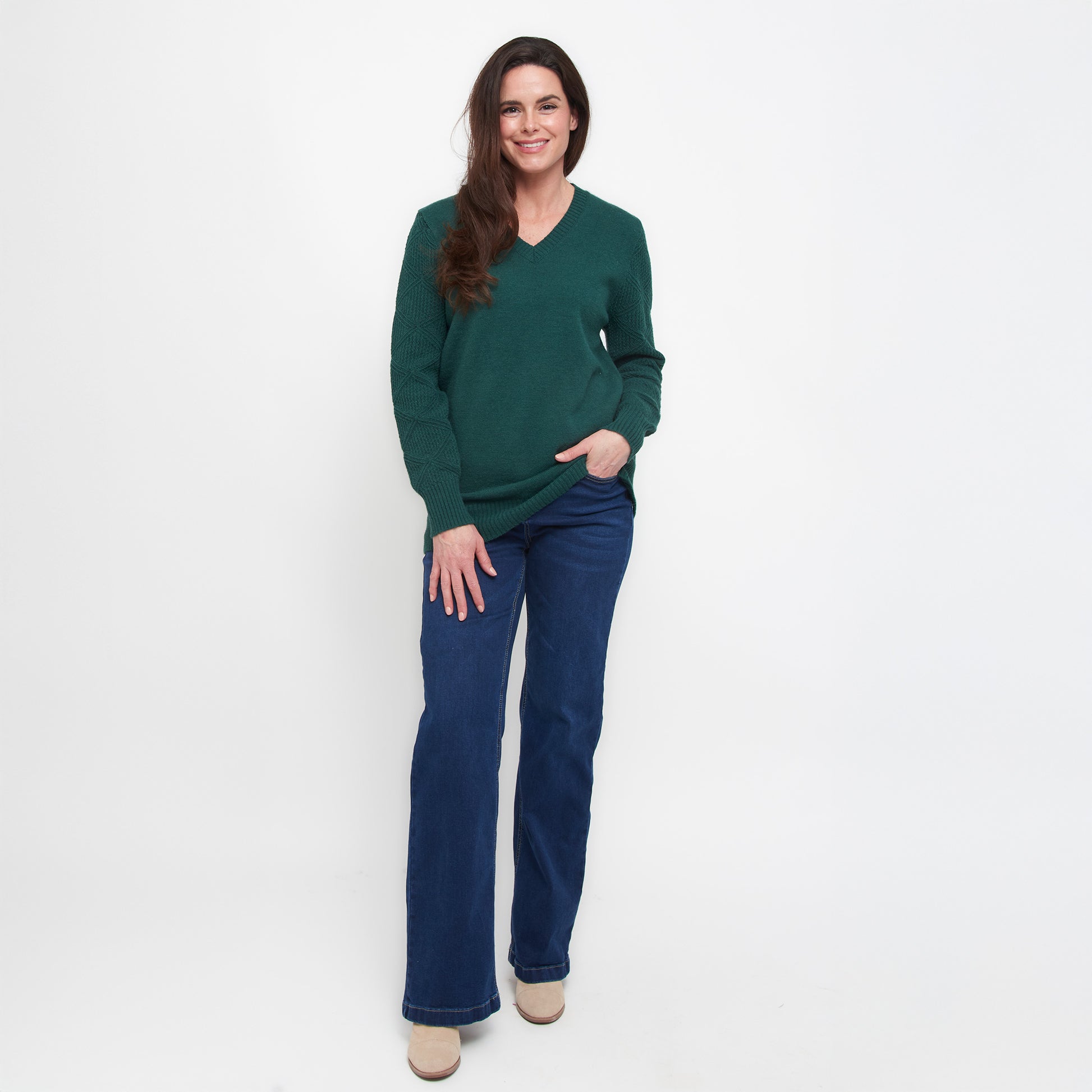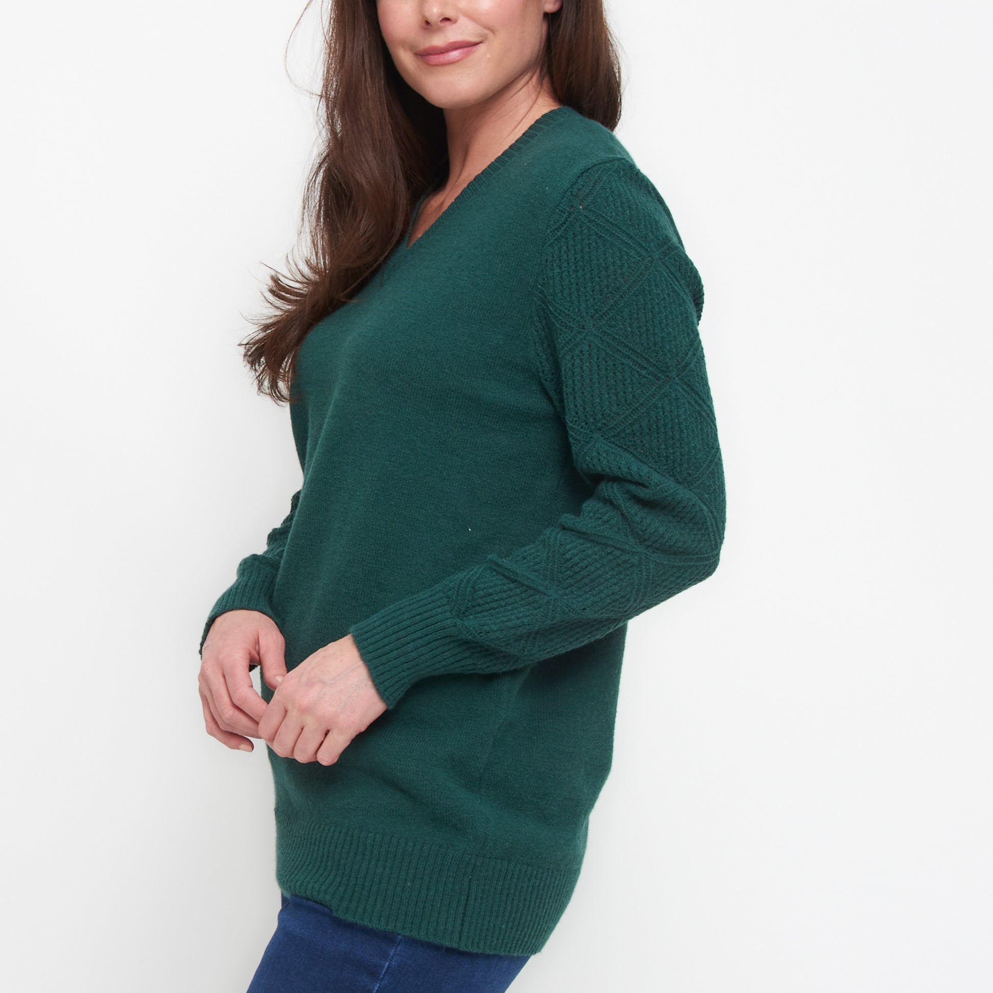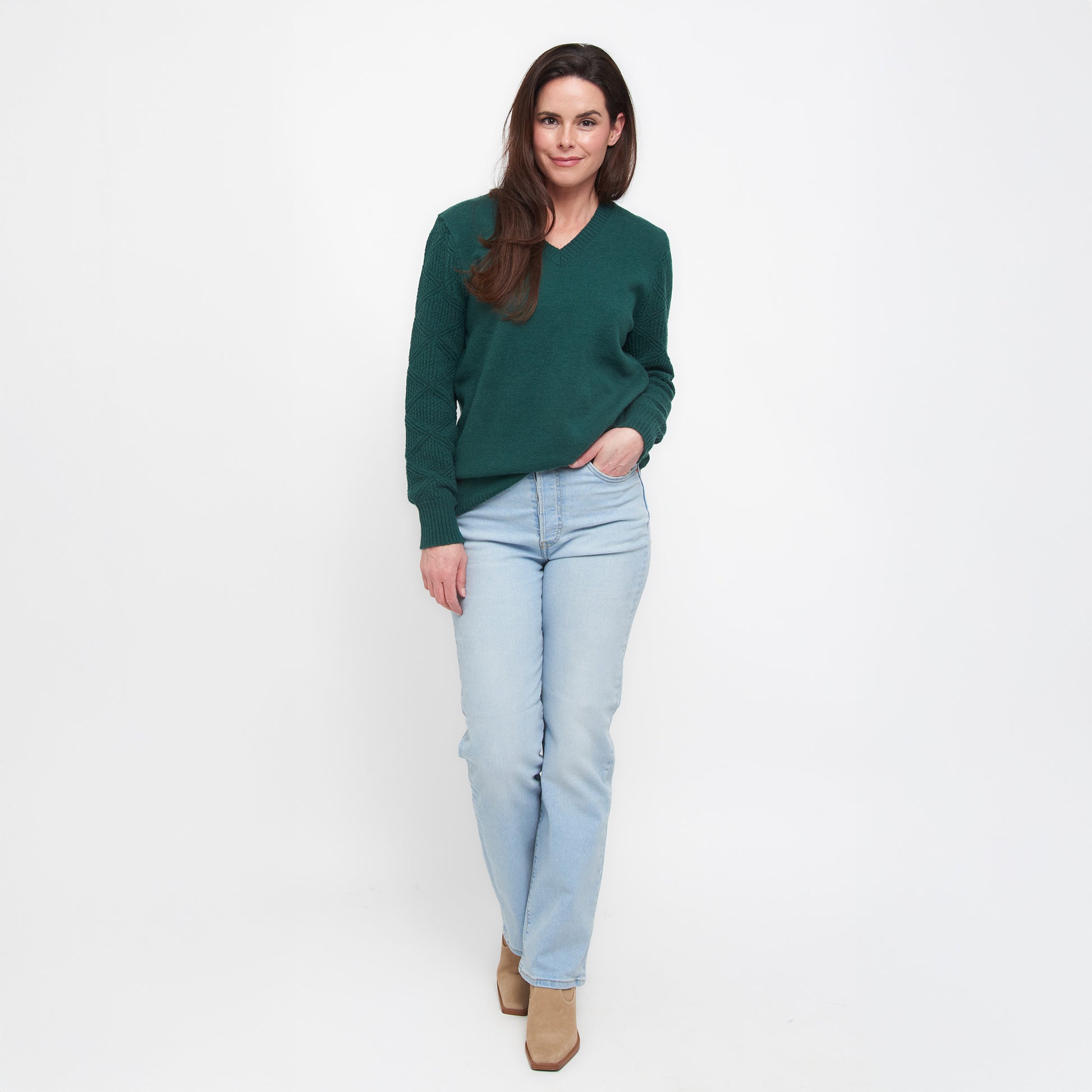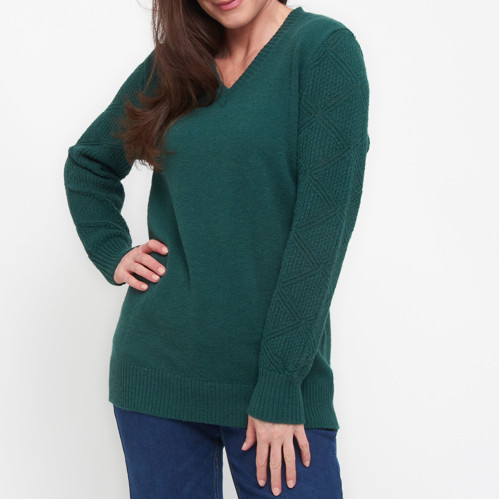 Stay cozy and stylish with the Emery Crochet Sleeve Sweater. Featuring a slight V-neck and adorable diamond crochet sleeves, this sweater is an absolute fall and winter staple.
