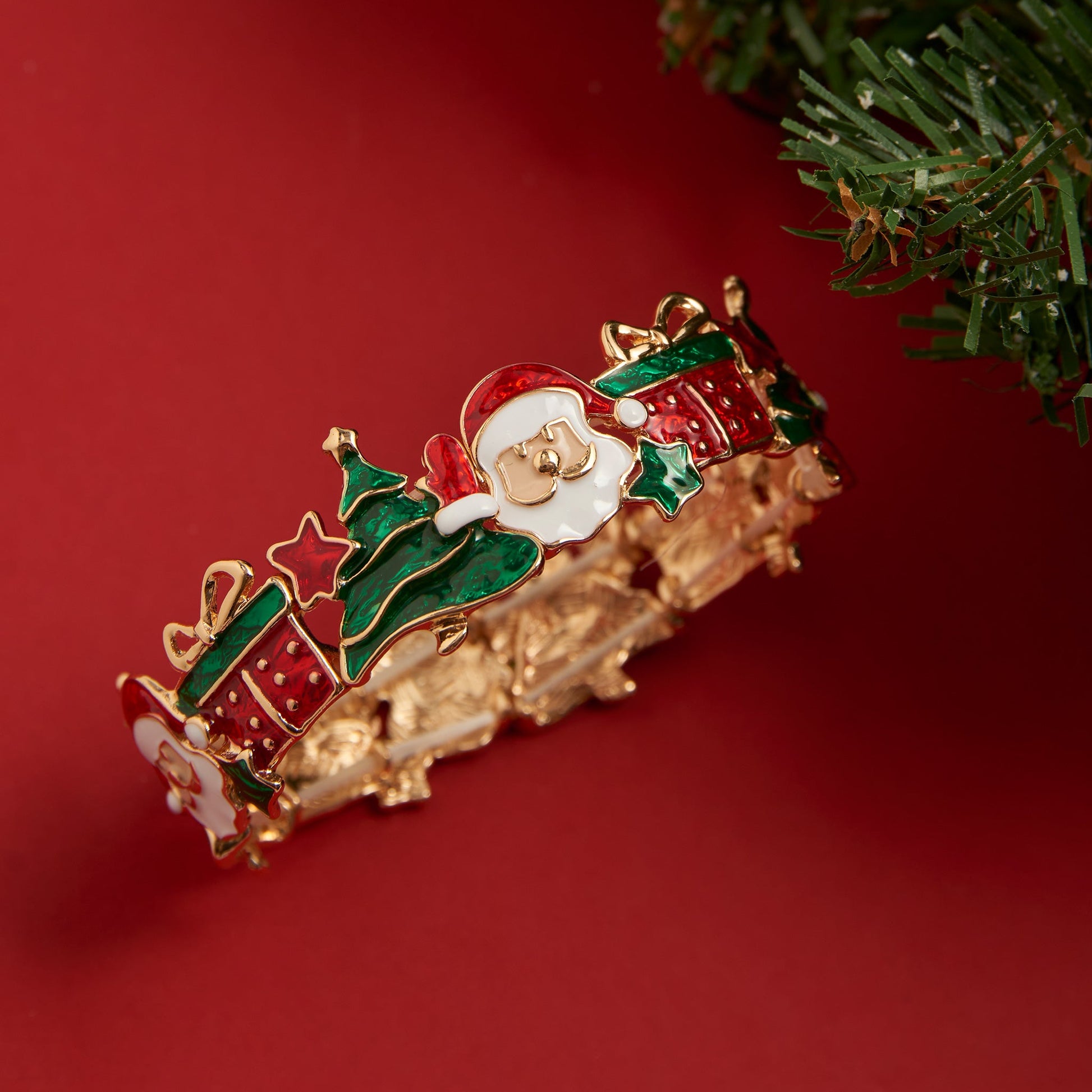 Stay festive and fun this holiday season with the perfect holiday accessory! Featuring adorable Santas, cute Christmas trees, and gifts all along a stretchy band, this bracelet adds cheery flair to any look.