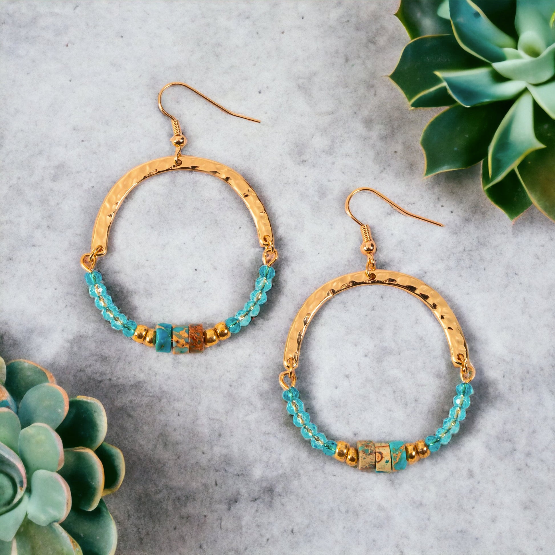 Add a bit of color to your wardrobe with the Ashli Beaded Round Earrings. Featuring tones of aqua and genuine stones in a gorgeous hoop shape with fish hook backing, these earrings bring both style and interest to any outfit.