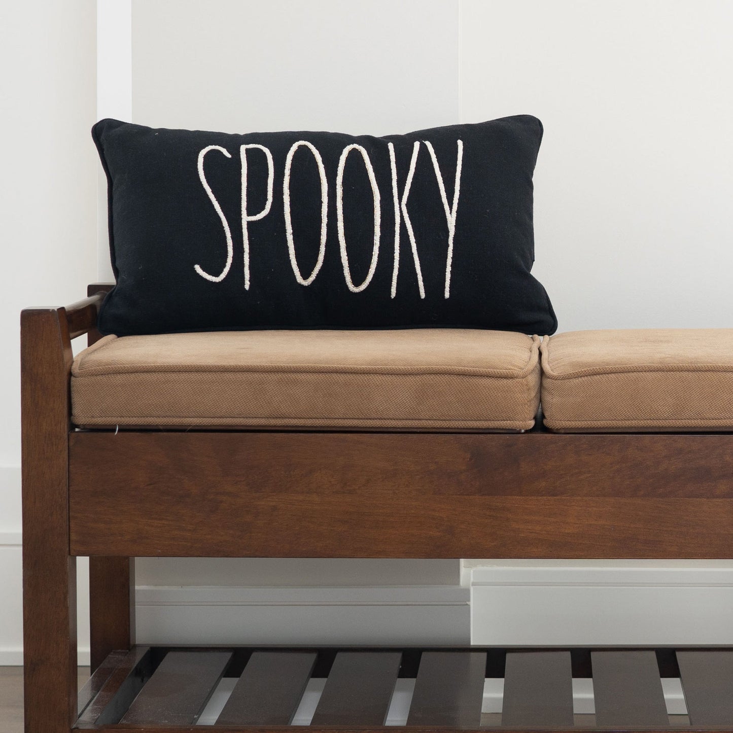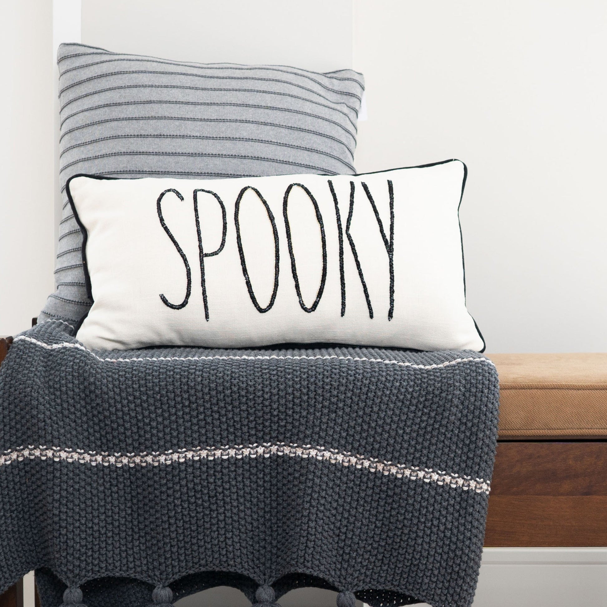 Add a bit of holiday fun to your home with the 12x22 Spooky Beaded Lumbar Pillow. Featuring 'Spooky' written in cute, spindly lettering with beads, this double-sided pillow is black on one side, and cream on the other - making it the perfect addition to your Halloween décor.
