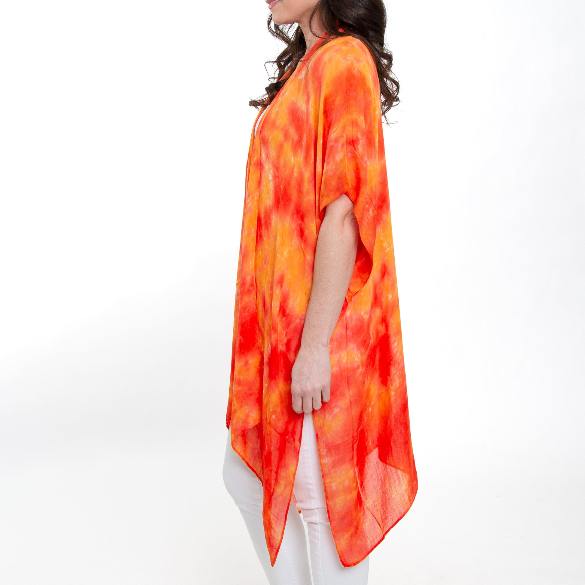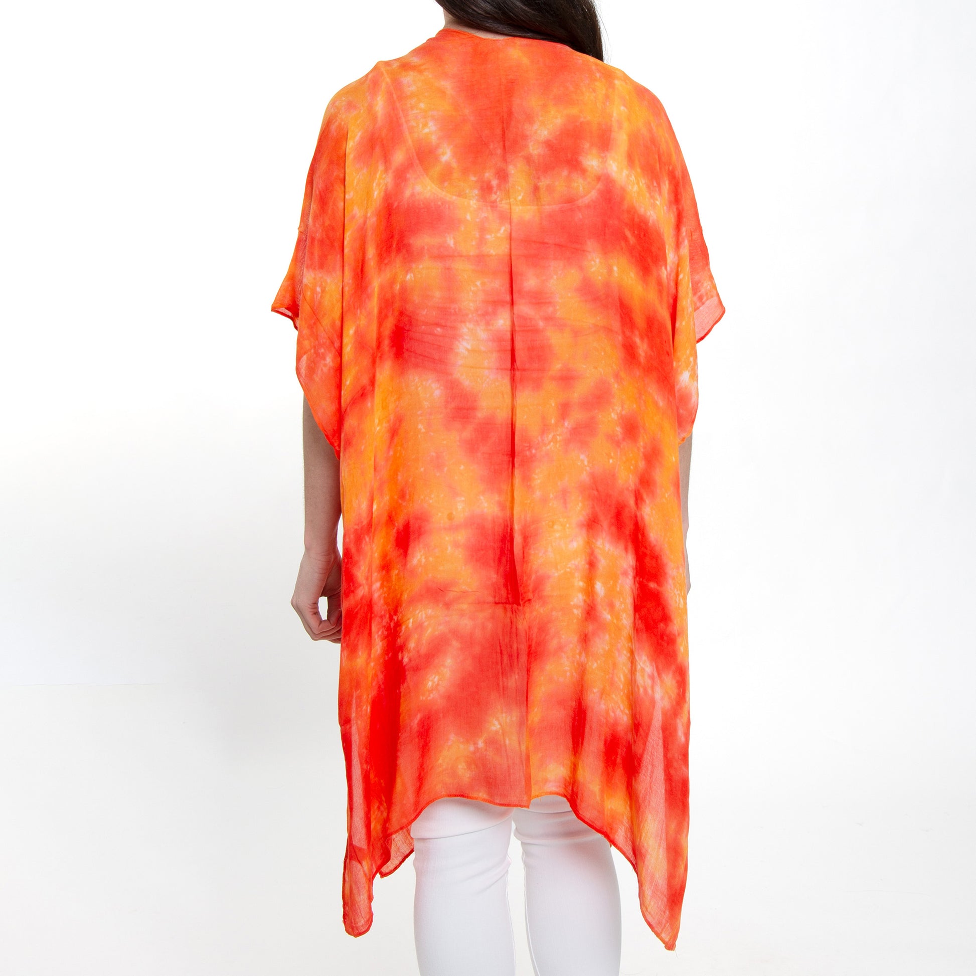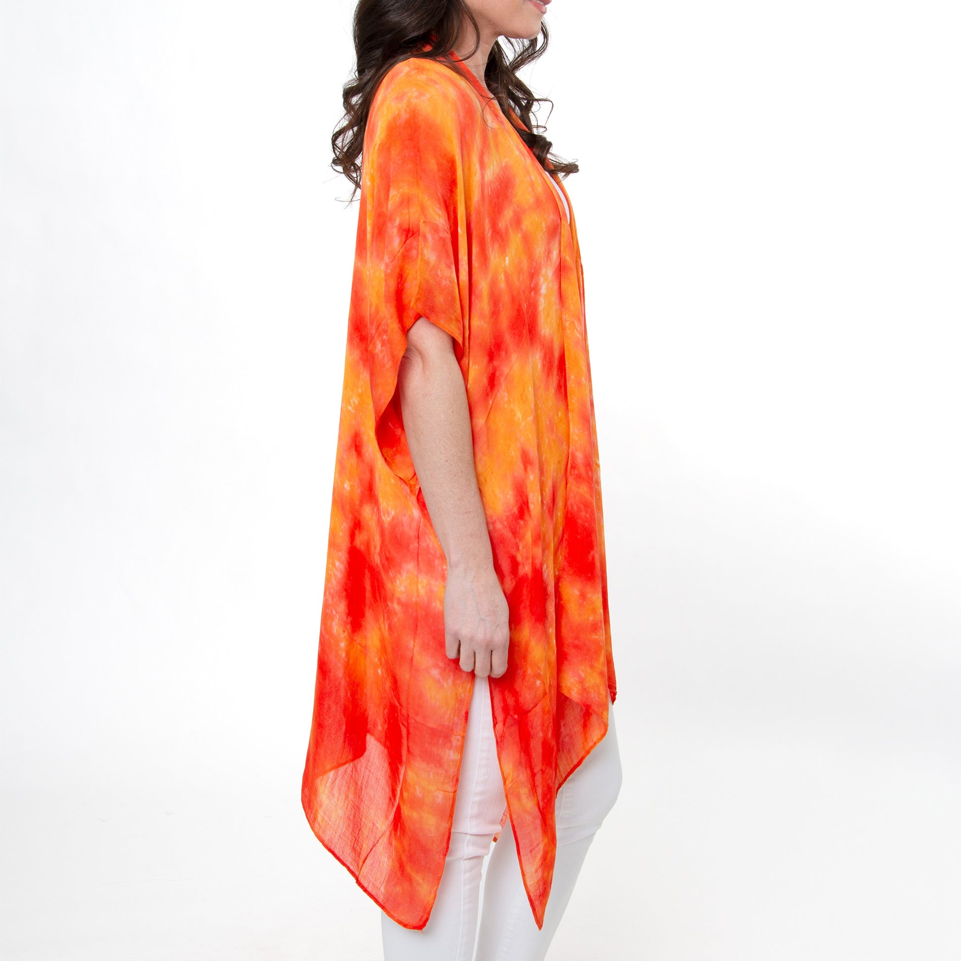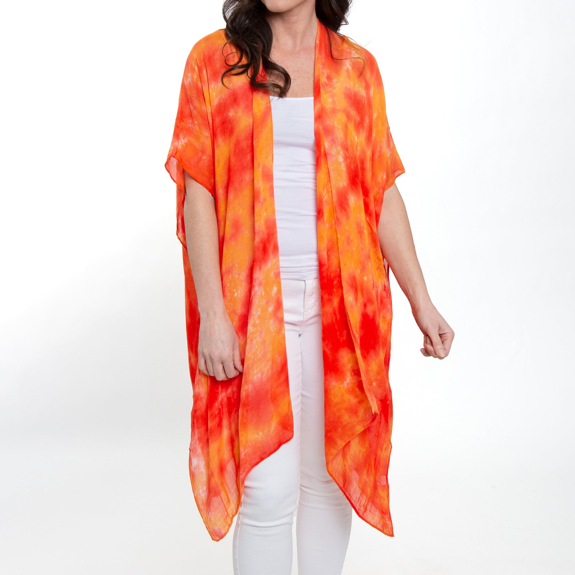 Stylish and oh-so versatile! The Kylah Lightweight Ruana is a one size wonder that features a waterfall style hem and bright orange toned tie dye print, all in a flowy lightweight gauze fabric. Perfect for covering up a swimsuit, or over your favorite outfit for going out on the town.
