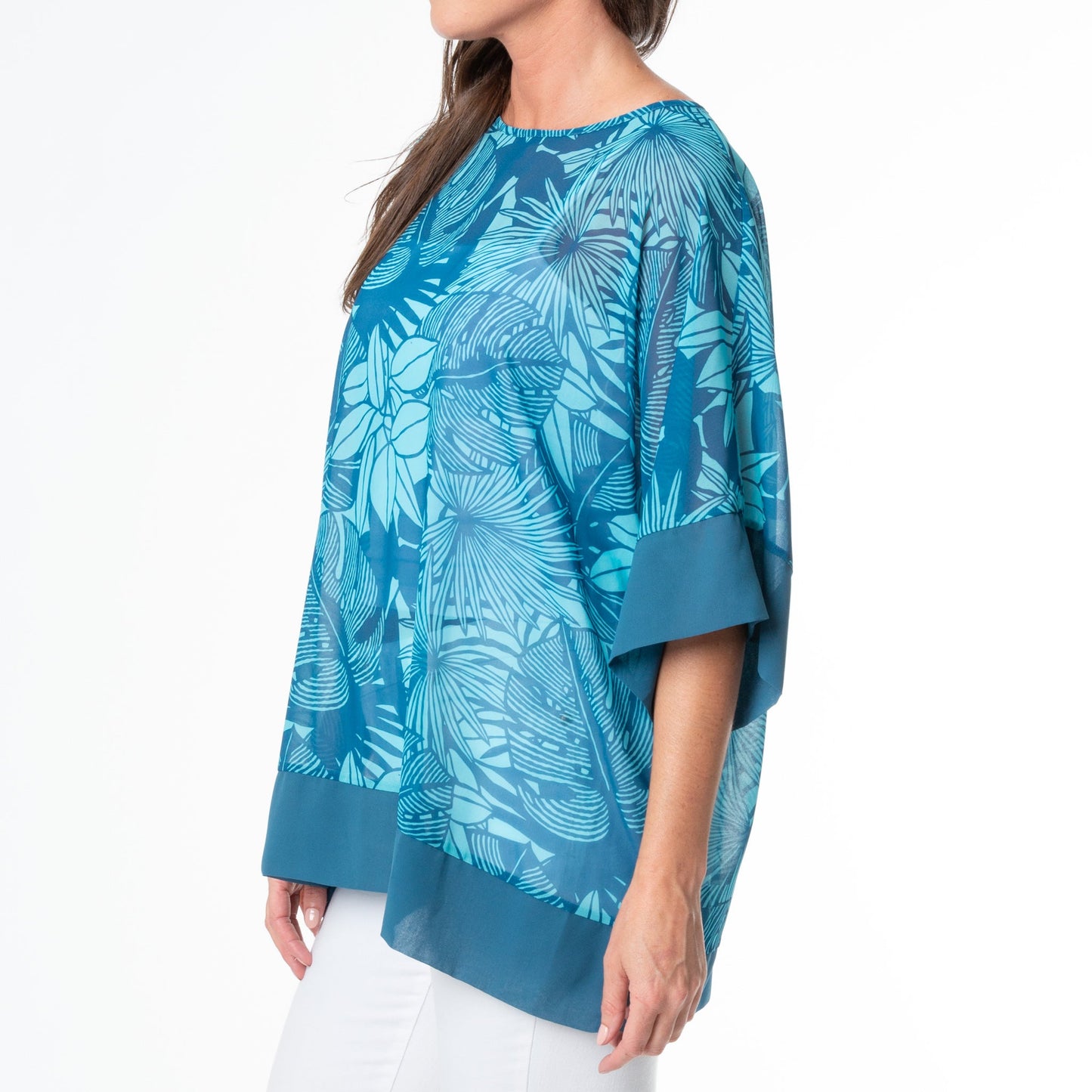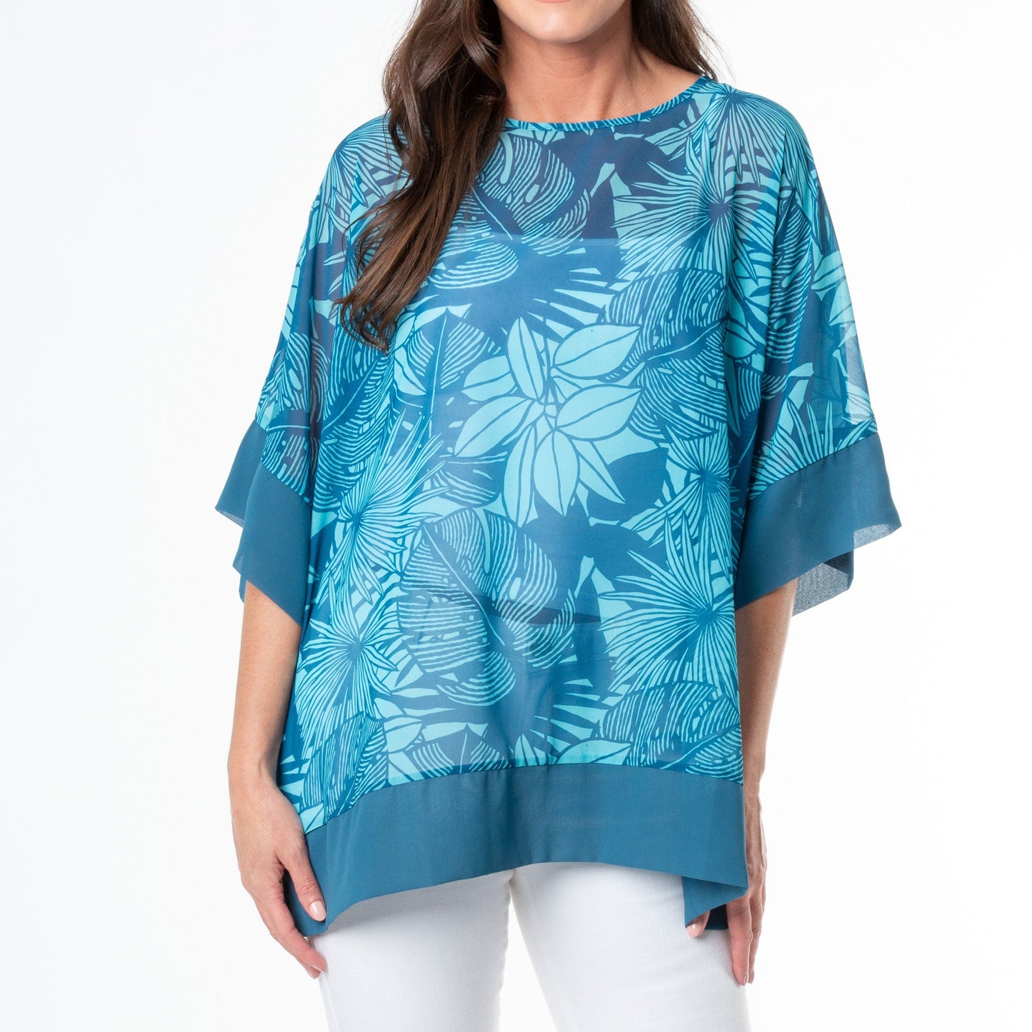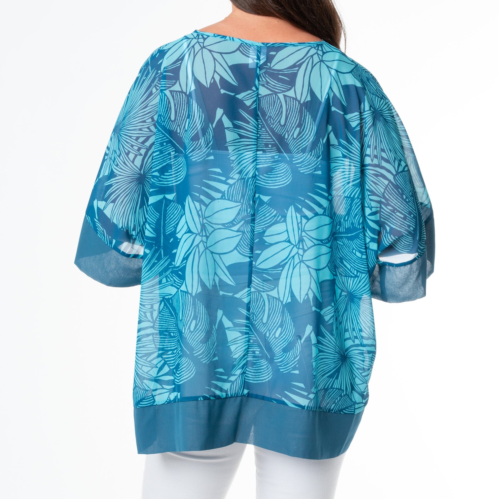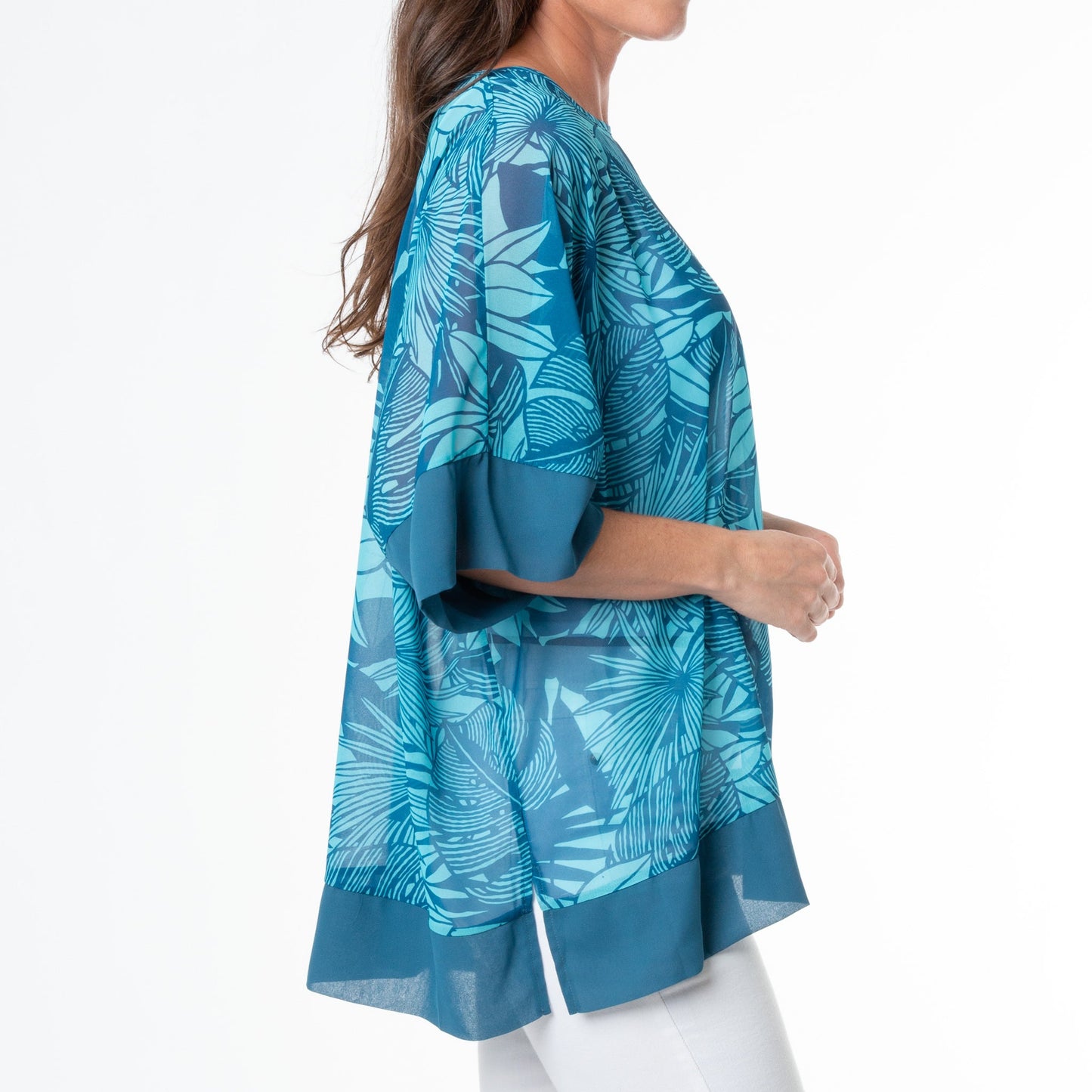 Stylish and versatile! The Lexi Sheer Poncho is a one size wonder in a cooling sheer chiffon featuring a stunning blue tropical print. Its poncho cut makes it easy to slip over any swimsuit, or pair with a tank and your favorite pair of pants. The perfect going out accessory!