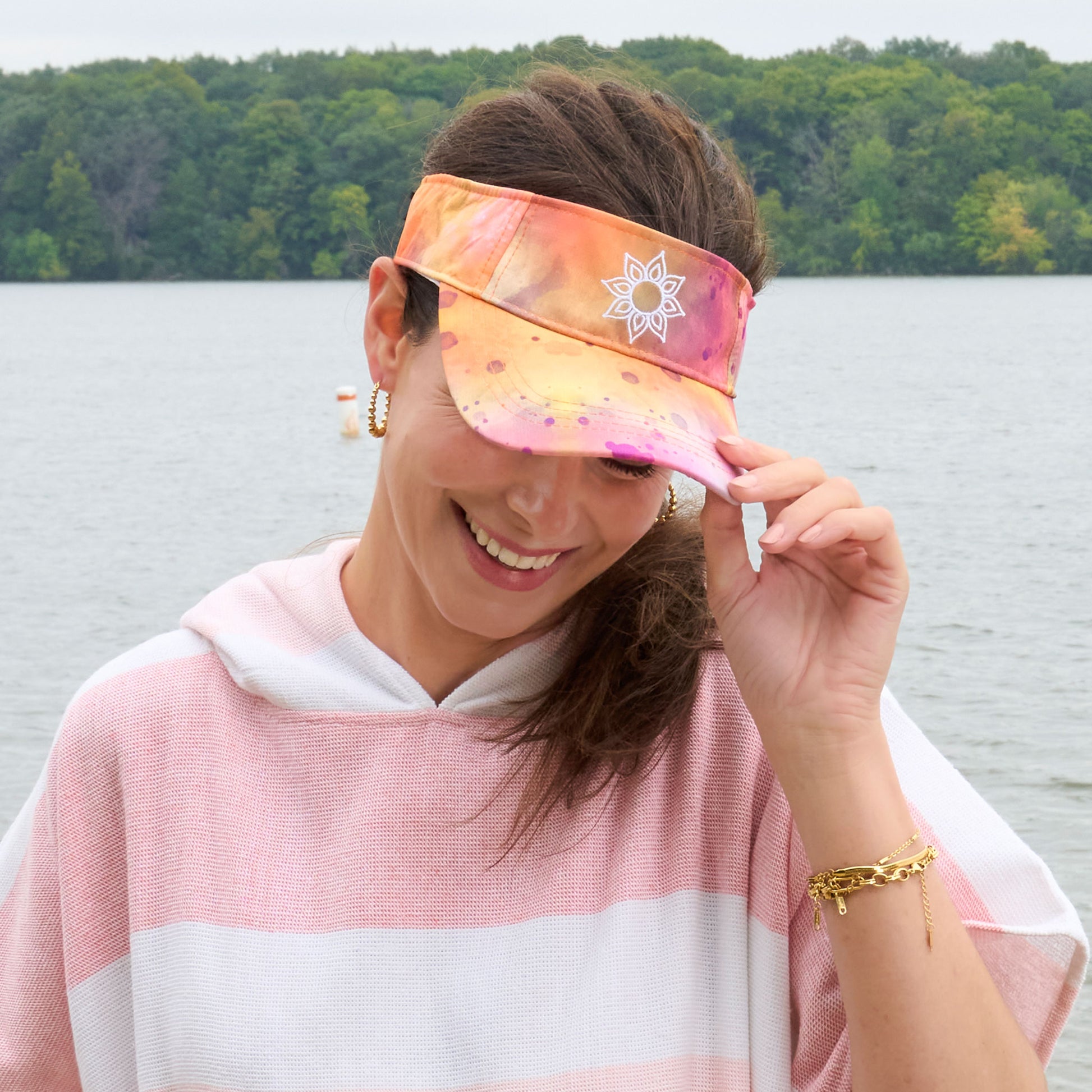 Keep the sun out of your eyes in style with the Taryn Visor. Featuring stunning sunset tie dye tones with a mandala embroidered on the front, this visor is the perfect addition to your beach bag, golf bag, travel bag, and more!
