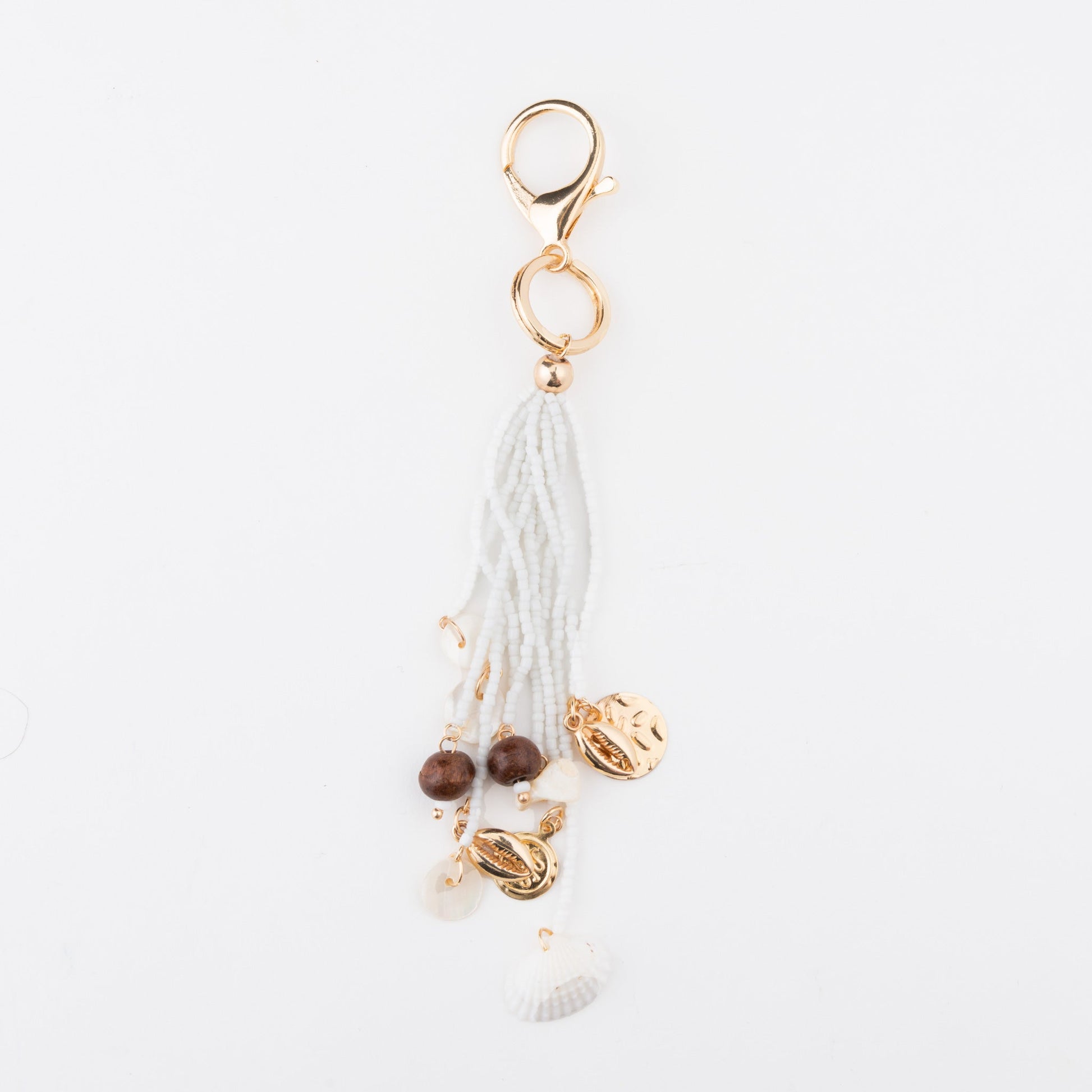 Never lose your keys again with the Belen Beaded Shell Key Chain. Featuring a gold clasp with cute beads and shell charms dangling from an array of beaded strands, this keychain makes for the perfect accessory.